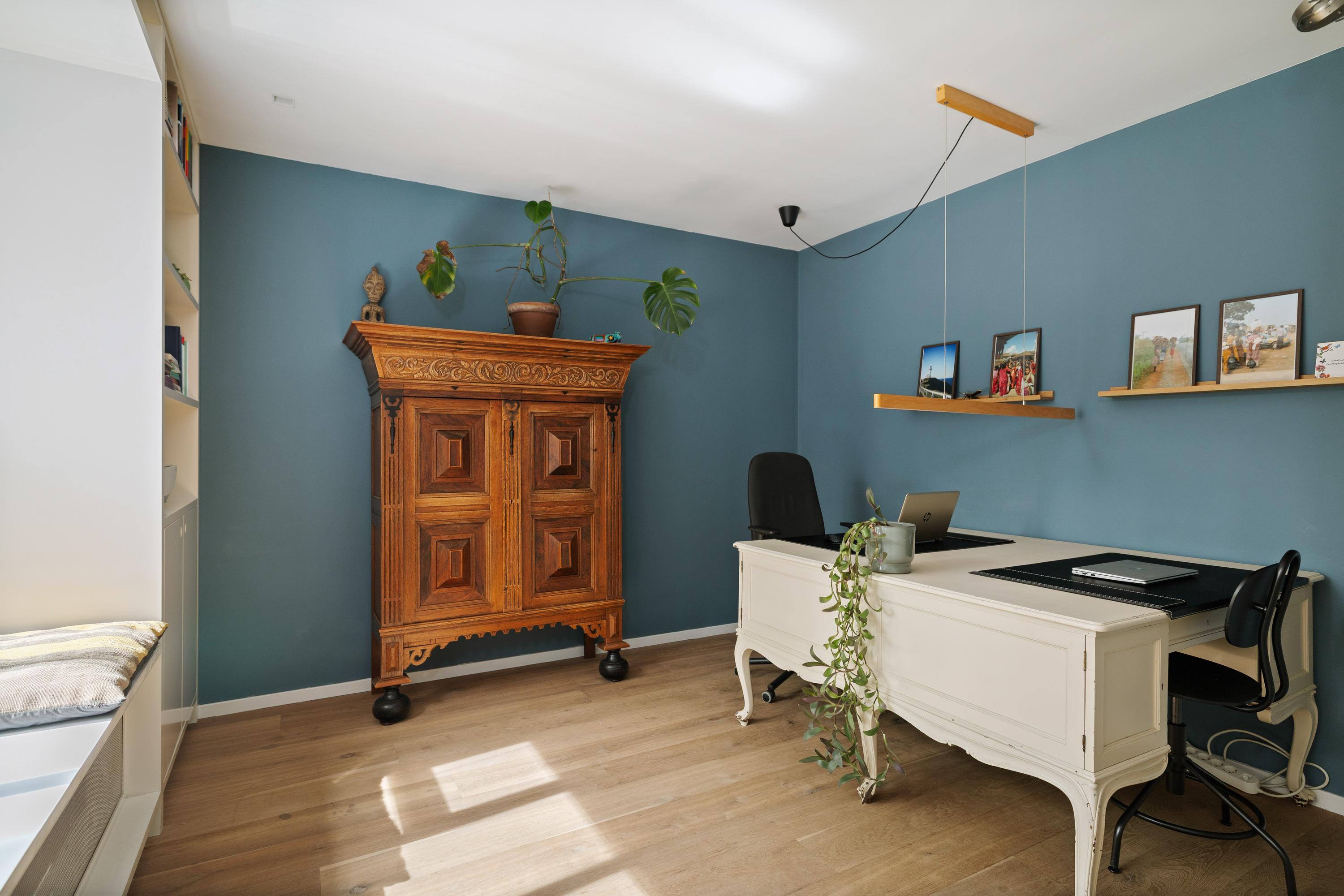 The main entrance is bright and airy, featuring a beautiful natural stone tiled floor. Immediately to the right is the elegant staircase to the upper floors, the guest toilet with washbasin, and access to the utility room with open shelving and connections for the washing machine and dryer. From the central hallway there is access to the living room and a generous study or guest room of approximately 20 m², complete with its own pantry, built-in cupboards and a lovely view of the garden. Originally designed as a large bedroom and fitted with connections for a second bathroom, this space offers great flexibility and numerous layout possibilities to suit different living requirements.