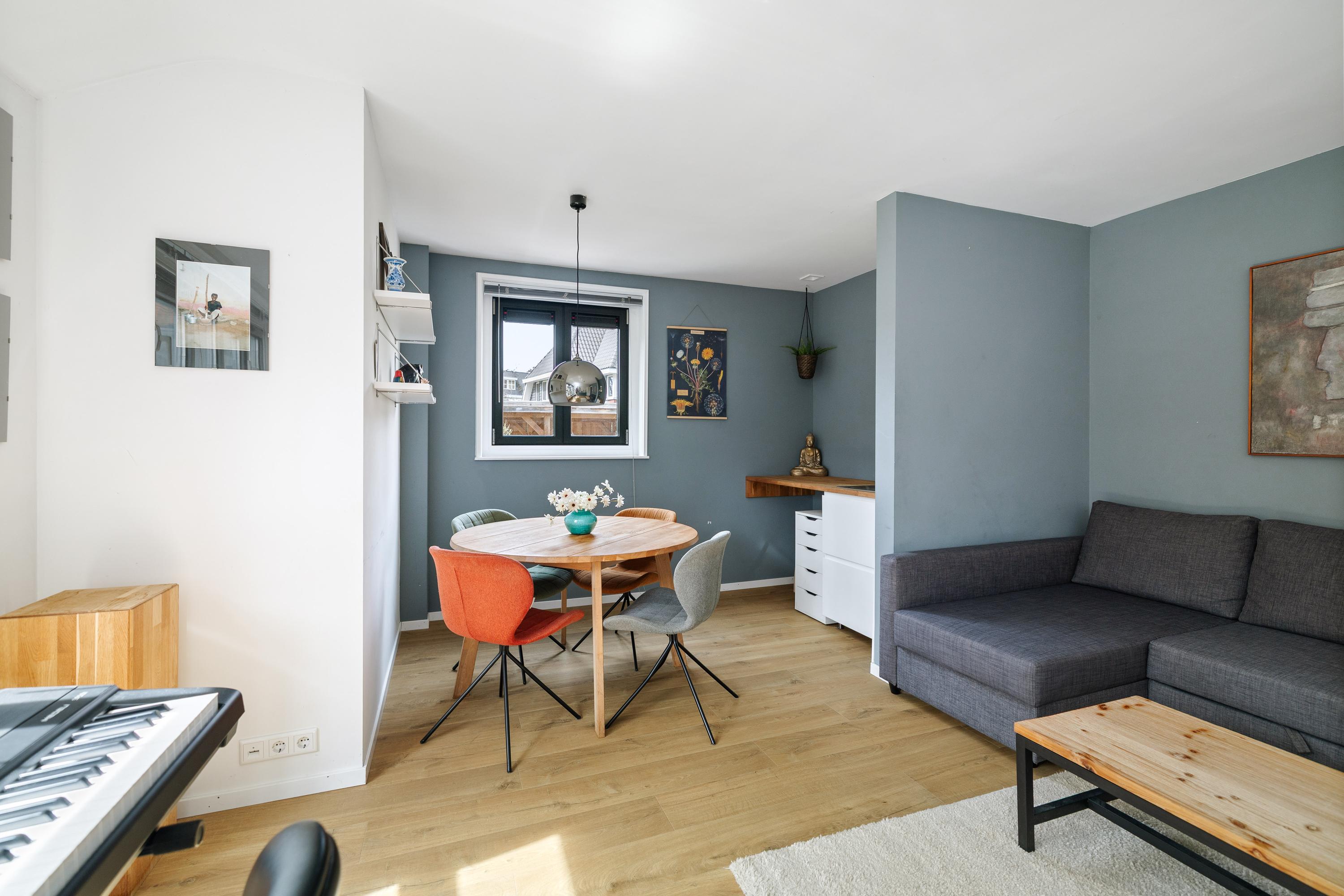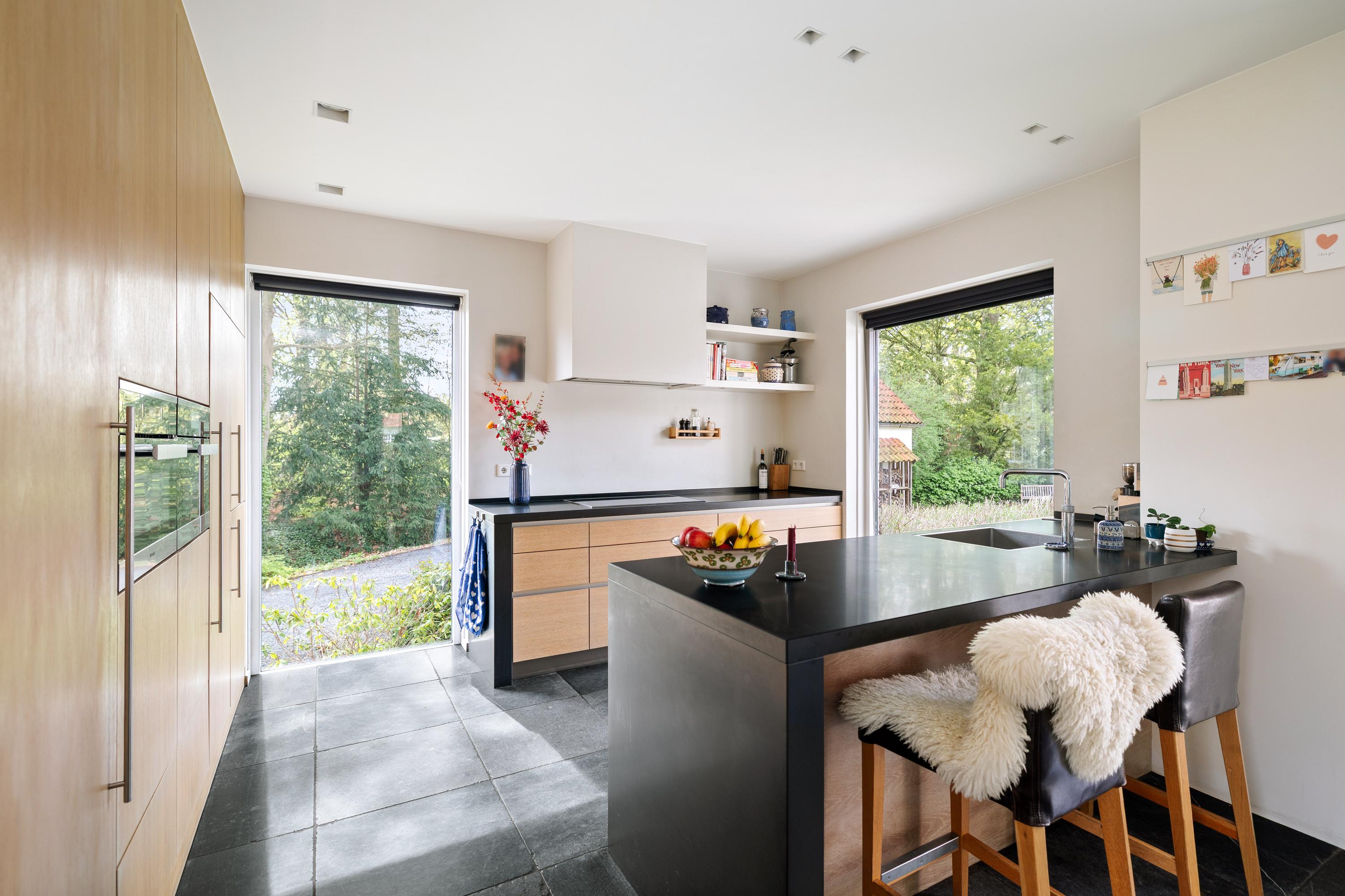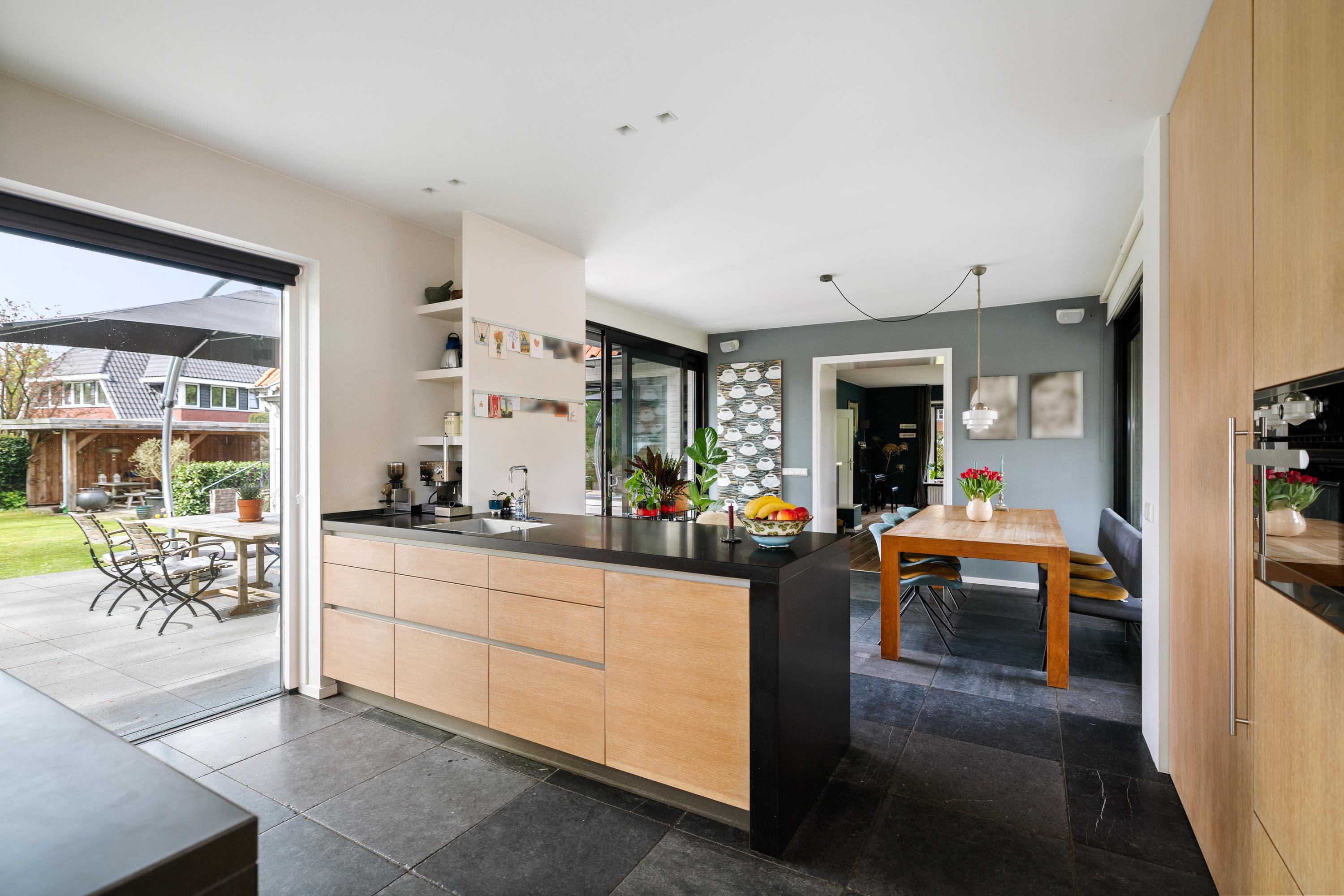 The sunny kitchen-diner (by Hans Croes Keukens en Interieurwerken) is located in the recent extension, designed by architect Ed Bergers (BVAB Architecten). Sleek, contemporary and filled with natural light, the kitchen features classic natural stone floor tiles with underfloor heating, creating a chic contrast with the oak cabinetry and light-coloured walls. The kitchen includes a central island with an anthracite composite worktop, a boiling-water tap, dishwasher and ample storage. Two bar stools make it an inviting place for a drink while cooking. The appliance wall contains a steam-assisted oven and combi microwave (both Miele), a large fridge and freezer, along with extensive cupboard space. Behind the kitchen is the second entrance, the so-called “back entrance”, with a hallway and four tall built-in cupboards.