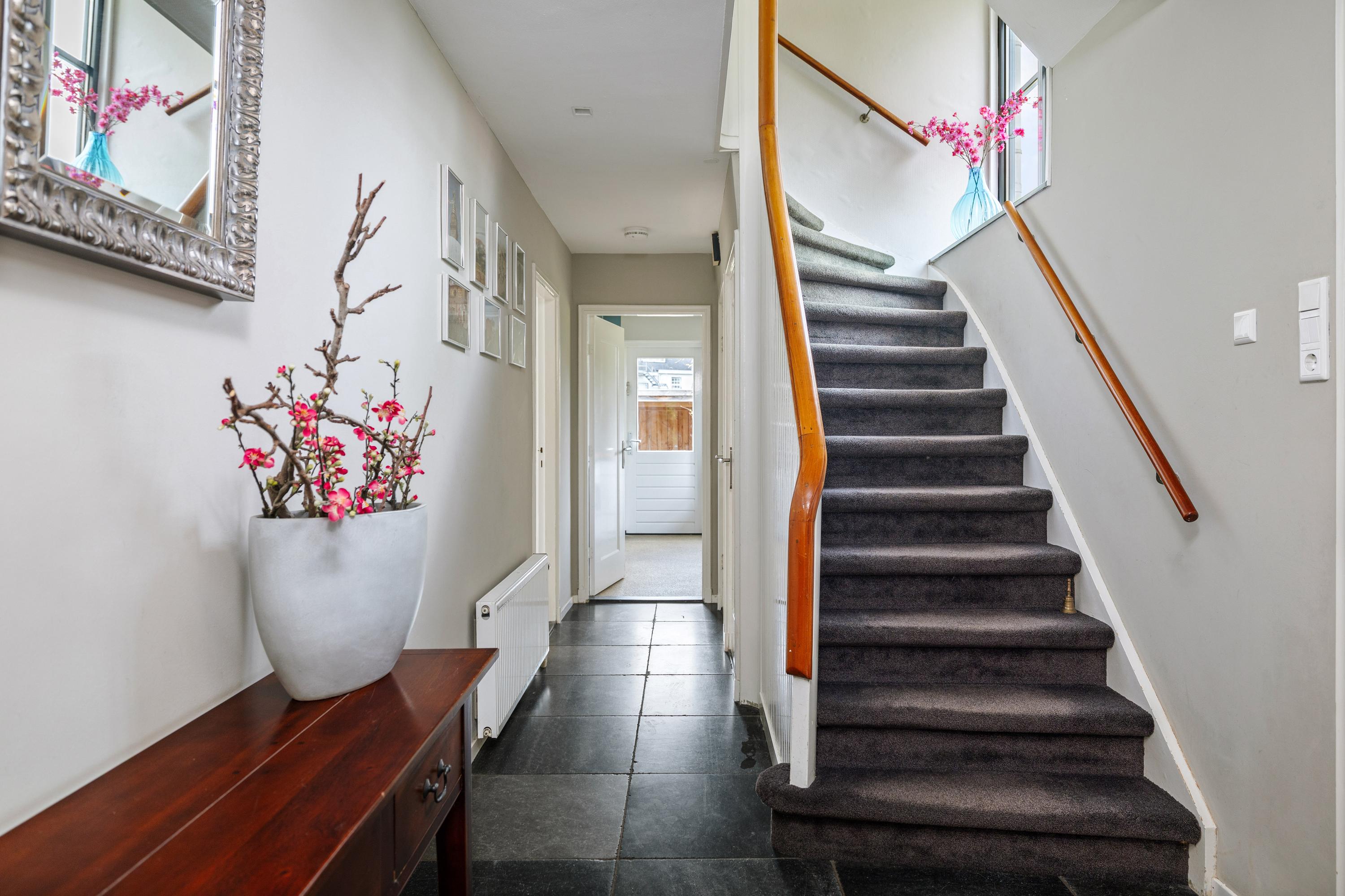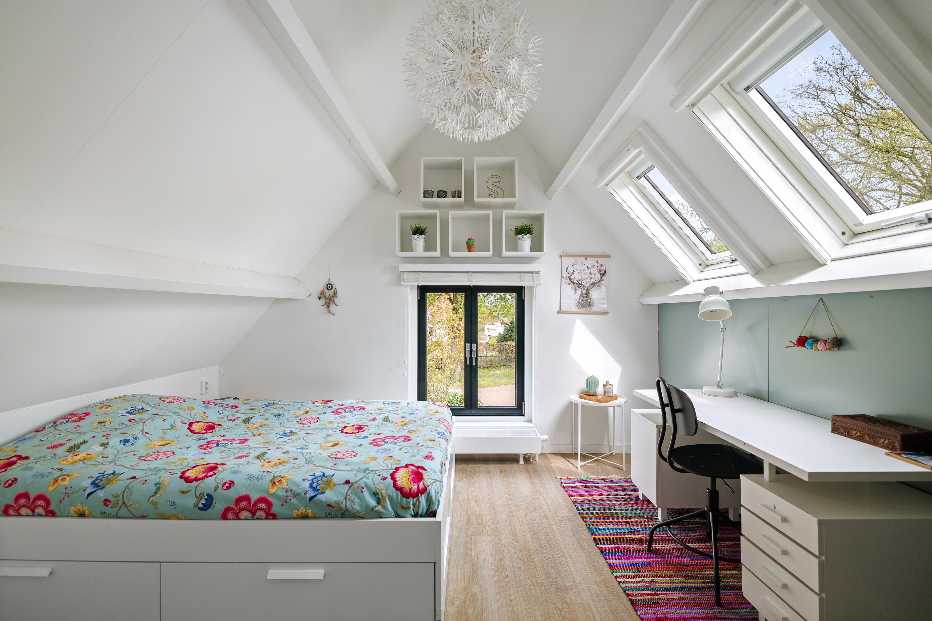 Space is in abundance, as the property sits on a generous plot of approximately 1,755 m². At the front is a charming garden with a characteristic semi-circular driveway. Beside the house stands a spacious, detached brick garage with cavity walls and an upper floor—ideal for parking a classic car, storing bicycles and accommodating a workbench. The upper level offers excellent potential for creating an artist’s studio or hobby space.