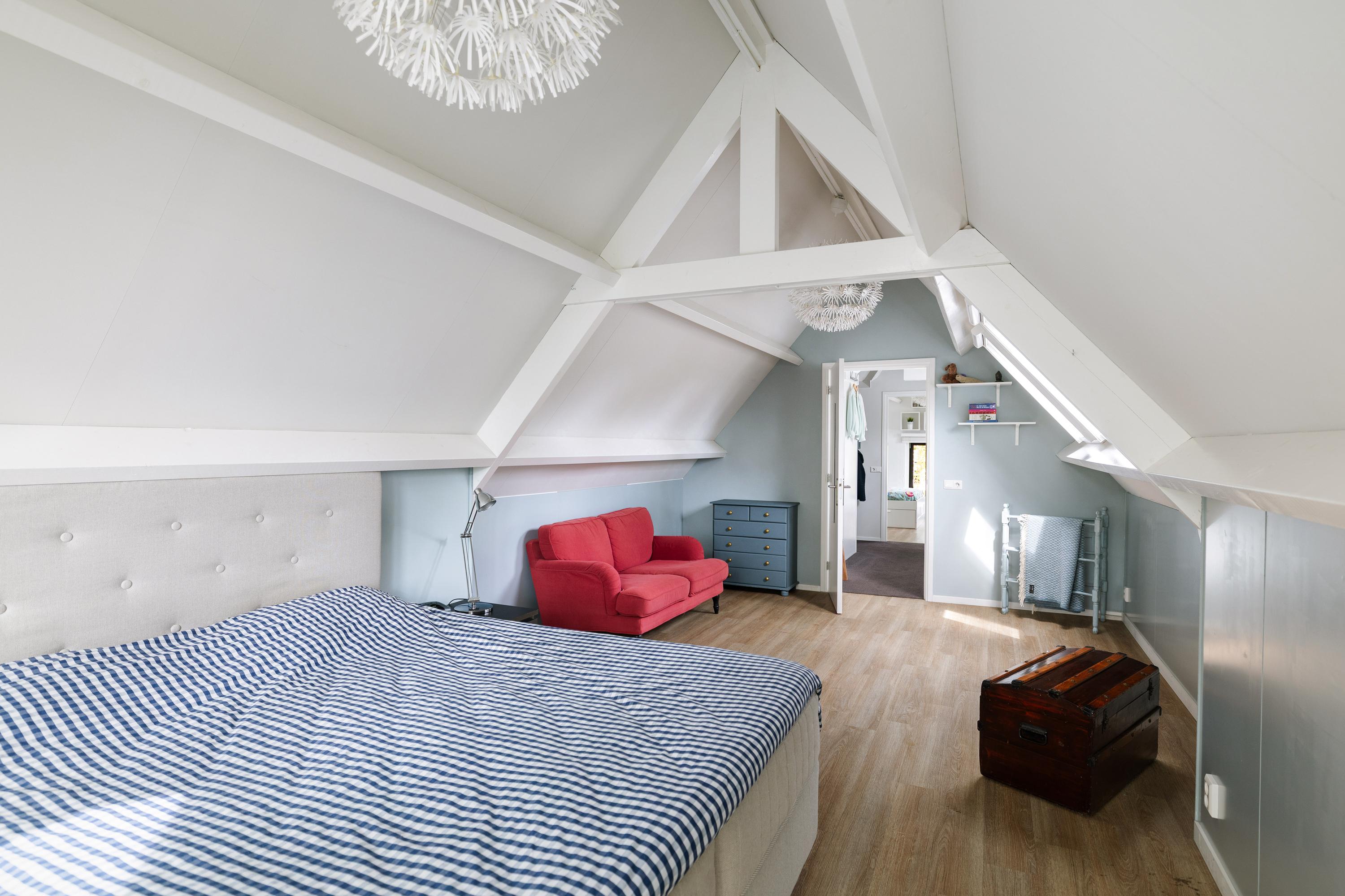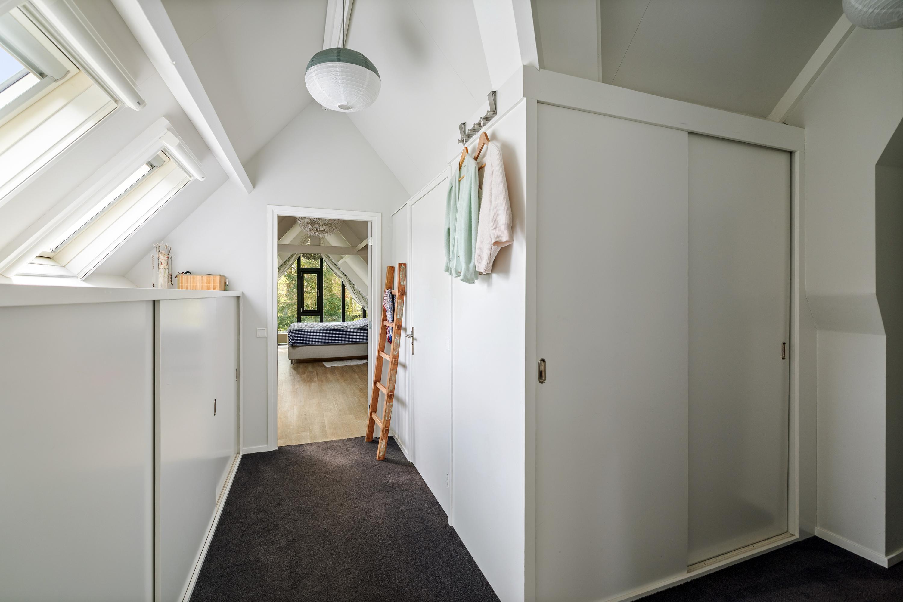 The landing offers ample storage space behind the knee walls as well as cleverly integrated built-in cupboards. The bedrooms also feature built-in storage. The main bedroom boasts a striking, fully glass wall, offering a spectacular view of the surrounding greenery.