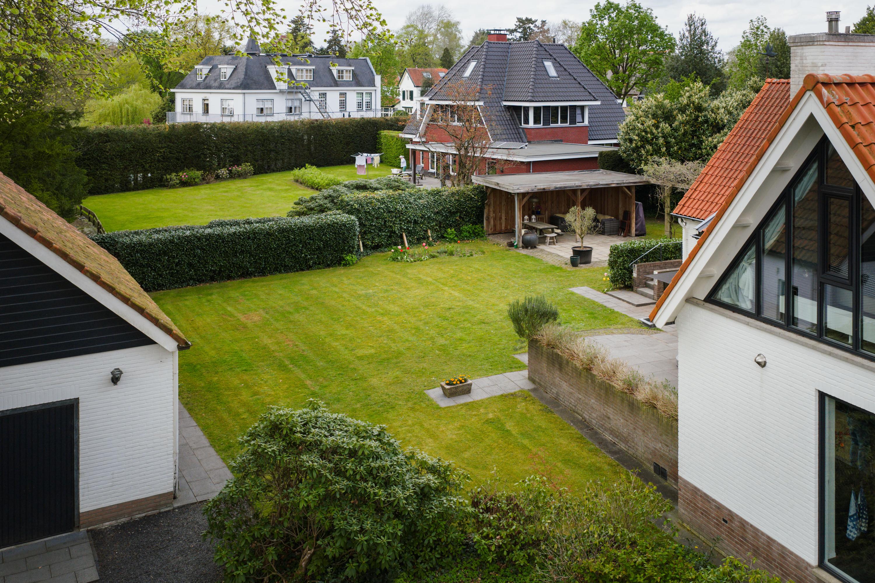 At the rear of the house lies a wonderful garden with expansive lawns, large laurel hedges, beautifully landscaped borders and attractive terraces. One terrace behind the kitchen features a charming outdoor fireplace, providing a delightful setting for long summer evenings with family and friends. There is also a cosy veranda with a large terrace and ample space for a lounge set.