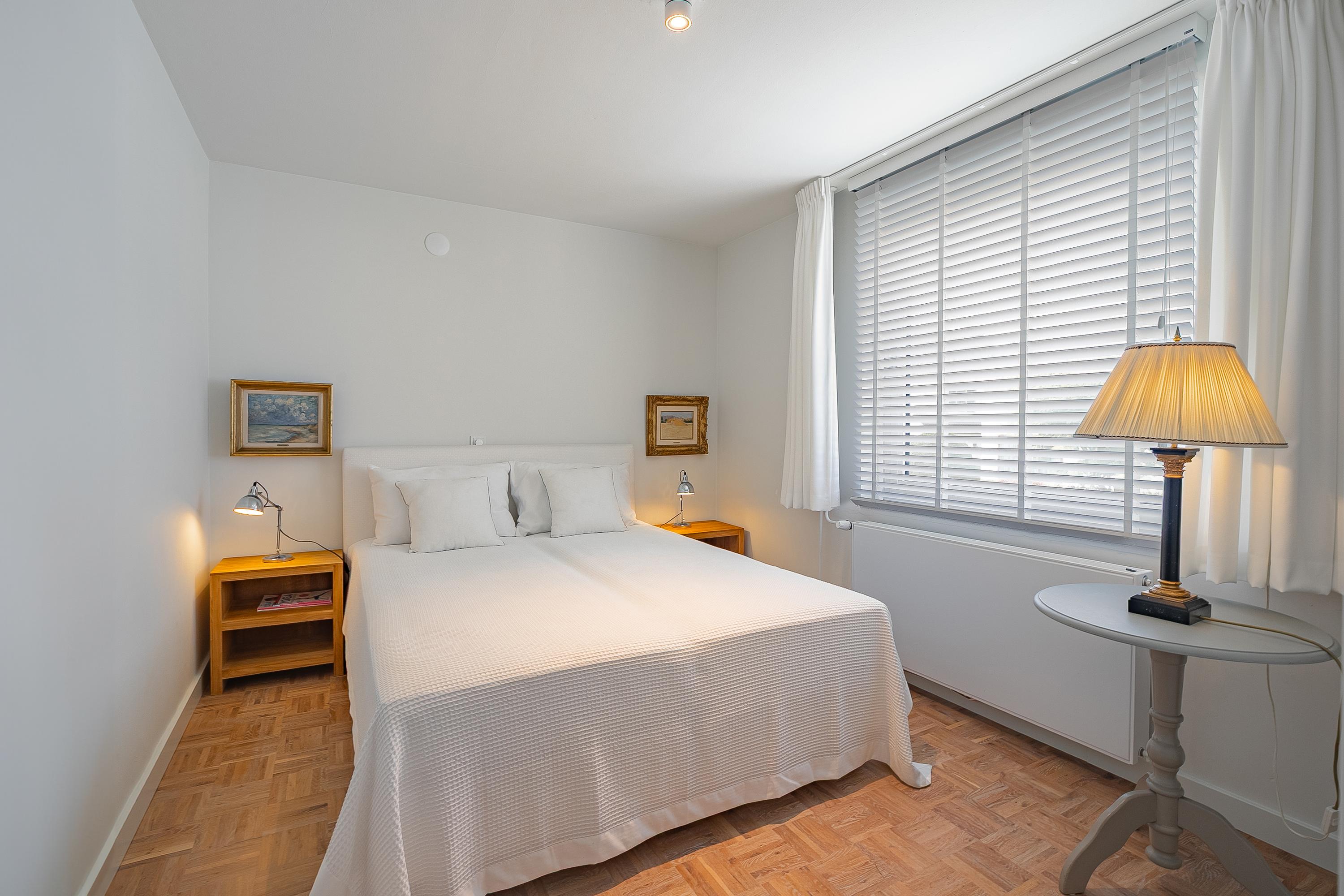 The spacious passage leads to four comfortable bedrooms (approx. 6.7, 8.5, 11.5 and 14.5 m²). The walk-in closet room and the office are equipped with custom-made, stylish built-in cupboards from Slangen Interieurbouw. The other rooms are also practically furnished. The bathroom features mechanical ventilation and is equipped with a bathtub, a walk-in shower, a double sink, and a wall-mounted toilet. All rooms have aluminium window frames with HR++ glazing and are stylishly fitted with mosaic parquet flooring.
