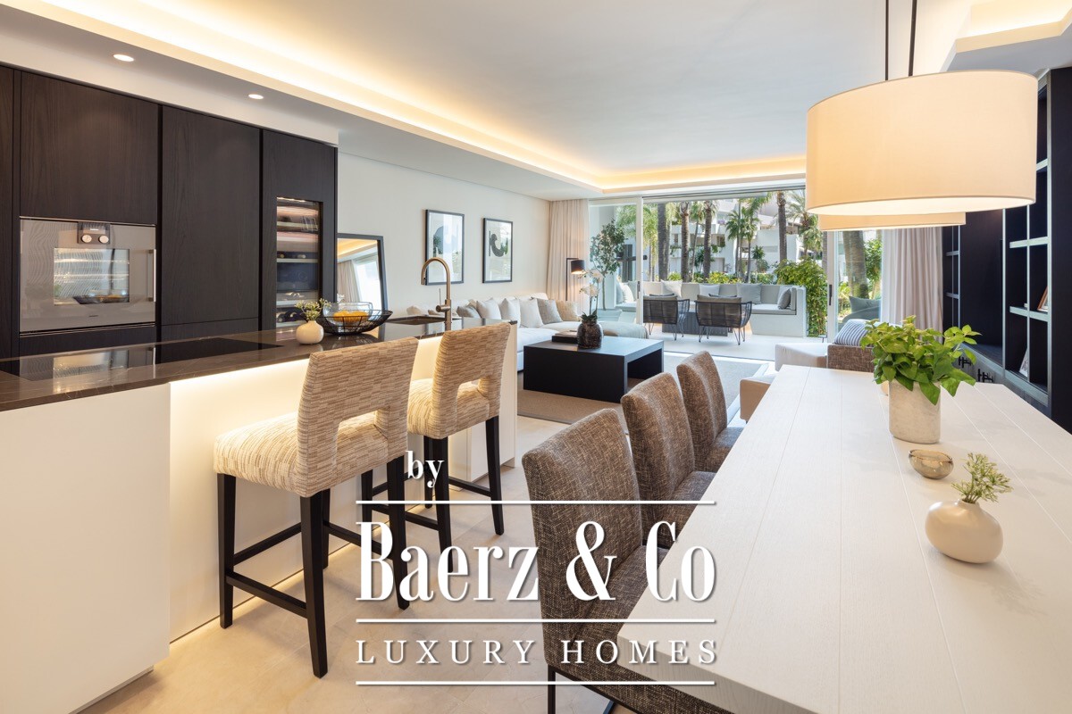 Apartment Marbella is presented at the heart of the five star Puente Romano resort, distinguished by a meticulous renovation that elevates everyday living. The living area spans 138 m², designed with an open plan arrangement that channels natural light throughout the south facing interior. A custom kitchen, crafted with oak cabinetry and Gaggenau appliances, merges seamlessly with the lounge, flowing onto a private terrace set against curated communal gardens.