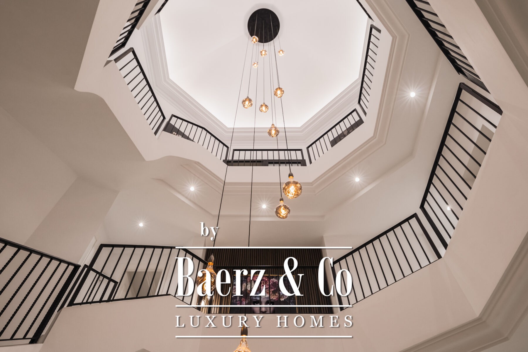 Arranged across four levels, the residence offers six bedrooms, seven bathrooms, and seamless access to refined spaces, all served by a private elevator. Upon entry, a spiral staircase and statement chandelier set a quietly grand tone, enhanced by natural light and the sensation of open sea vistas. The ground floor brings together a luminous open-plan living area, formal dining, a modern kitchen, pantry, dedicated office, en-suite guest room, and a versatile multi-use space. Sliding doors reveal a sun-washed terrace, outdoor kitchen, infinity pool, and spaces for both private reflection and effortless entertaining.