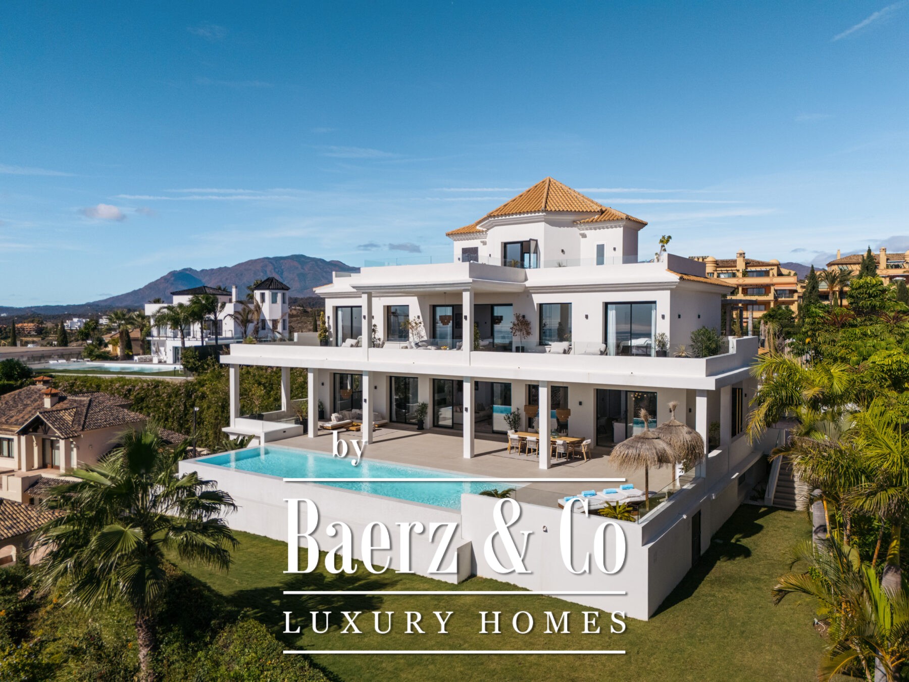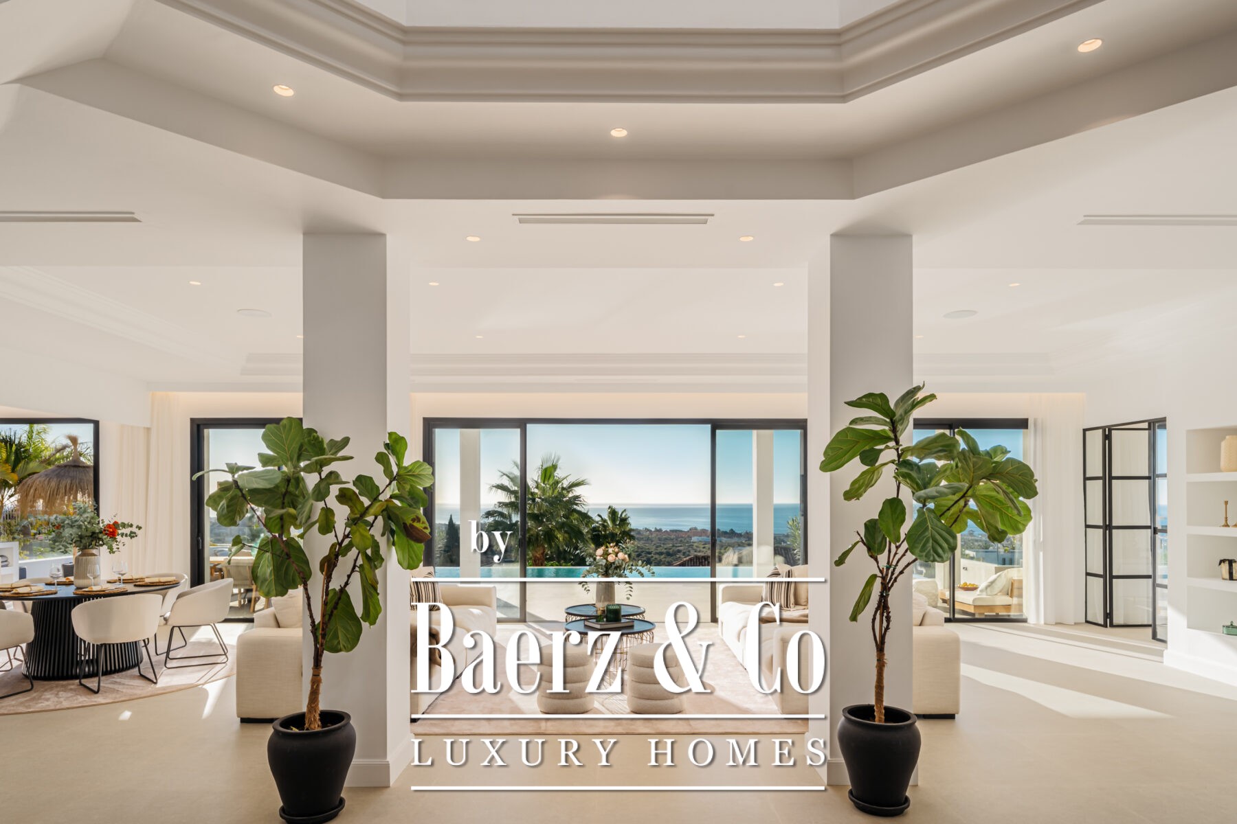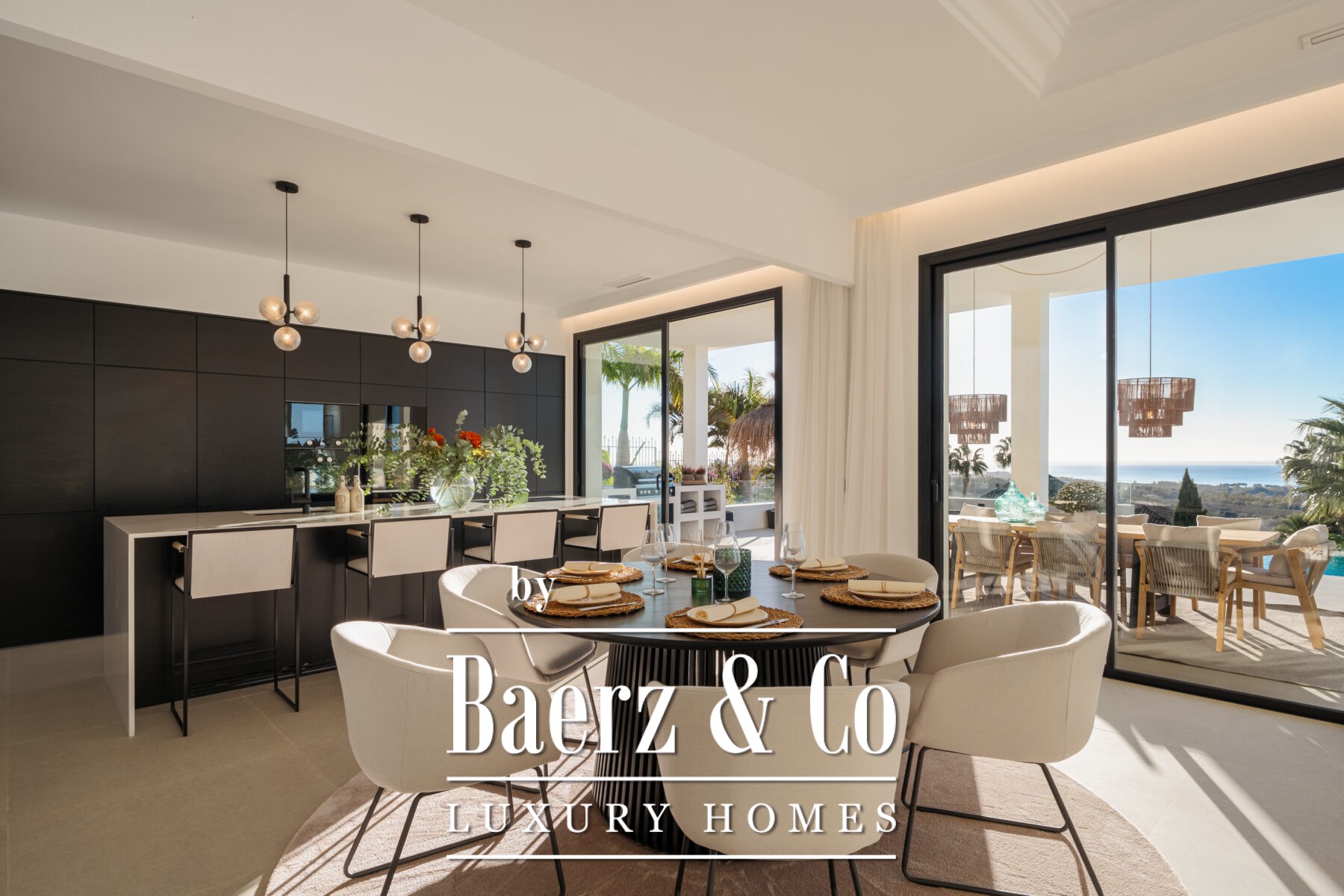 Villa Marbella with panoramic sea and mountain views stands within the gated community of Los Flamingos, moments from the Villa Padierna Resort, exceptional golf courses, and select amenities. This villa in Marbella spans 1,076 m² on a 1,600 m² plot and is crafted for those who appreciate the precision of architecture and the discretion of secure living.
