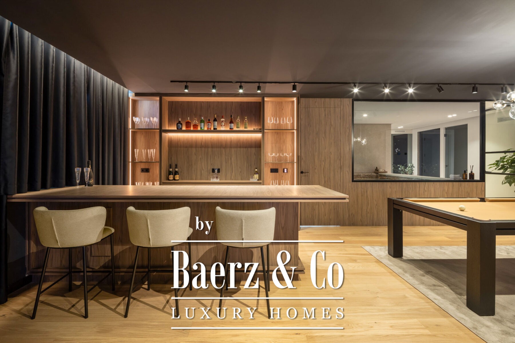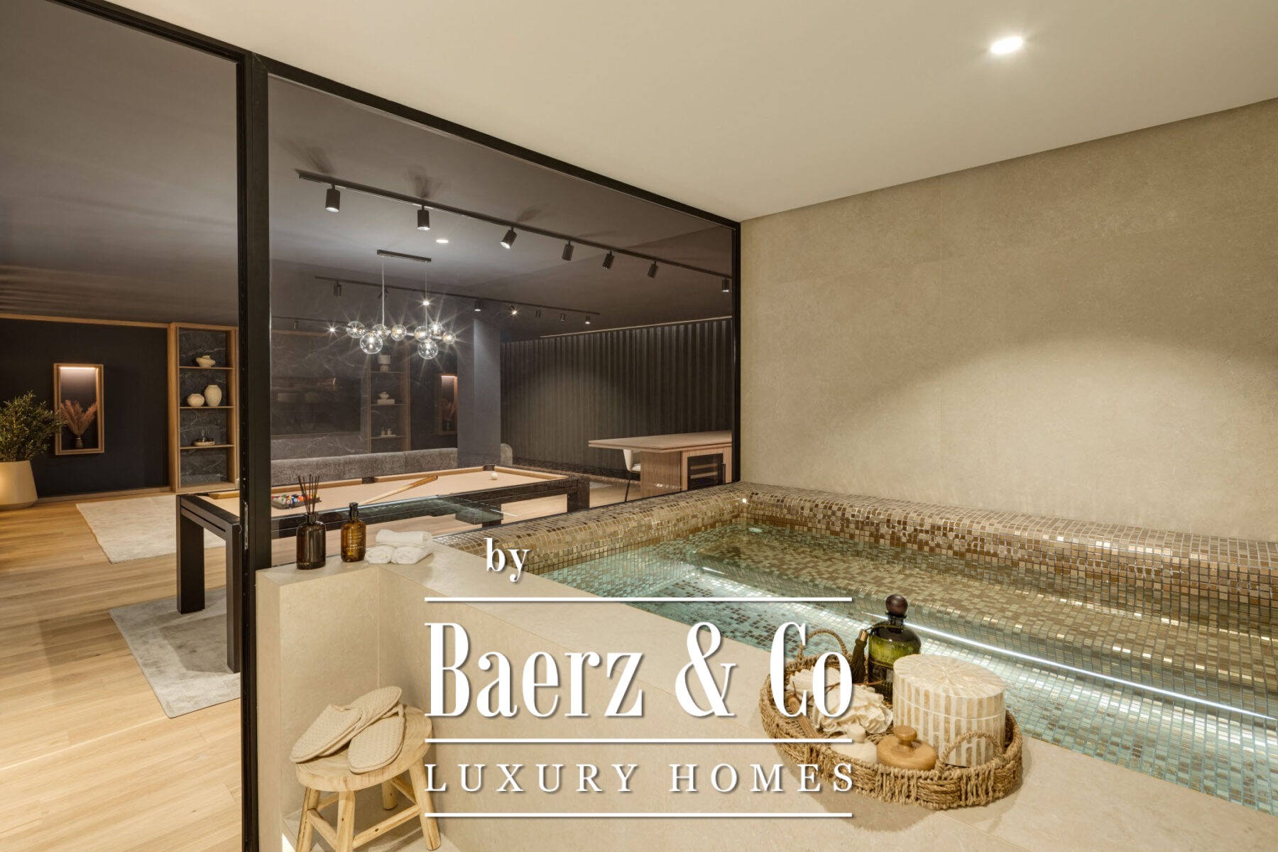 The villa’s interior is distinguished by high-grade oak flooring, large-format porcelain tiles, and state-of-the-art appliances from Gaggenau and Siemens. Leisure pursuits are indulged through a private heated swimming pool, a dedicated cinema room, and a gym. The garage meets modern needs, and the property is offered fully furnished in a contemporary style, with furniture available separately at €250,000.