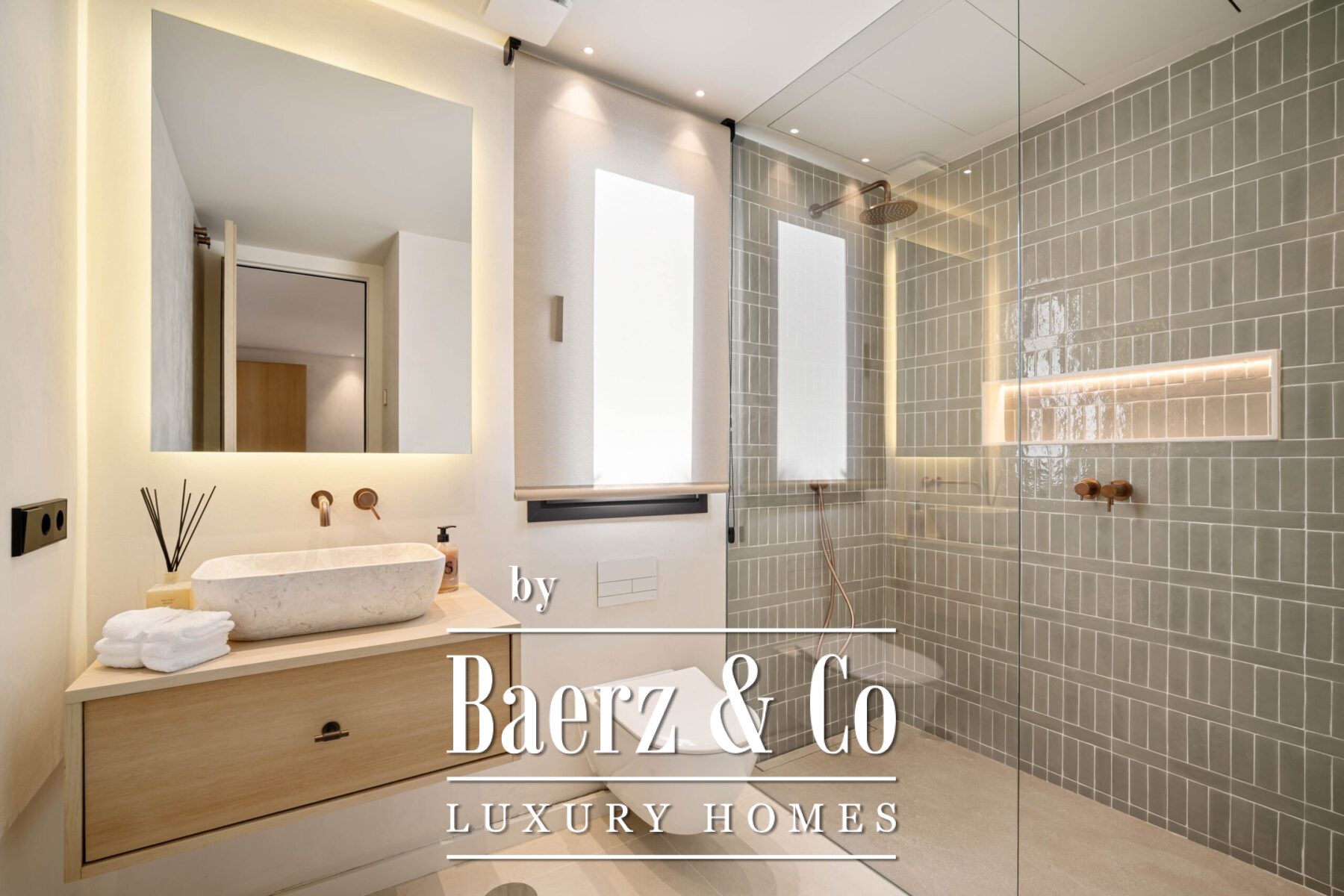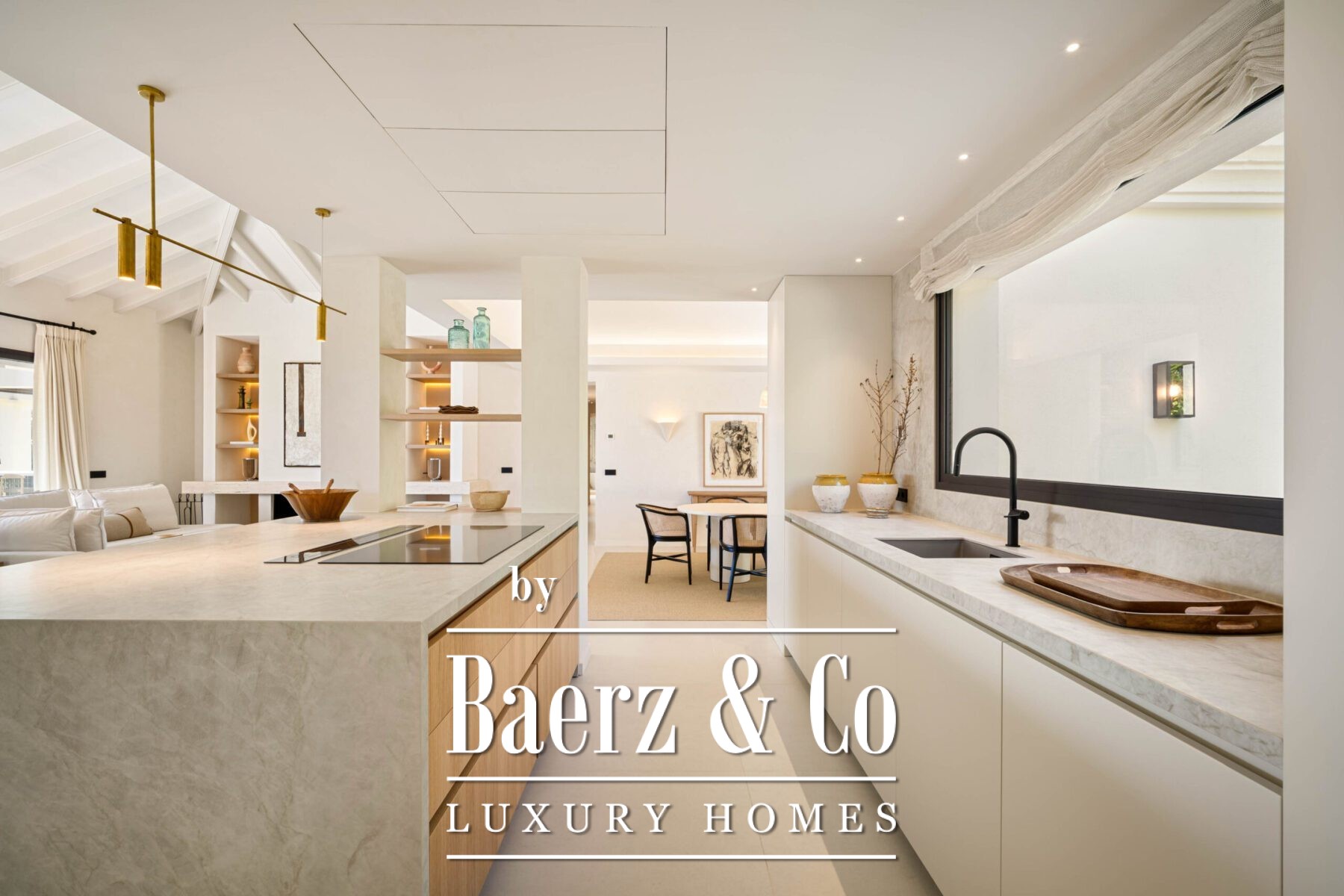 Villa Marbella with Sea and Mountain Views sits quietly in Nueva Andalucía, minutes from Los Naranjos Golf Course and close to Marbella’s celebrated beaches and dining. This fully renovated single-level villa, with 241 m² of living space and set on an 855 m² elevated plot, captures the essence of Mediterranean life. The main living area is defined by its open-plan design, vaulted ceilings, and a palette of soothing natural tones. Light moves freely throughout, courtesy of floor-to-ceiling glass doors that lead to a generous terrace, where an infinity-edge pool appears suspended above the valley. From both inside and the rooftop terrace, expansive views reach across the valley to meet the sea.