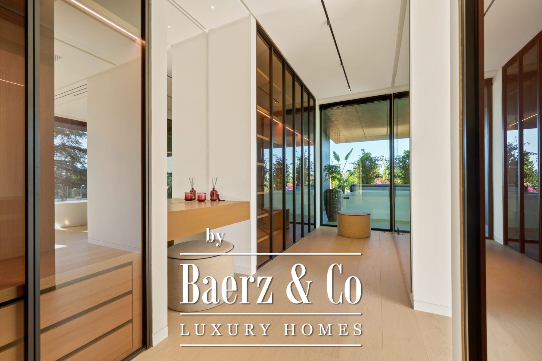 The lower level is dedicated to leisure and lifestyle. It boasts a playroom, TV lounge, bar, gym, and sauna, as well as two additional en-suite bedrooms and a home office.
