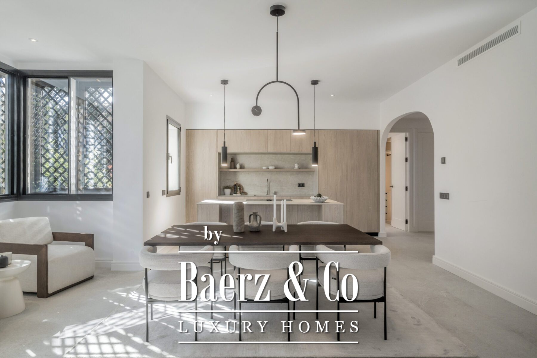 Apartment Marbella occupies a privileged position within Sierra Blanca, where each detail pivots on refined craftsmanship and a sense of effortless order. The living area is defined by natural textures, bespoke wood carpentry, high ceilings, and an open designer kitchen fitted with Miele appliances. Marble surfaces, deep wooden accents, and an integrated wine cooler shape a kitchen both elegant and practical, designed for culinary enjoyment and sociable evenings.