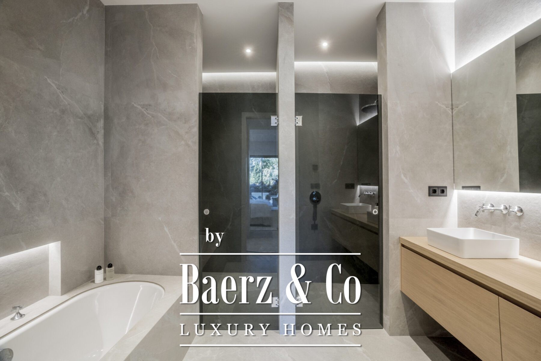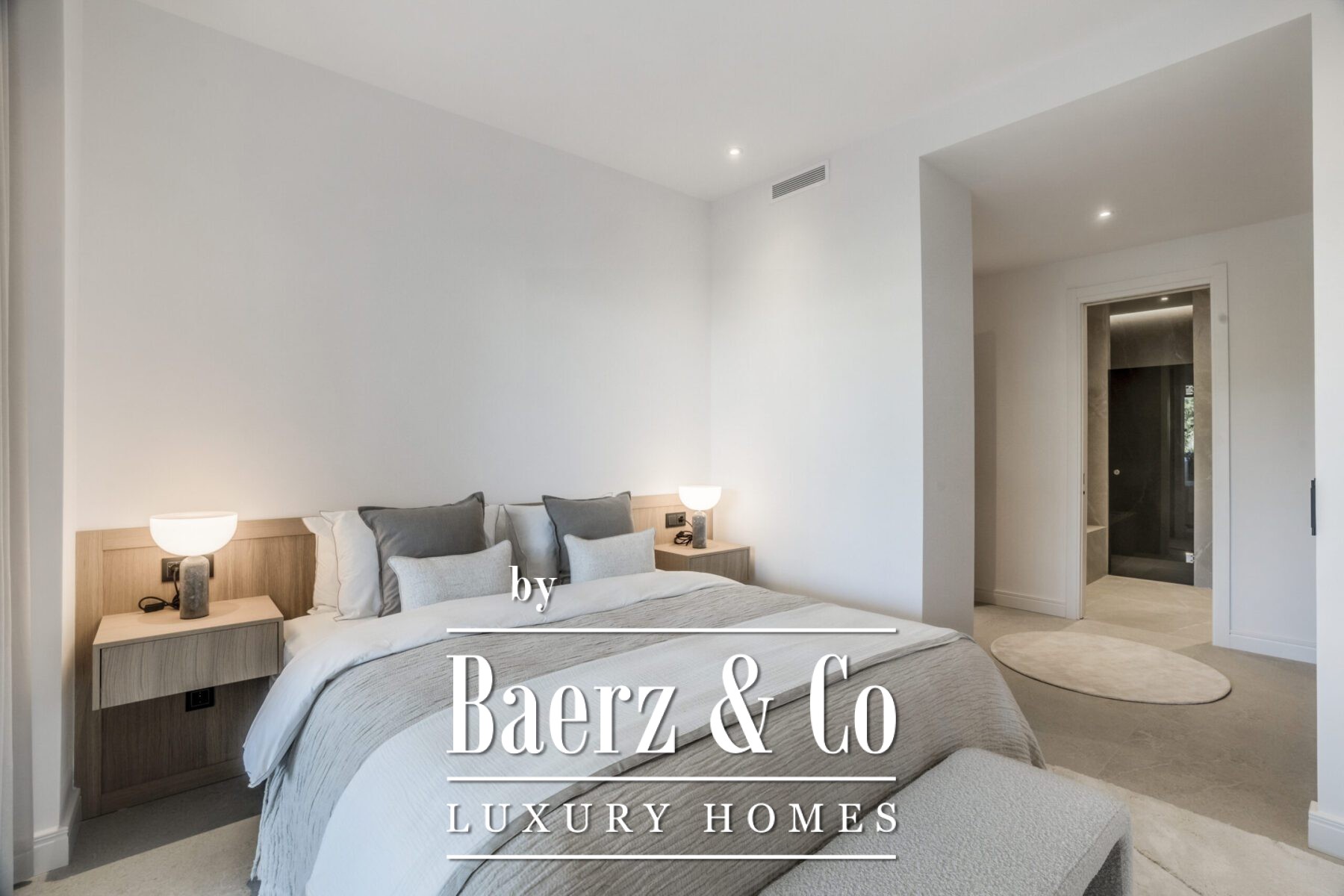 The 145 m² interior offers three bedrooms, each marked by custom wardrobes, understated LED lighting, and harmonious wooden elements. Bathrooms feature Dornbracht showers and faucets, with the master suite showcasing a double vanity and a sculptural bathtub. The atmosphere throughout is balanced, warm, and spatially generous.
