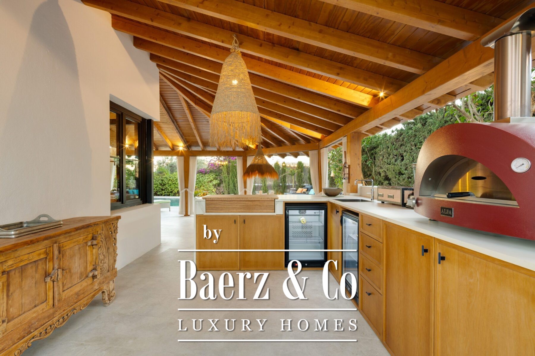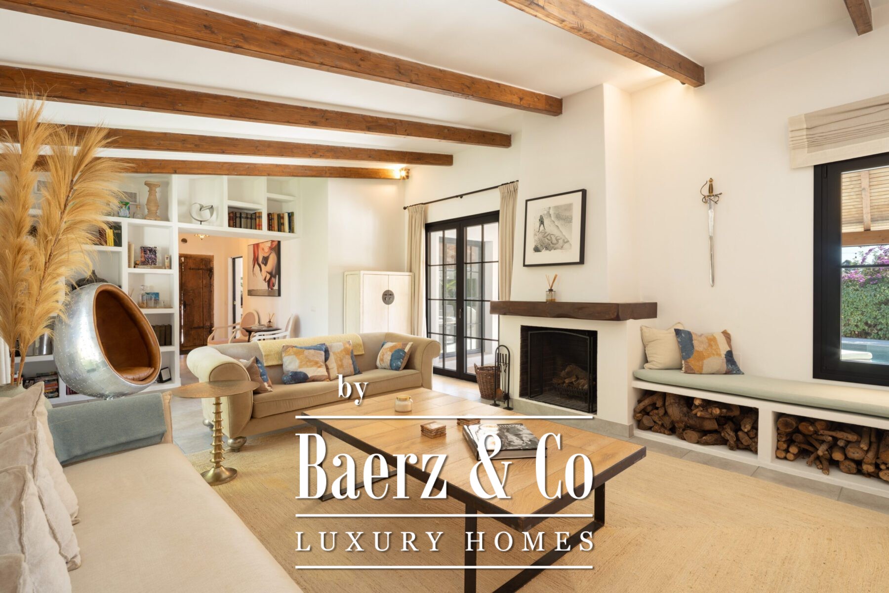 The living room with fireplace anchors the house, opening to both a formal dining area and a modern fully fitted kitchen. The villa integrates privacy and independence for guests or extended family through a separate apartment with its own entrance and kitchen, blending inclusion and retreat as needed. Outdoors, the private pool is framed by landscaped gardens, alongside an al fresco kitchen and barbecue appointed for effortless entertaining. A putting green invites quiet leisure, echoing the villa’s proximity to Guadalmina’s renowned golf courses.