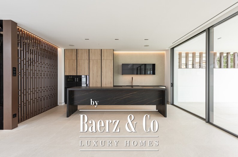 The property’s four distinctive levels are interconnected by an elegant staircase. The open-plan living and dining areas flow seamlessly to a sunlit terrace, ideal for gatherings and enjoying the pace of Marbella’s outdoor living. A Gaggenau-fitted kitchen and custom cabinetry underscore the home’s focus on aesthetics and daily ease.