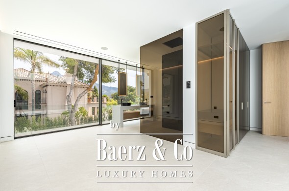 Accommodation comprises four bedrooms and five bathrooms. Three are en-suite sanctuaries enhanced by oak wood flooring and Porcelanosa marble finishes, while the flexible fourth suite on the lower level adapts to guests, staff, fitness, or office use. An outstanding private rooftop solarium crowns the residence, offering a plunge pool, rooftop cinema, and open views to the Mediterranean Sea and La Concha Mountain. This solarium sets a stage for sunset conversation or quiet reflection beneath the stars.