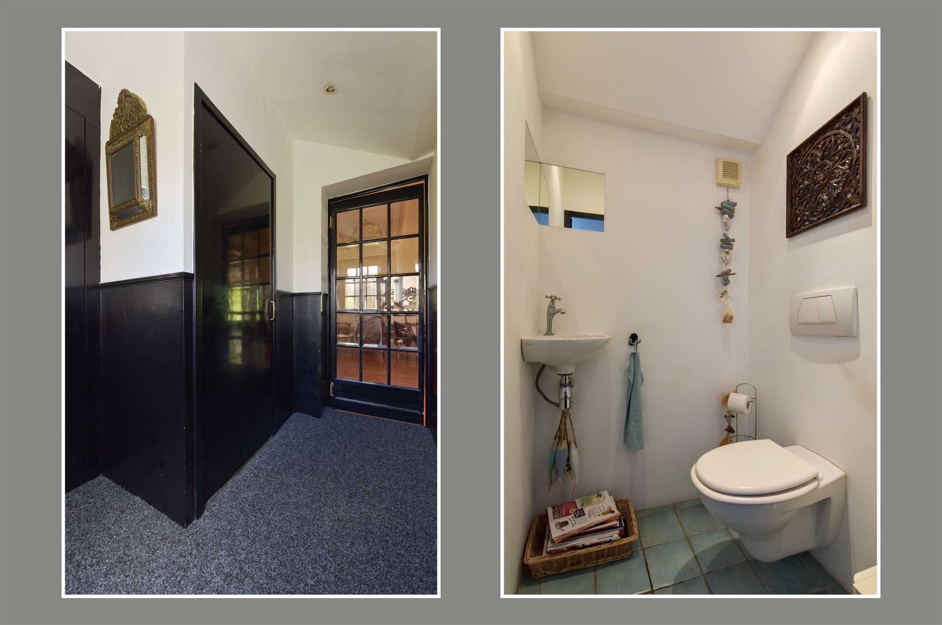 The bathroom, located at the rear of the house, is fully equipped. Here you can enjoy a spacious walk-in shower with rain shower, a luxurious whirlpool bathtub, a toilet, a double vanity unit, and a towel radiator. A perfect place to start or end your day in relaxation.