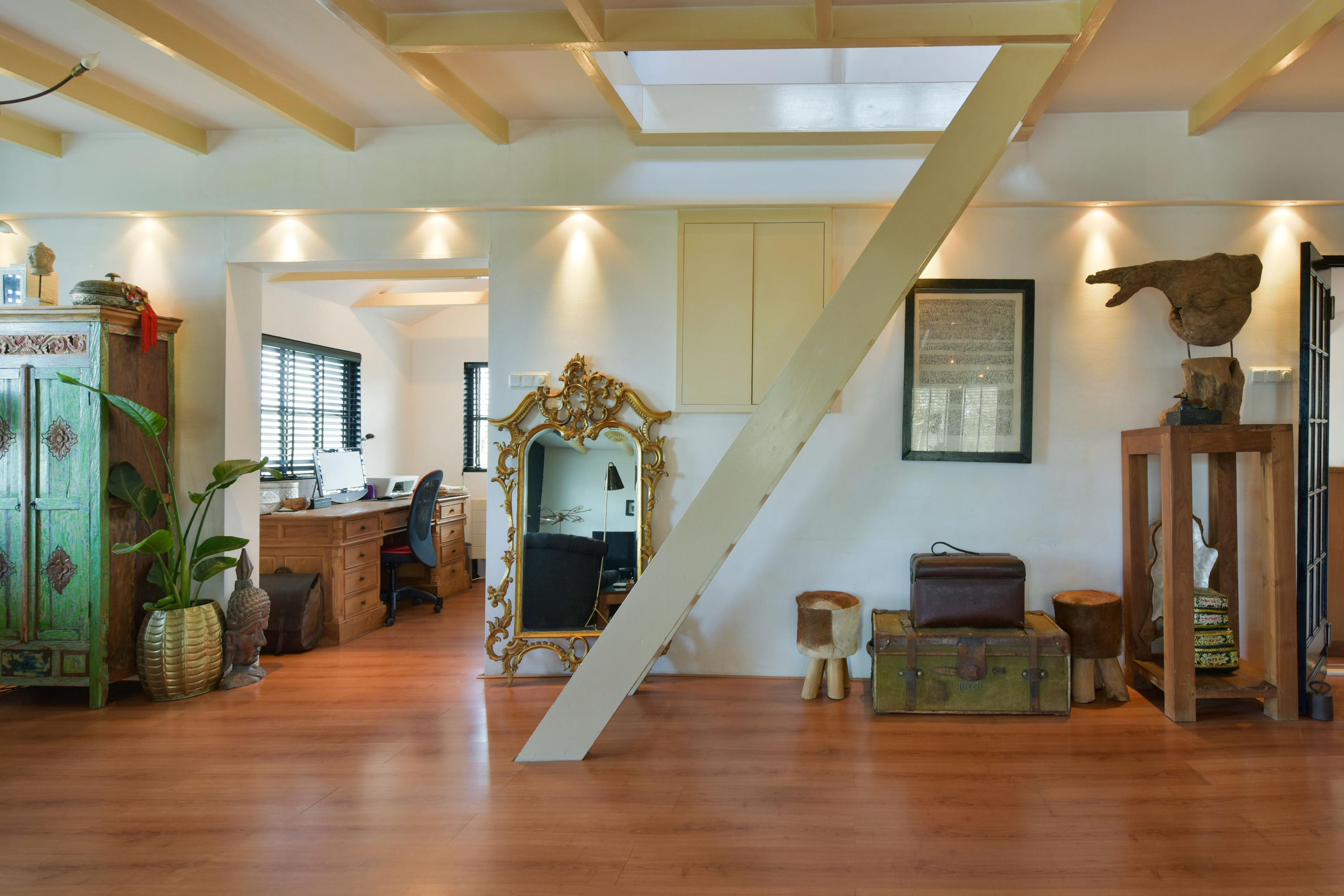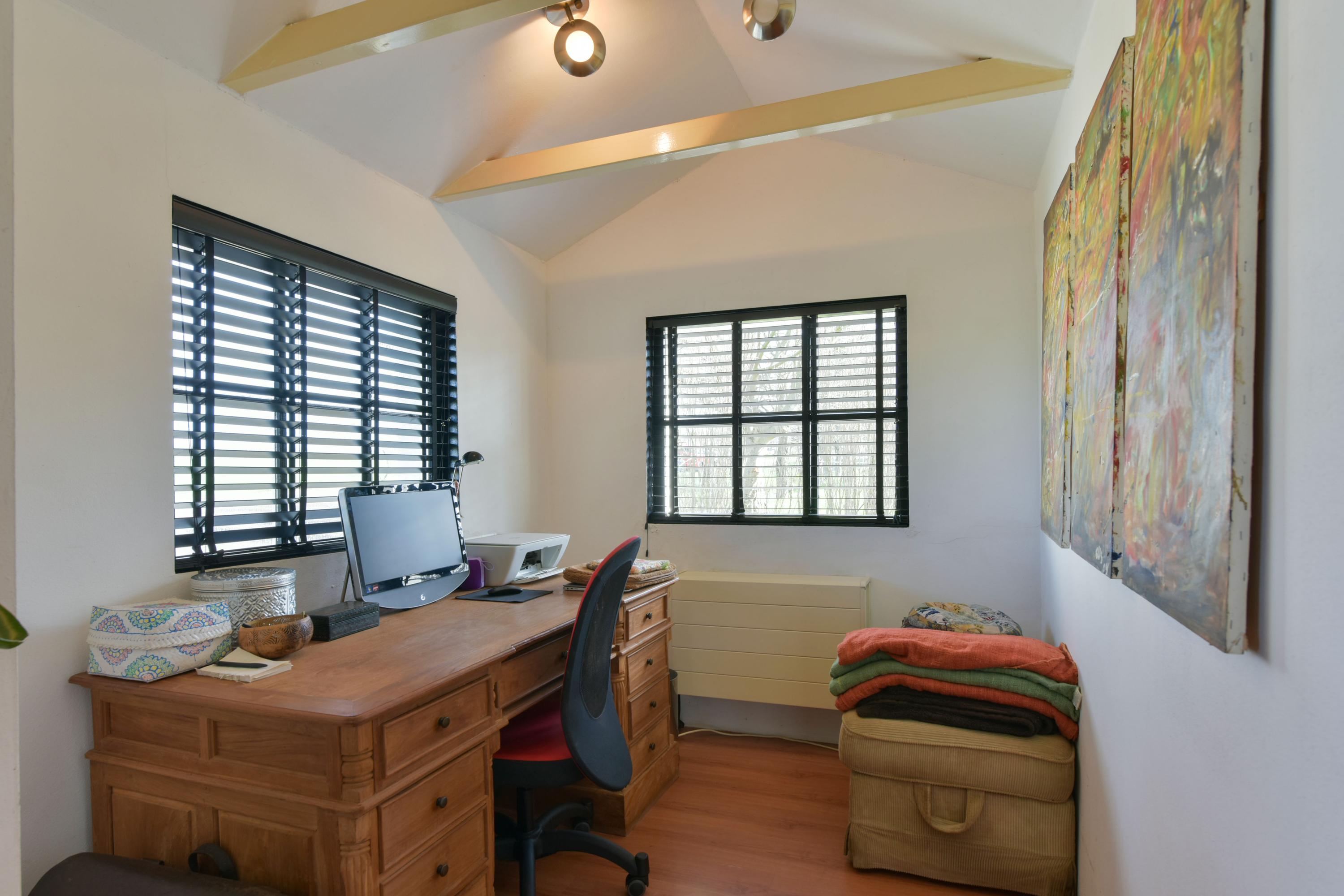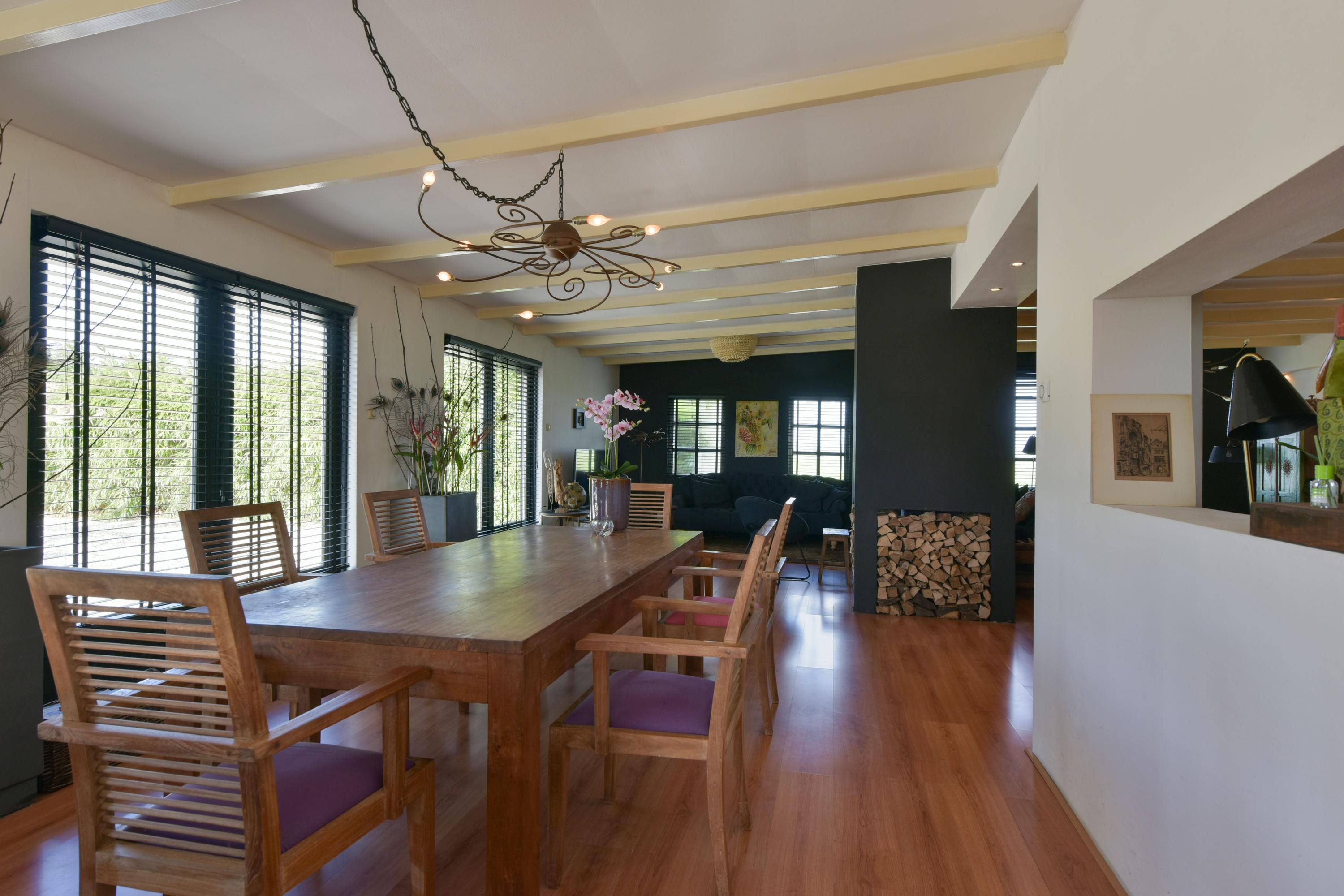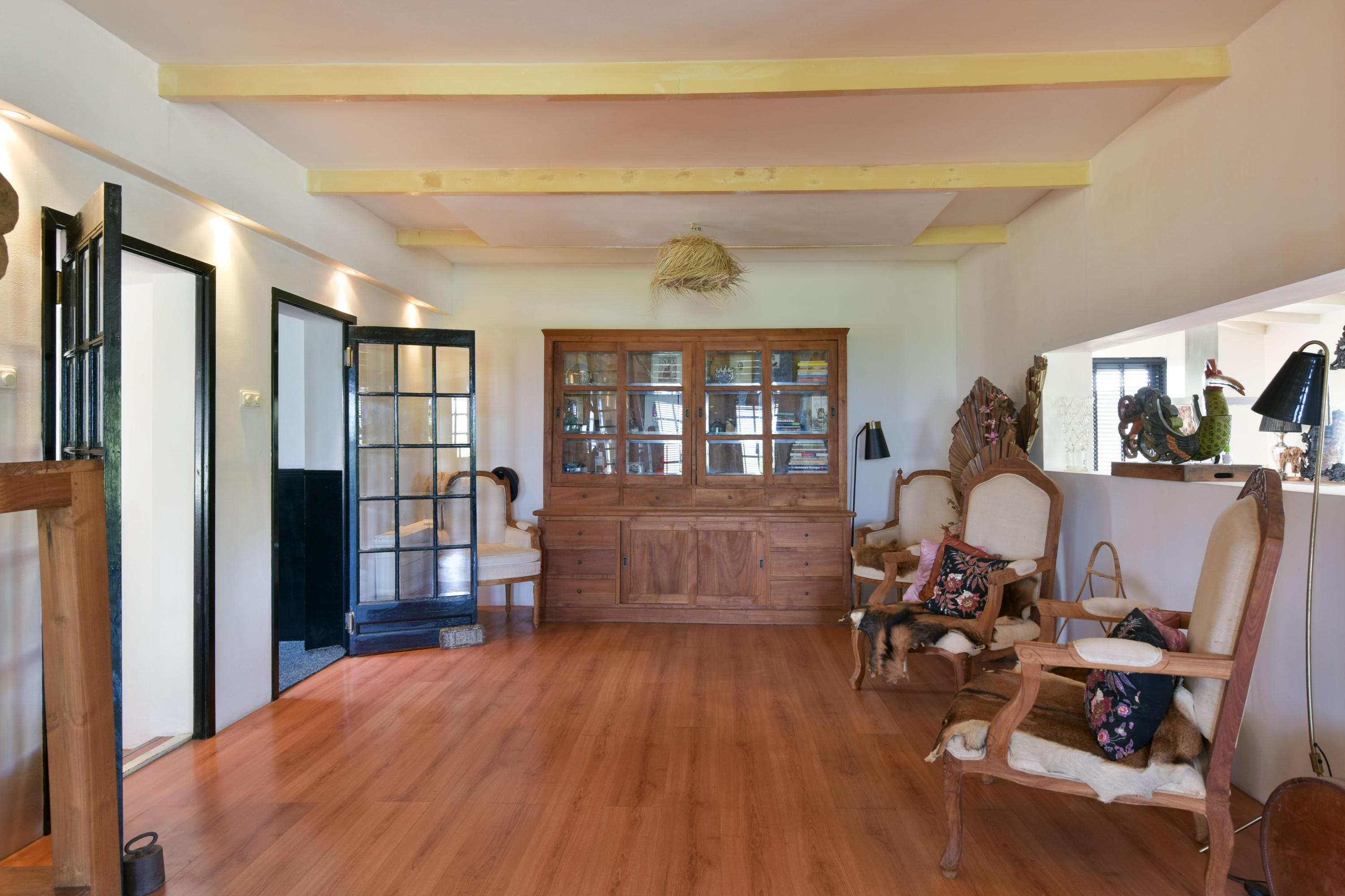The large fireplace with wood-burning stove forms the warm heart of the space, while the wooden ceiling beams add to the charming, country-style atmosphere. In addition, a separate corner has been created, currently set up as a home office—ideal for working from home or as a quiet reading or hobby space.