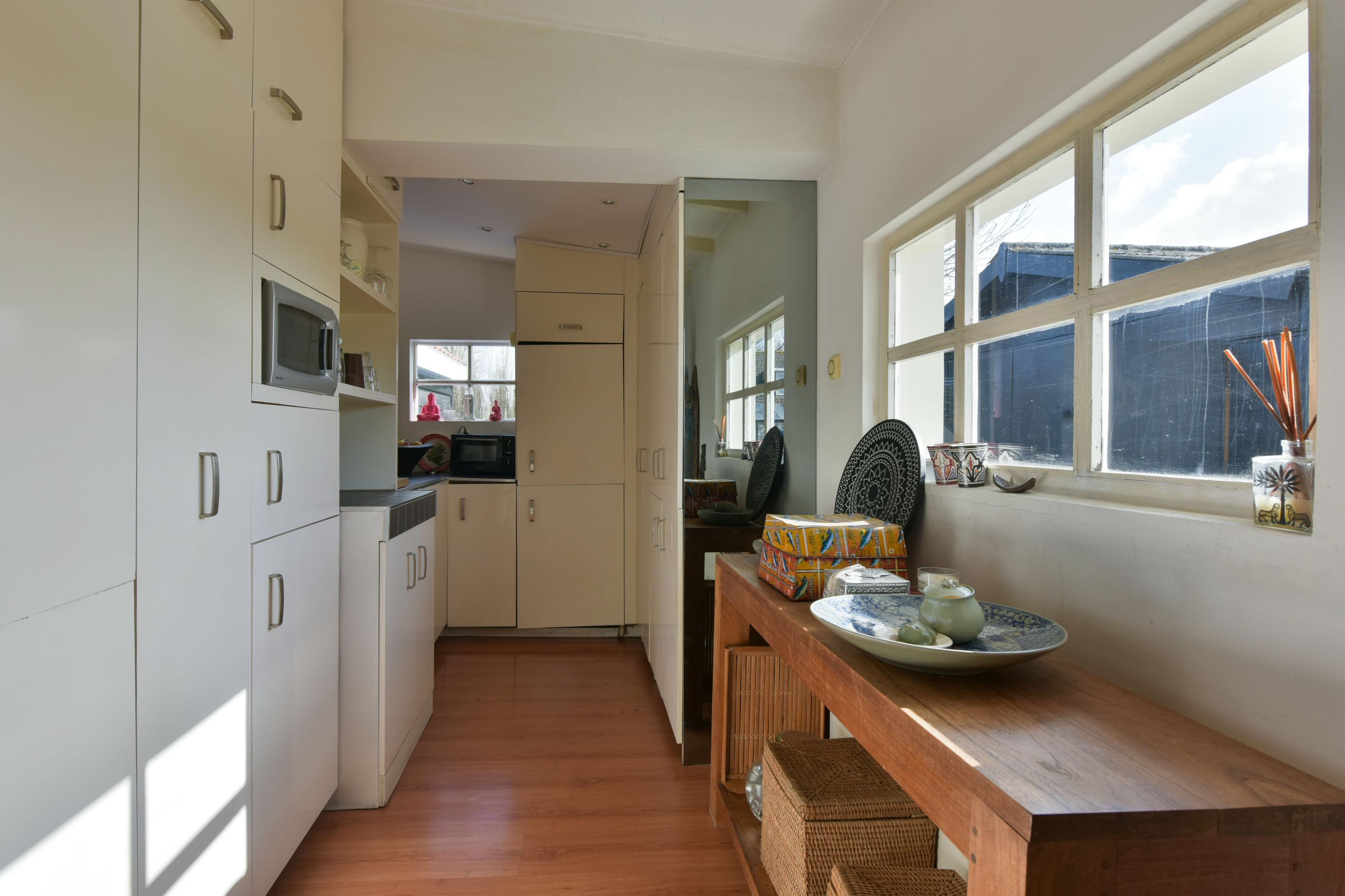 The open kitchen is spacious and fully equipped. The large cooking island with ample drawers offers plenty of workspace and storage, while the cabinet wall provides additional storage. The kitchen is fitted with a gas stove with extractor hood, a convection oven, refrigerator, and dishwasher. A practical detail: the washing machine, dryer, and central heating boiler are neatly concealed within various kitchen cabinets.