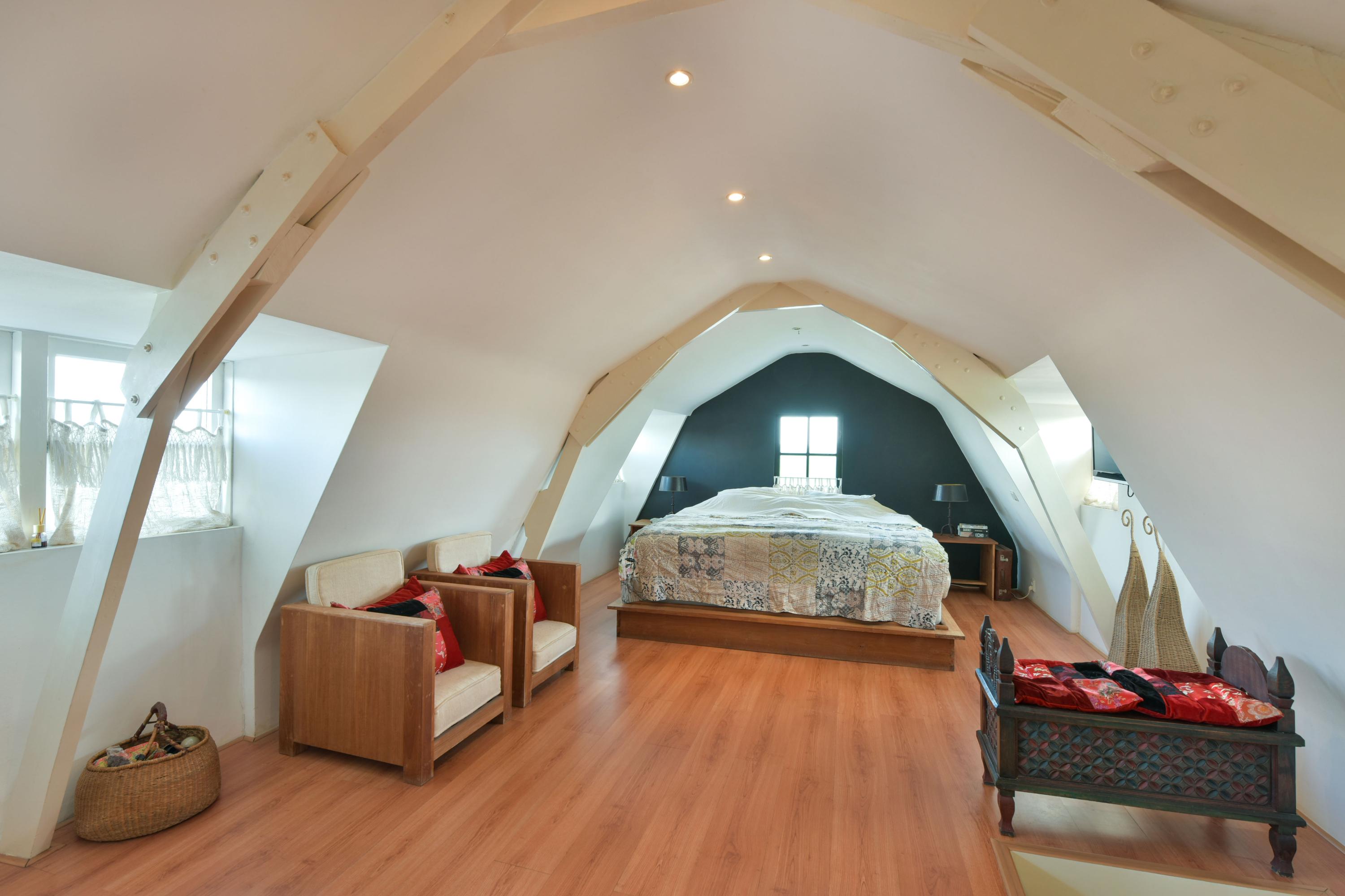 The staircase in the living room leads to the first floor. Here you will find a spacious bedroom with two large built-in wardrobes, ideal for those who require plenty of storage space.