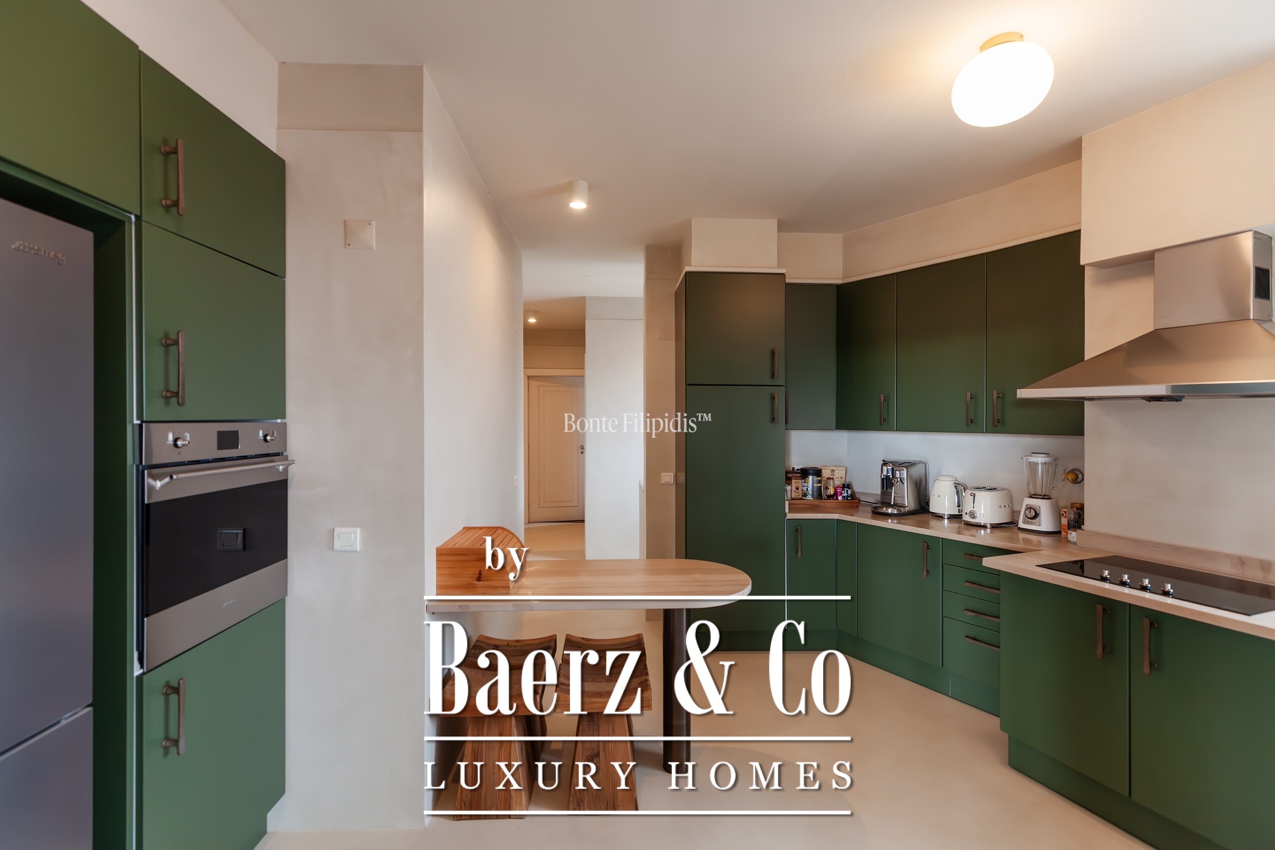 Wide windows in the living and dining room invite serene river views and lead to a spacious balcony, creating a seamless connection between interior and exterior space. A fireplace anchors the room, offering warmth and a gathering point during Lisbon’s cooler evenings. The kitchen is fully equipped with contemporary appliances and an integrated laundry, delivering both function and discretion.