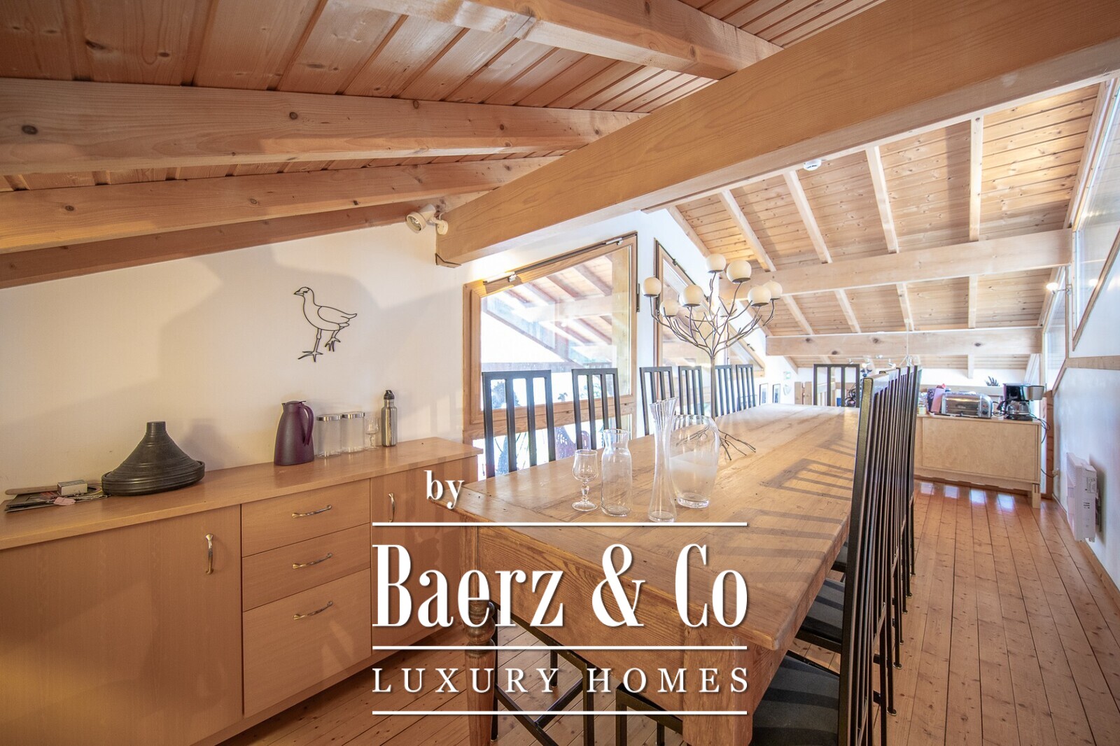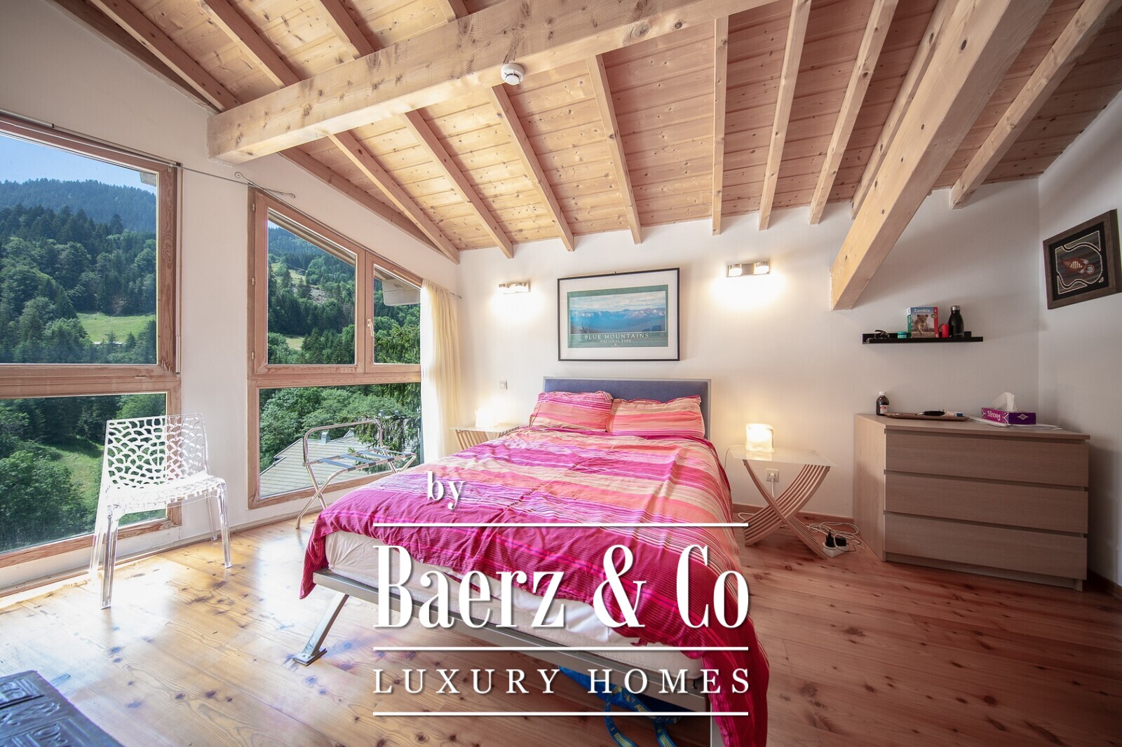 The main living area has a fireplace and large windows that allow plenty of natural light and excellent views of the surrounding forest and mountains and open out on to a sunny south west facing balcony. A mezzanine level above the lounge and kitchen serves as the dining area.