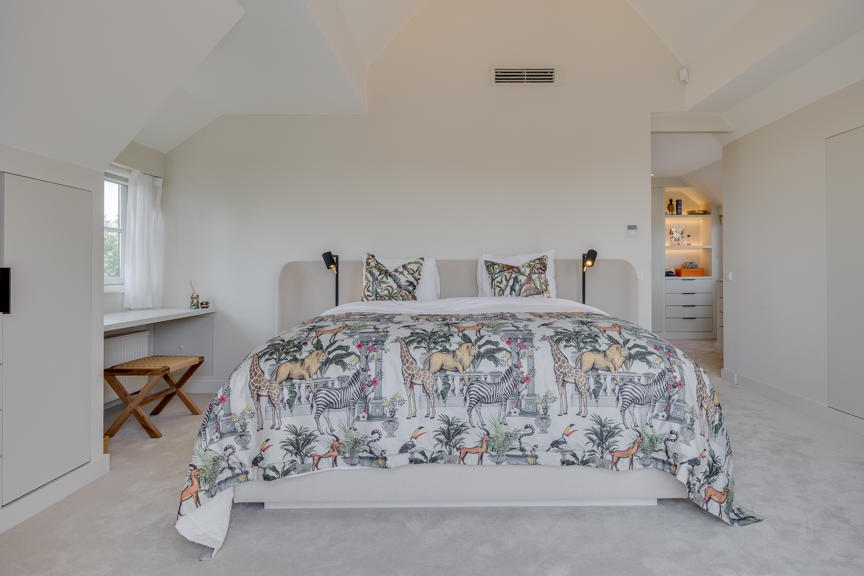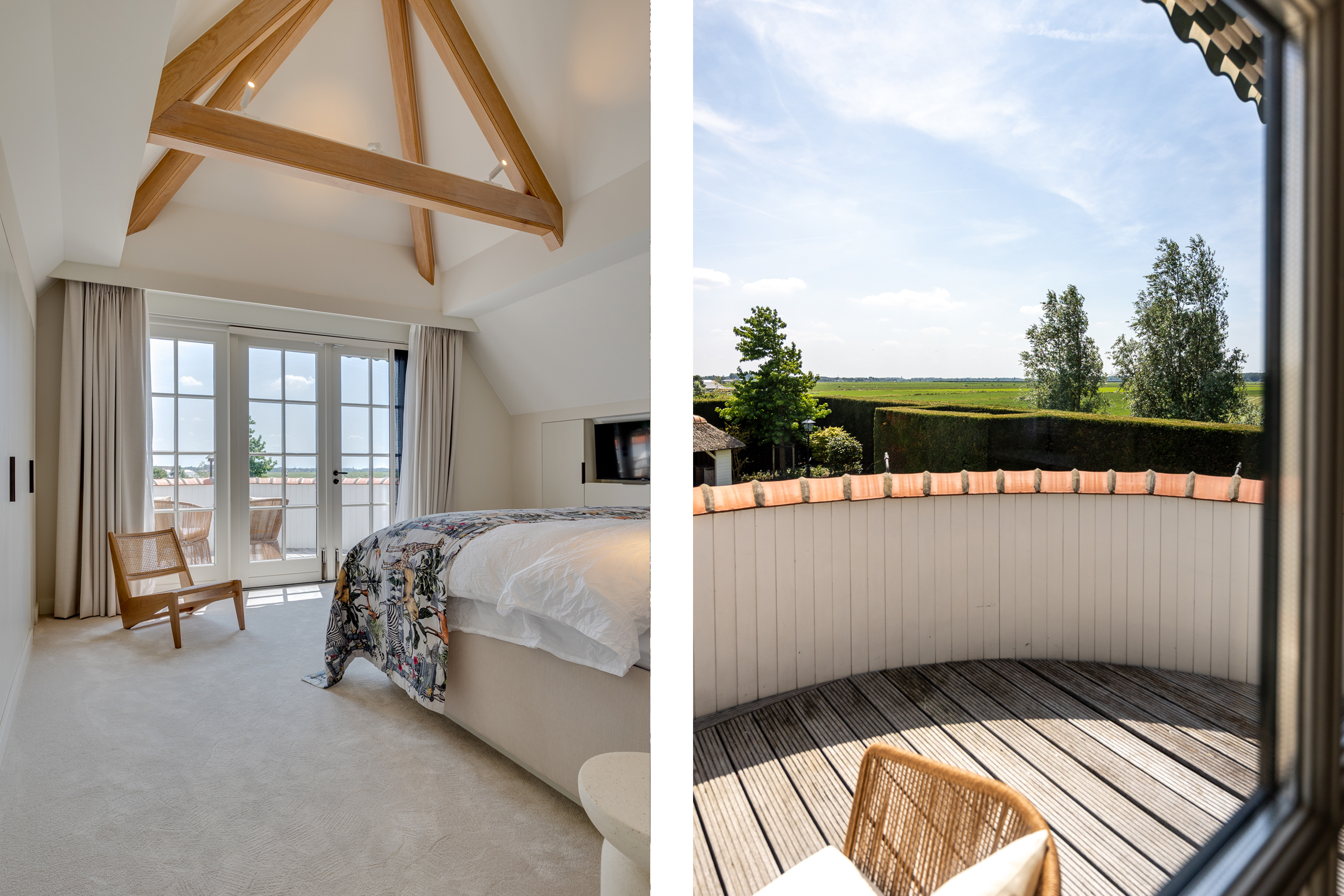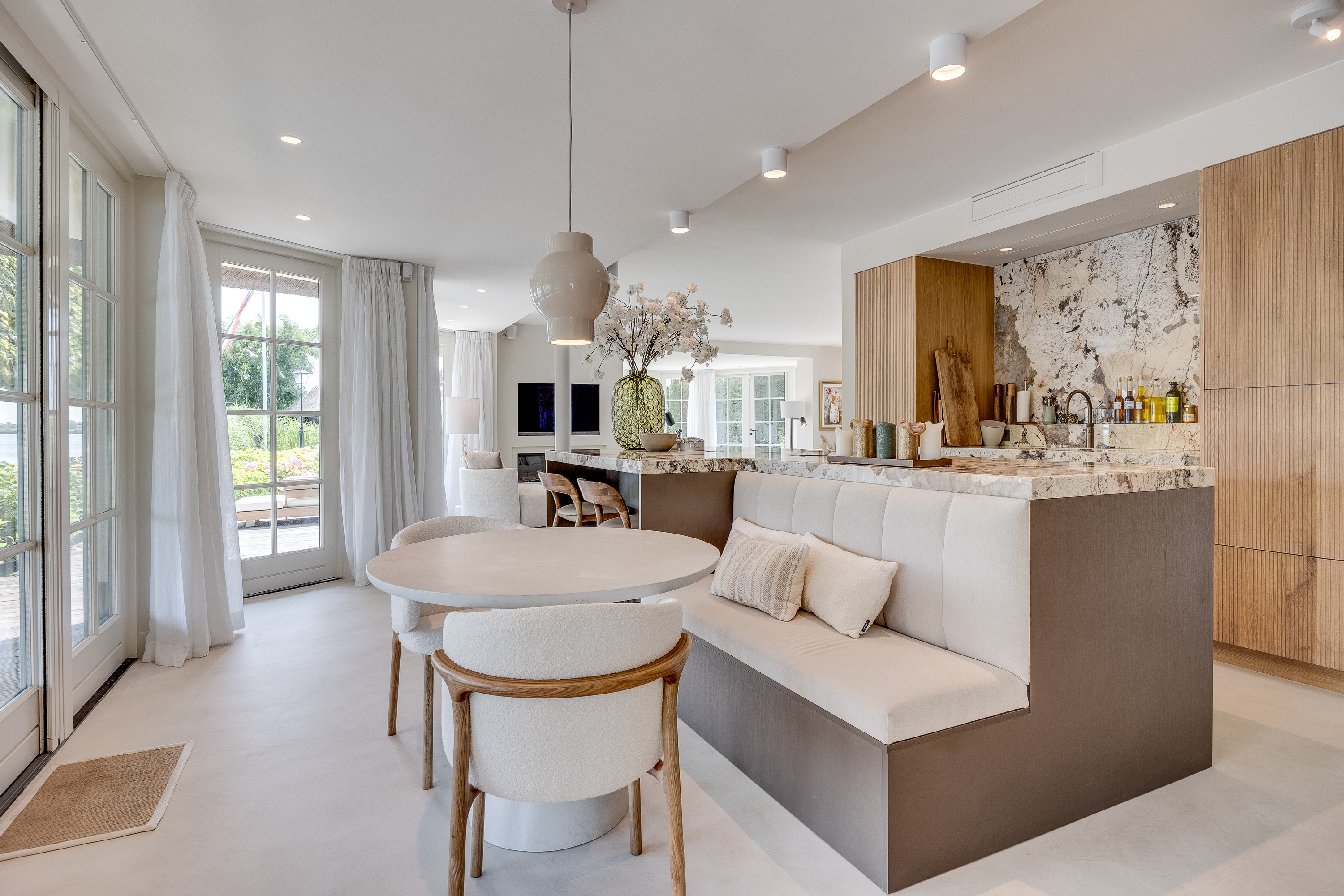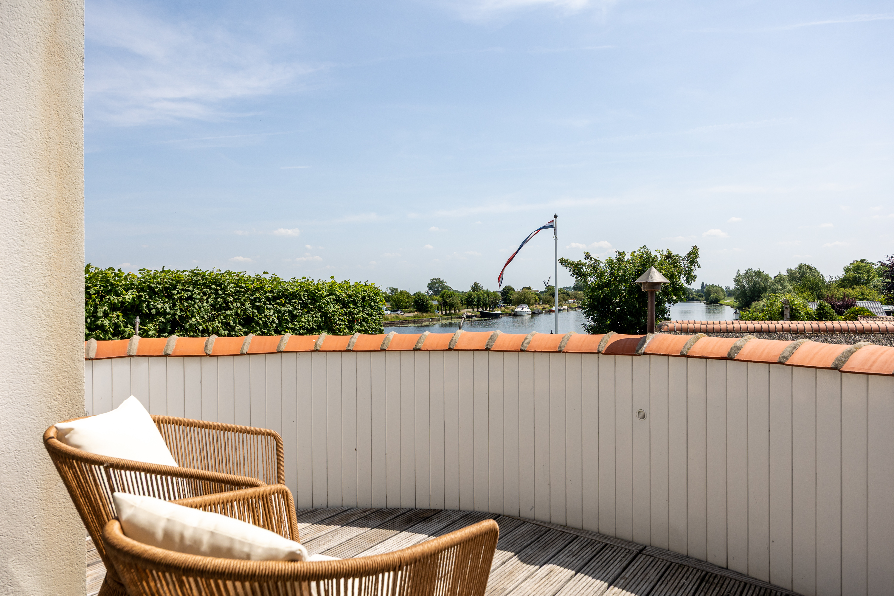 The upper floor features the master bedroom, fully equipped with an en-suite bathroom and walk-in closet. Here, the tranquility is almost tangible; beautiful sweeping views of the countryside and the Vecht river through the French doors and the indoor balcony. All you can hear is the rippling water and the soft singing of the (water) birds. There is also a luxurious second bedroom with its own en-suite bathroom. Time to end your working day? Close your laptop and stroll through the garden, or grab your boat and set sail. A well-deserved dip is, of course, also an option.