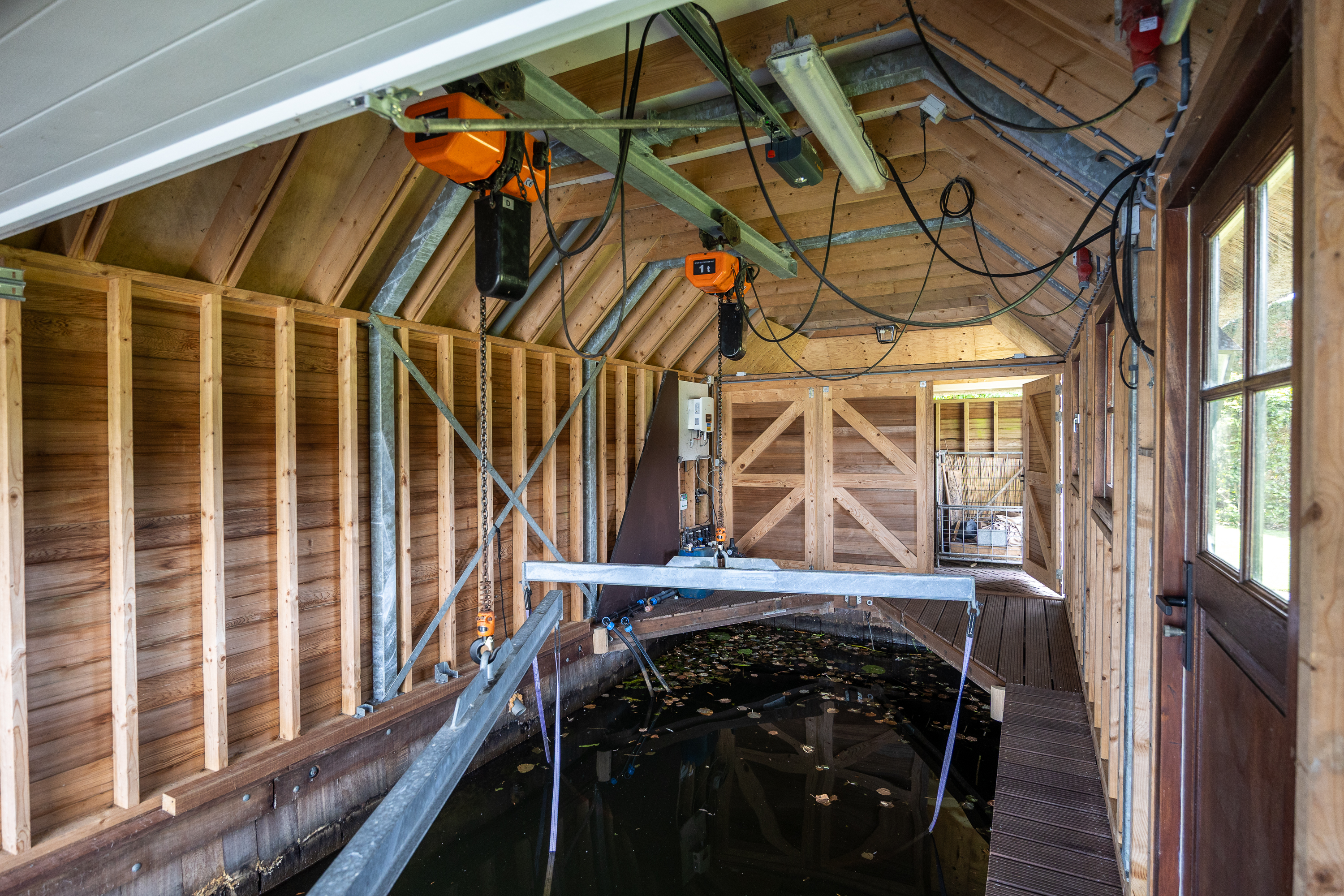 Here you can lift your boat out of the water in winter and store it for the winter. It is also ideal for lifting the boat in summer, as the hull remains spotlessly clean. The entire automated garden irrigation system is also located here, fully automated and controllable via the app!
