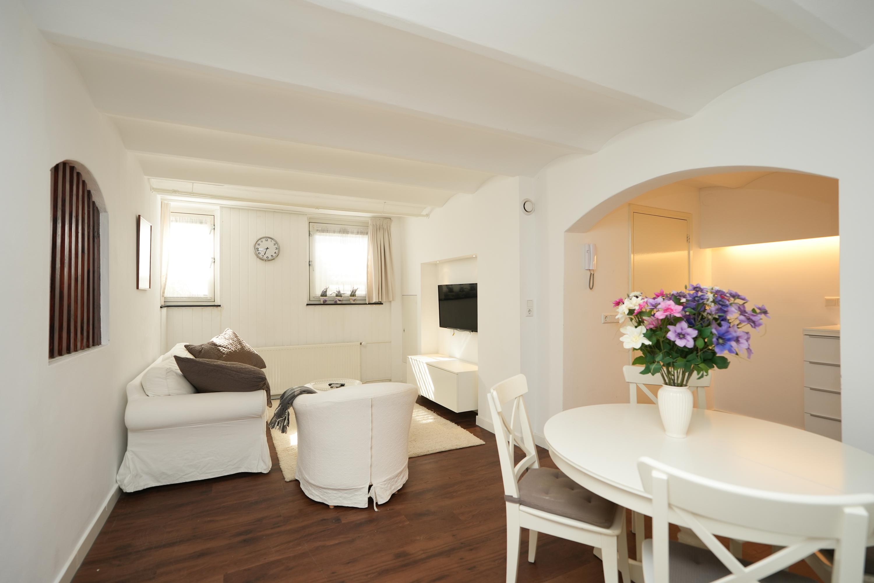 Middels een vaste trap is de bovenste verdieping bereikbaar, hier bevindt zich een ruime woonkamer met een bedstee. Tevens is er een moderne dichte keuken met witgoedaansluiting en er is een functionele badkamer met toilet en douche. Deze verdieping is sfeervol doordat de originele constructiebalken zichtbaar zijn gebleven en de ruimte is lekker licht door de dakramen. Bovendien is er veel bergruimte in vaste kasten.