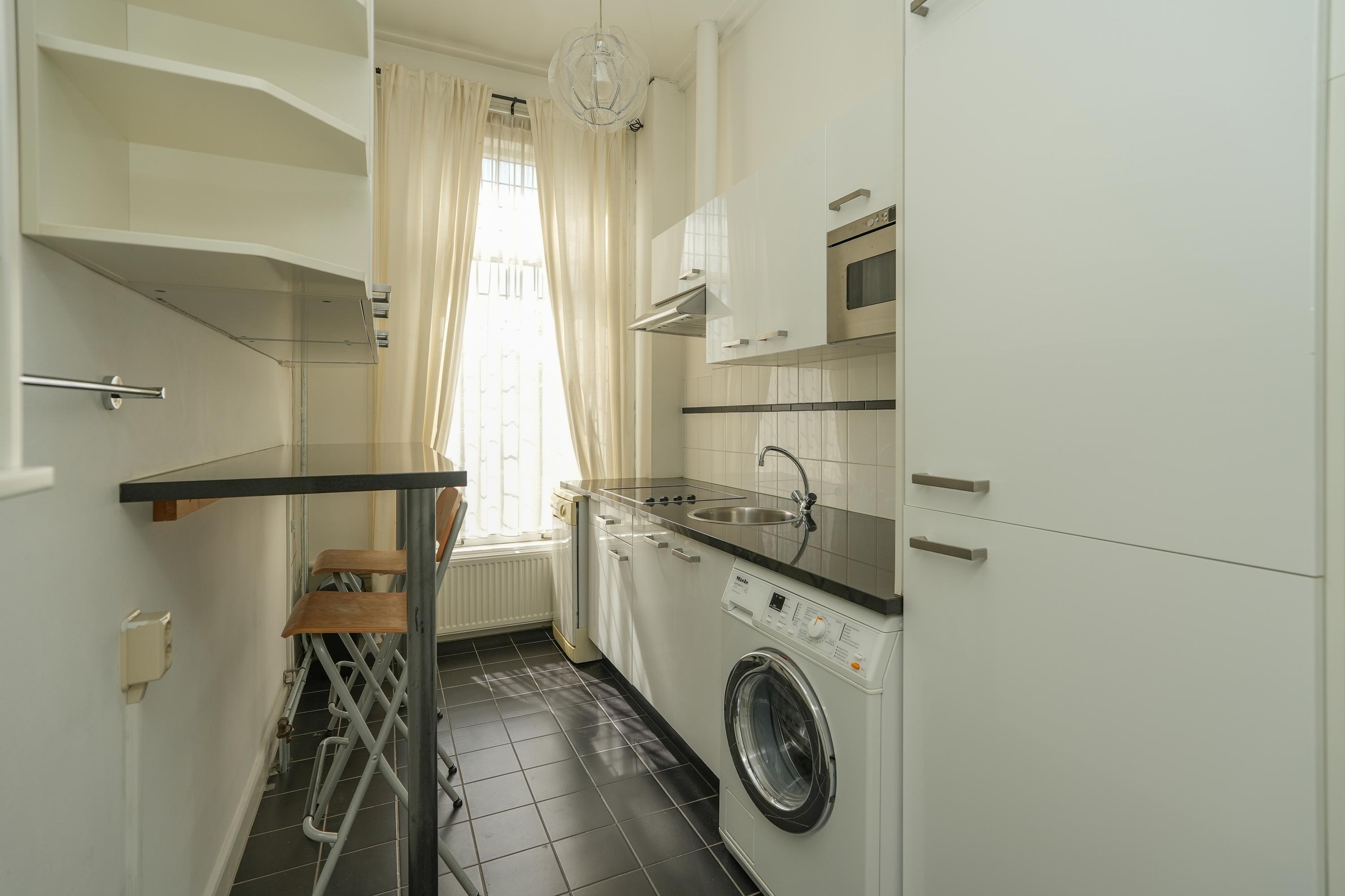 Gang met witgoedaansluiting, aan de achterzijde bevindt zich een open keuken met toegang tot de berging met mechanische ventilatie en stookruimte. Vanuit deze gang zijn aan de voorzijde van de woning een woonkamer met slaapgedeelte aanwezig, inclusief vaste kasten en de badkamer. De keuken heeft een U-opstelling en is voorzien van inbouwapparatuur. De badkamer is uitgerust met een wandtoilet, wastafelmeubel en inloopdouche.