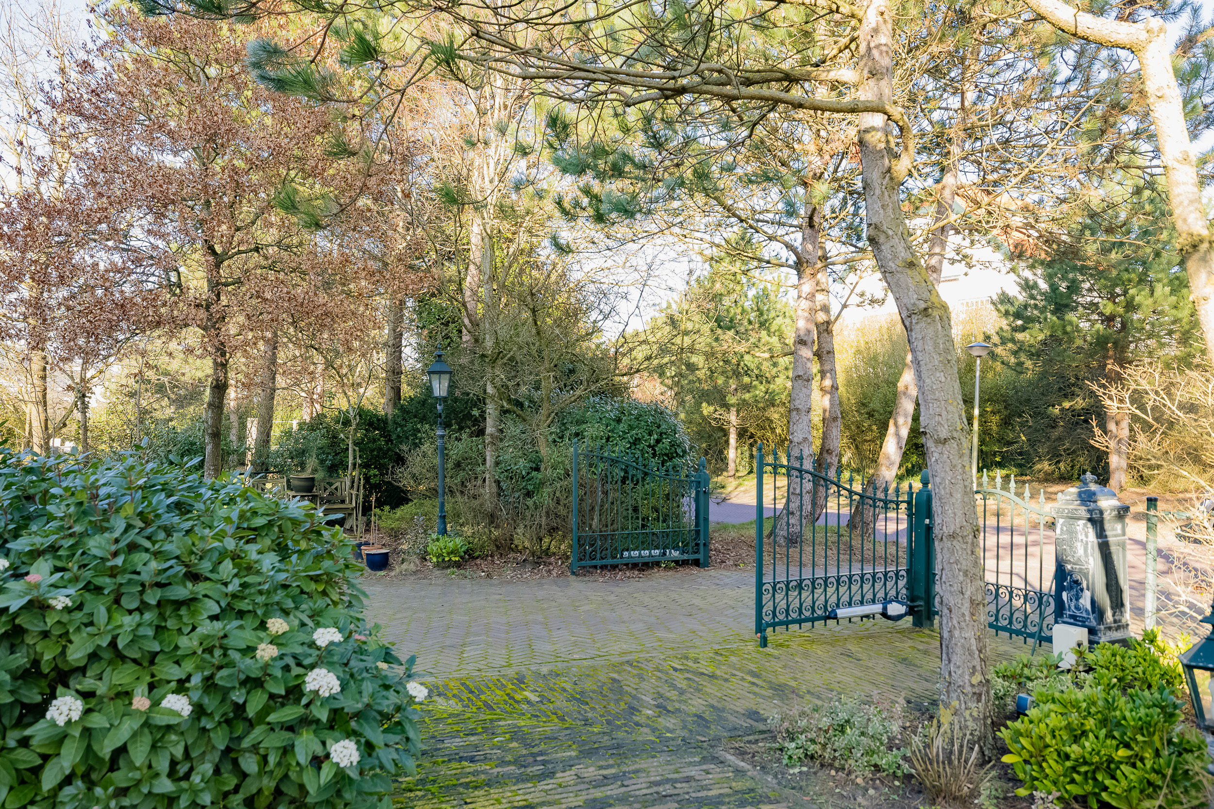 The garden features a lawn, decorative pathways made of cobblestones, and several patios, as well as an ornamental gate with an intercom and thoughtful amenities such as timer-controlled lighting and motion-sensor spotlights.
