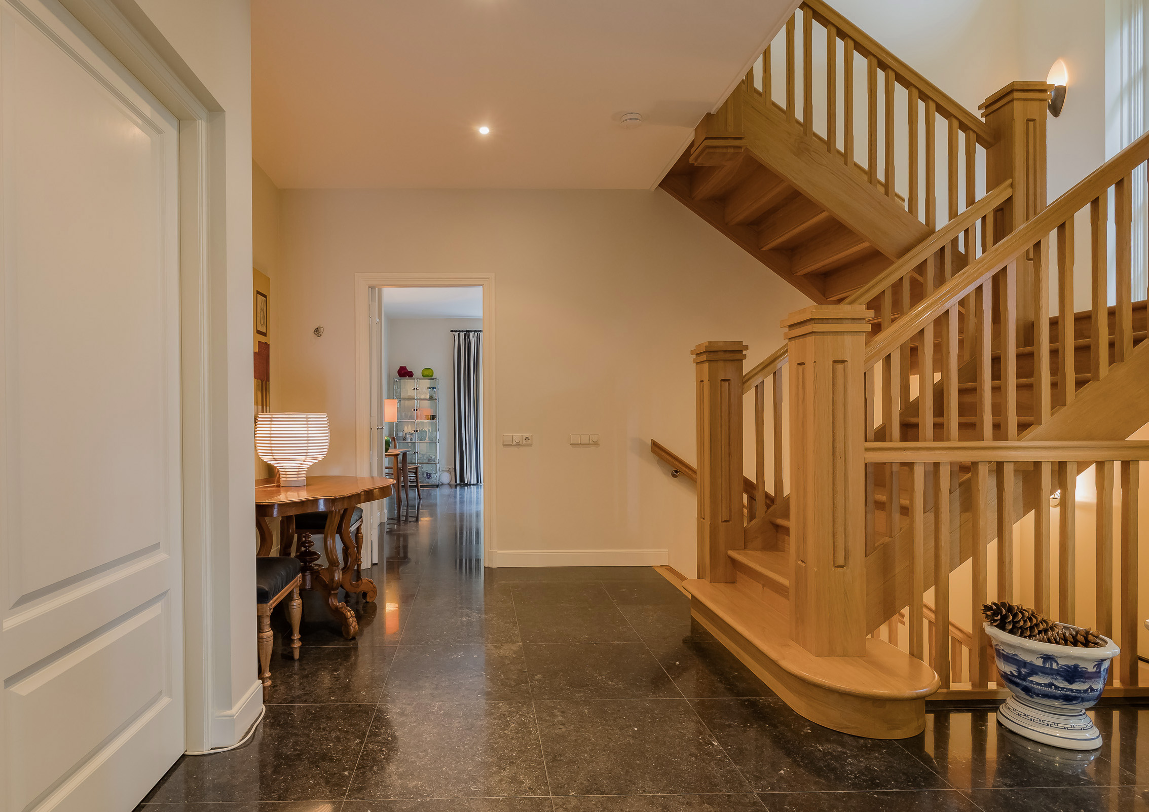 The villa exudes tranquility, space, and elegance. An elegant entrance, richly surrounded by flowers, welcomes you at the door. The spacious hall leads to the cozy living room with fireplace, adjacent dining room, and delightful kitchen with French doors to the garden. A place that invites you to spend long evenings cooking, dining, and enjoying life. A practical utility room and a spacious study on the ground floor complete the picture. All rooms have direct access to the garden, veranda, or one of the balconies.
