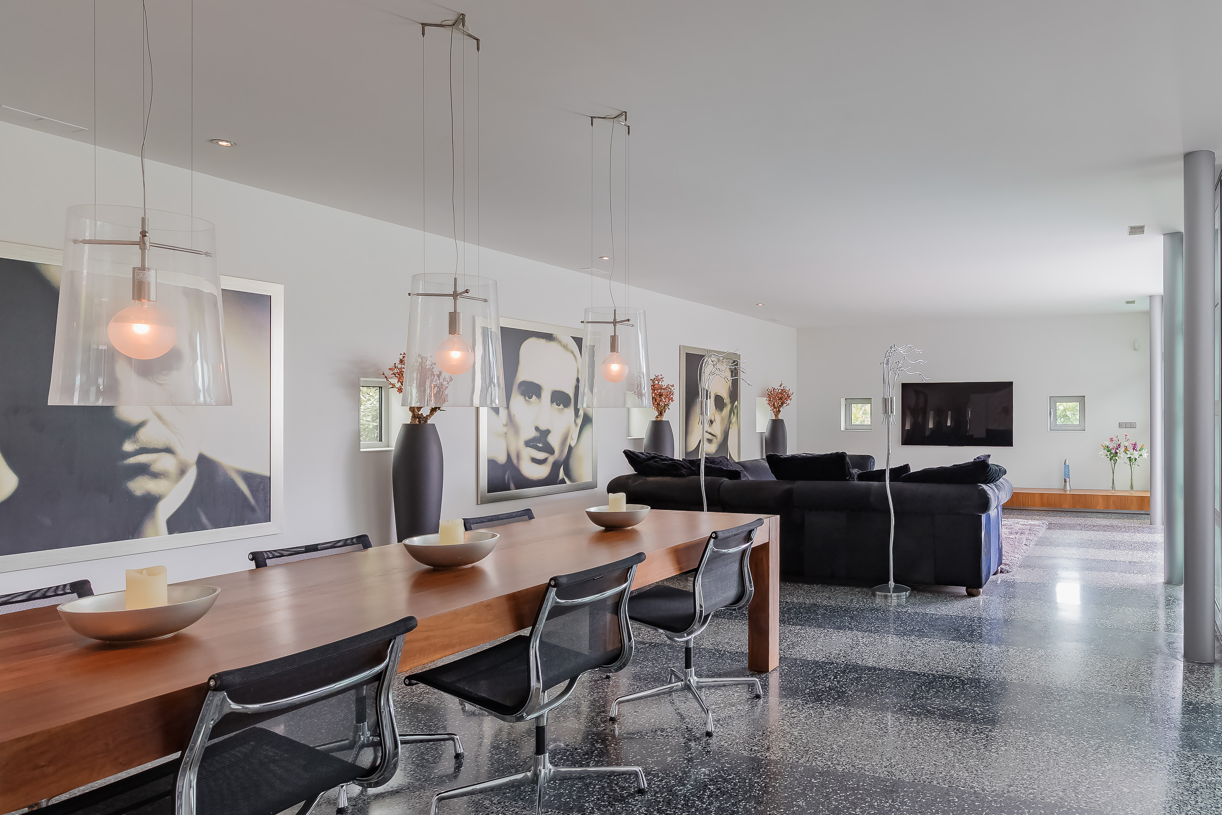 The entire ground floor has a terrazzo floor with underfloor heating. To enhance the indoor/outdoor experience, large sliding doors give access to the garden and the terrazzo floor has been extended to the outside.