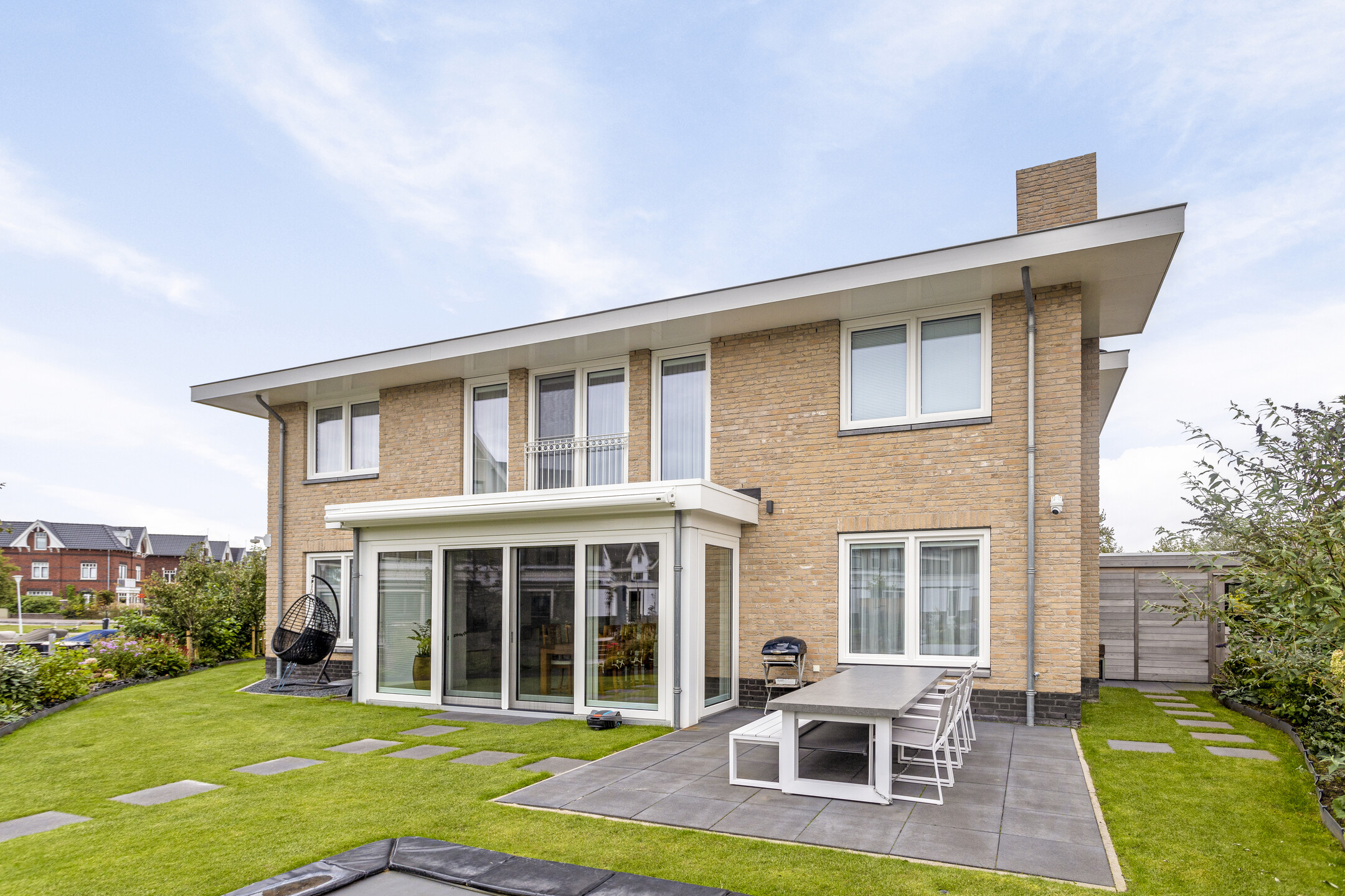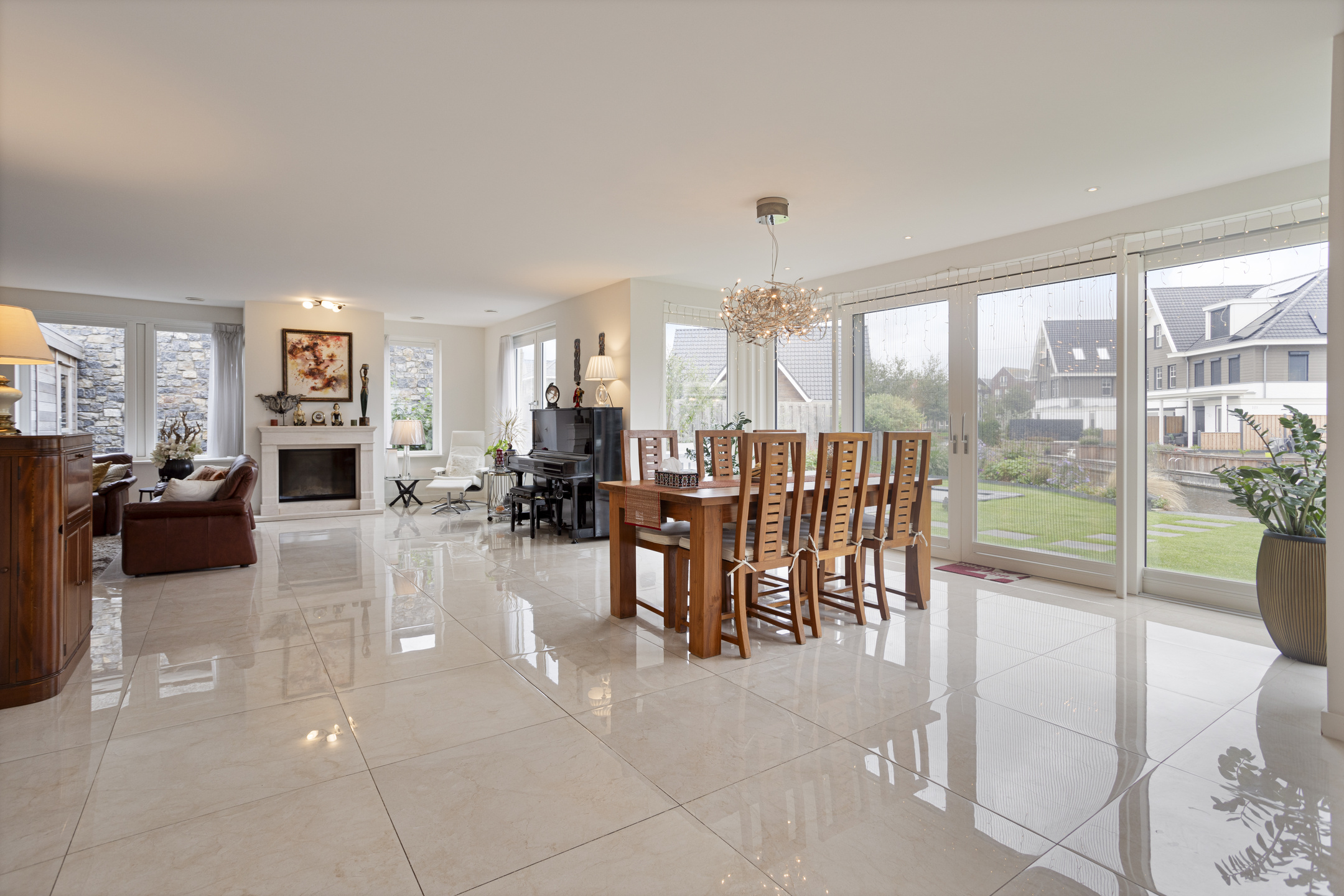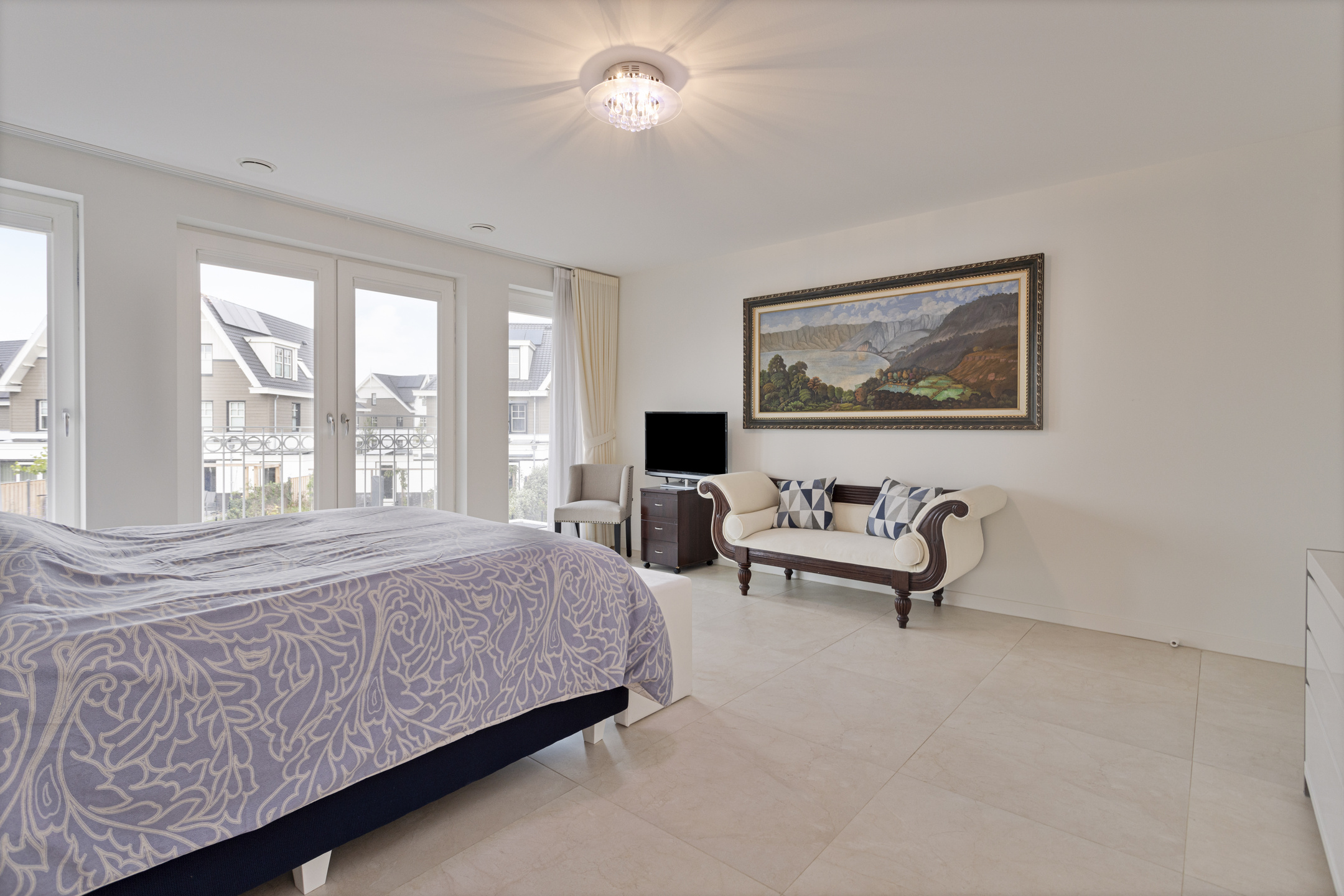 Upstairs, four large bedrooms accompany three elegant bathrooms. The principal suite features an extensive dressing room with crafted storage and a full ensuite. Additional features include a separate laundry, technical room, and a spacious attic. Located near Landskroonpark, with schools, shops, and key amenities easily reached, this luxury villa for sale in Oegstgeest merges a rare waterside setting with true contemporary ease.