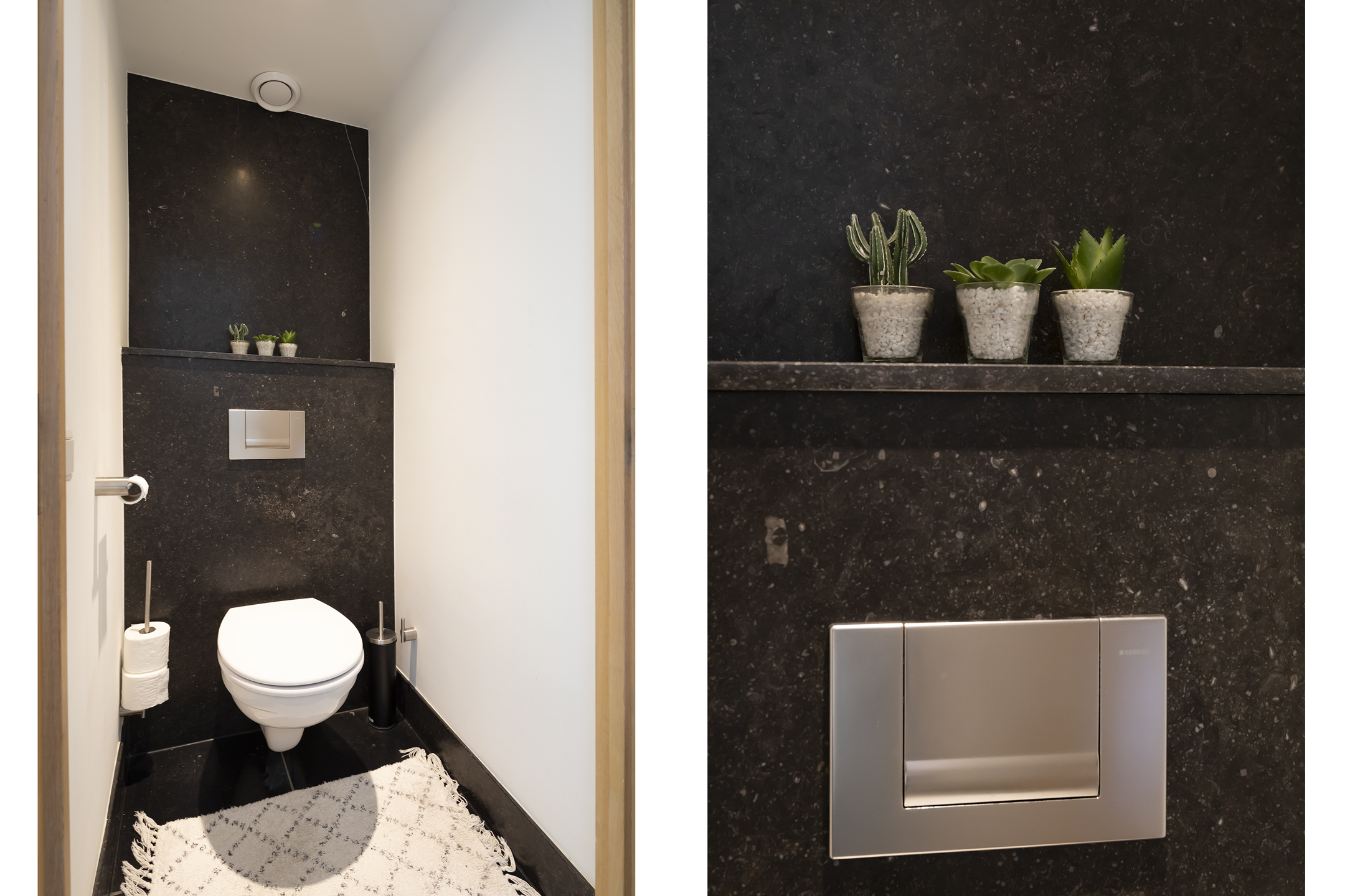 The front door is located on the side of the house, from which you enter the hallway. In this beautiful hall, where the meter cupboard, the toilet room, and the stairs to the first floor are located, you enter the living room through a beautiful glass pivot door.