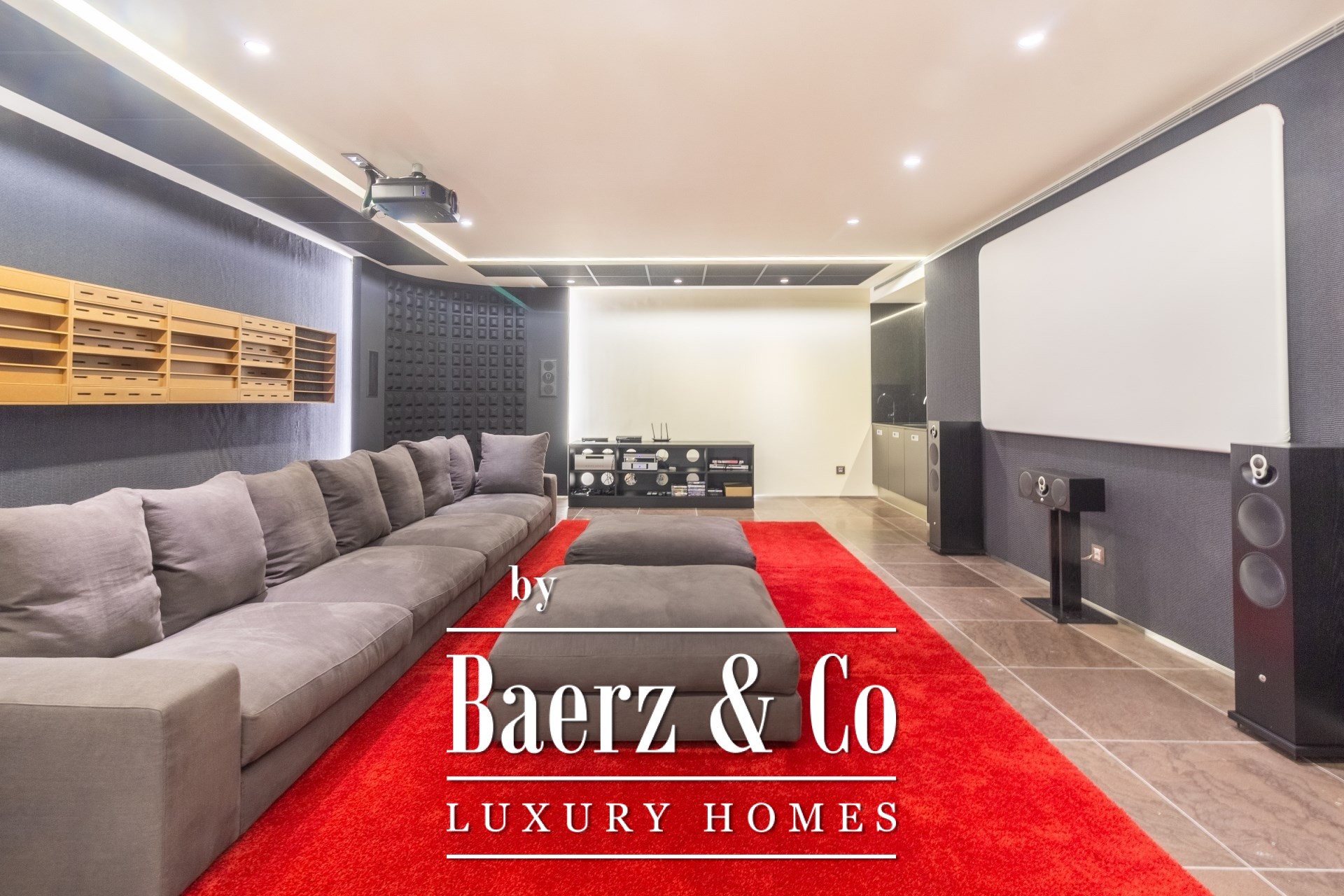 Outdoors, mature gardens surround the pool with its waterfall feature, a barbecue and outdoor kitchen, and expansive chill-out spaces. Underfloor heating, ducted air conditioning, electric windows, integrated audio, complete surveillance, and an elevator underscore the emphasis on comfort and security.
