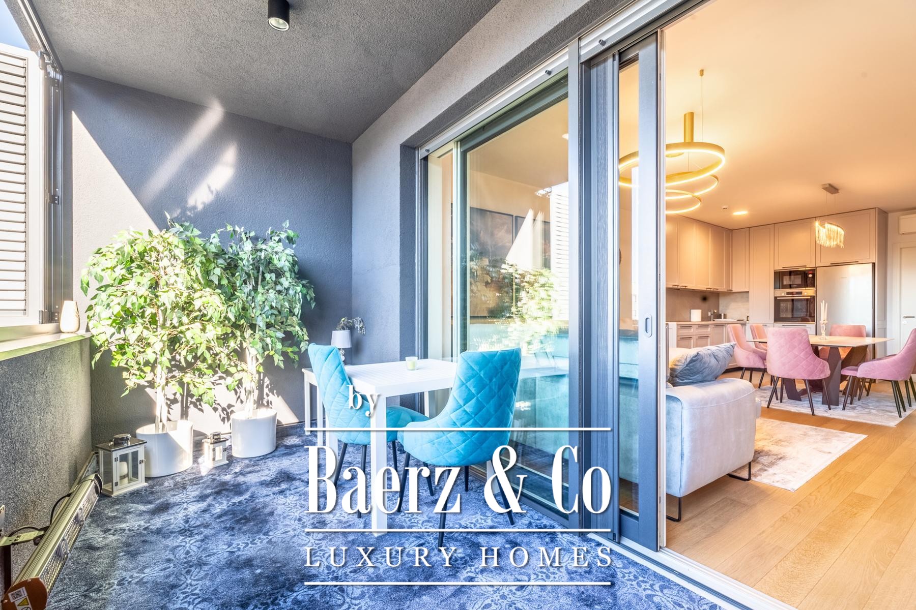 The apartment embodies contemporary design and superior build quality. Its open-plan layout forms a central heart, with a custom-made kitchen, dining area, and living room that flow seamlessly onto the private loggia. The master suite includes an en-suite bathroom, while two further rooms serve flexibly as bedrooms or studies. Additional comforts include a separate guest toilet, laundry room, and precisely integrated built-in wardrobes.