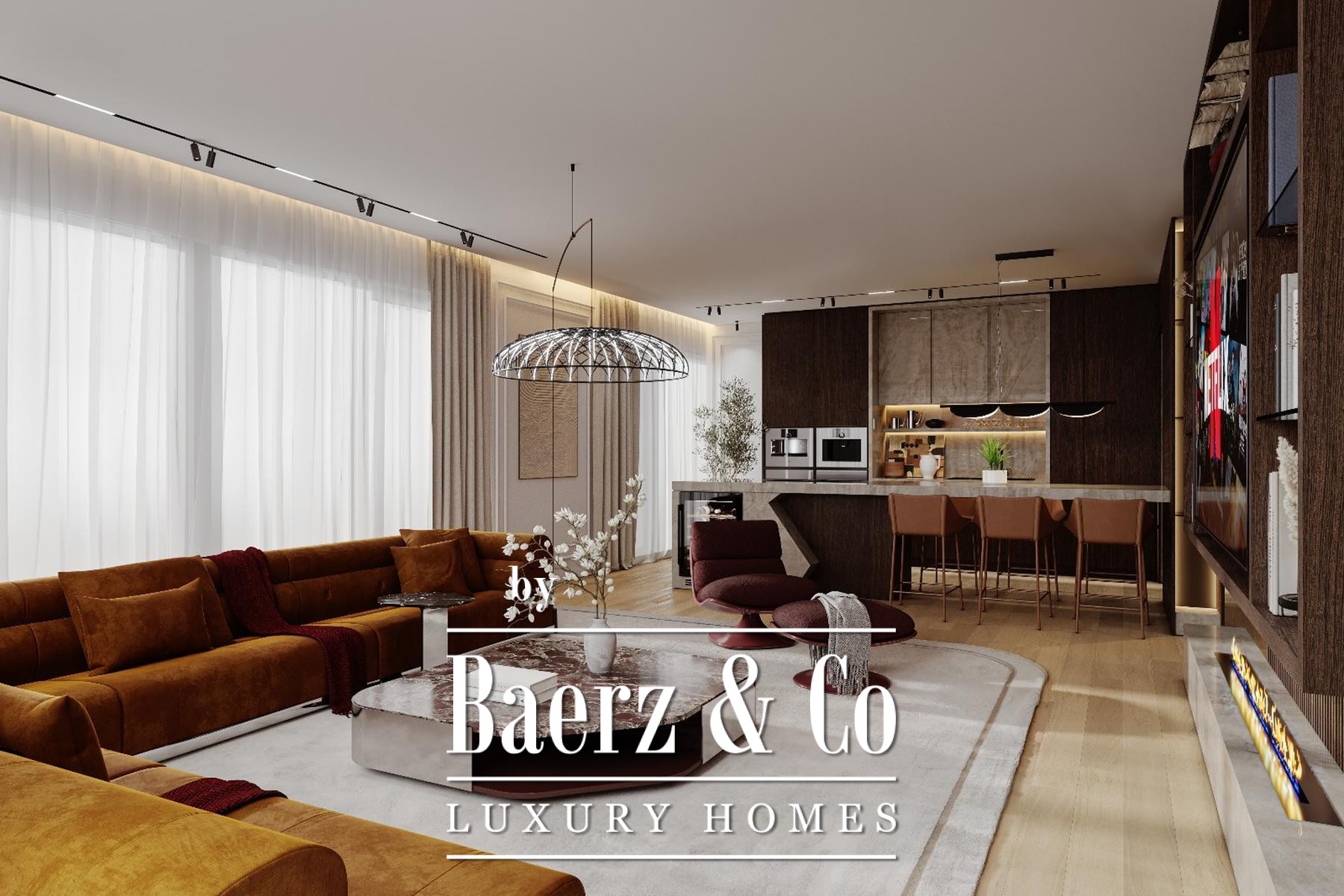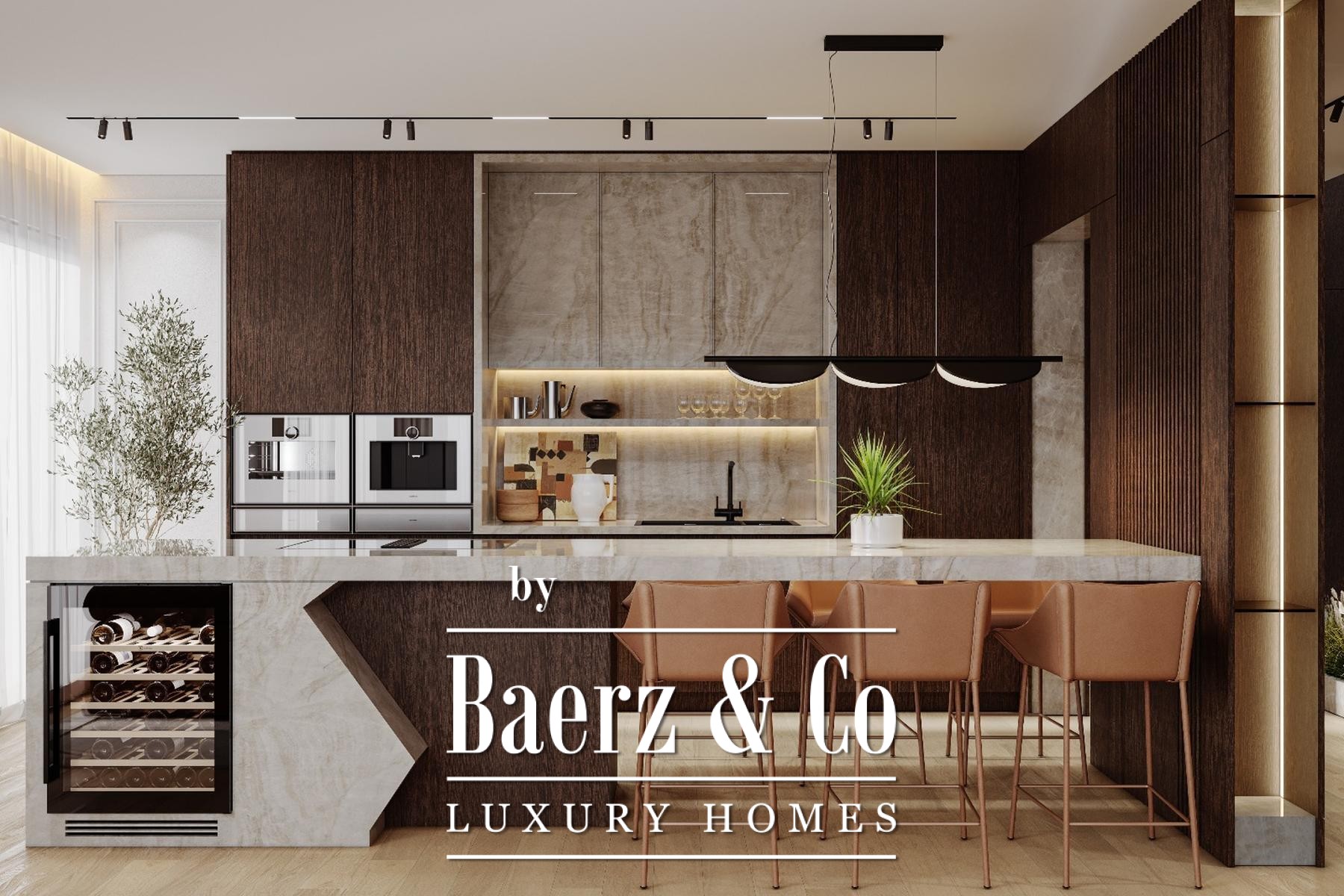 Ascending to the ground floor, a graphic open-plan living and dining area adjoins a well-appointed kitchen, connecting seamlessly to an expansive terrace with a private swimming pool and dedicated sunbathing space. The first floor holds three en suite bedrooms, each with balcony access and unobstructed Adriatic views, while a fourth bedroom is located on the ground level for accessibility and ease.