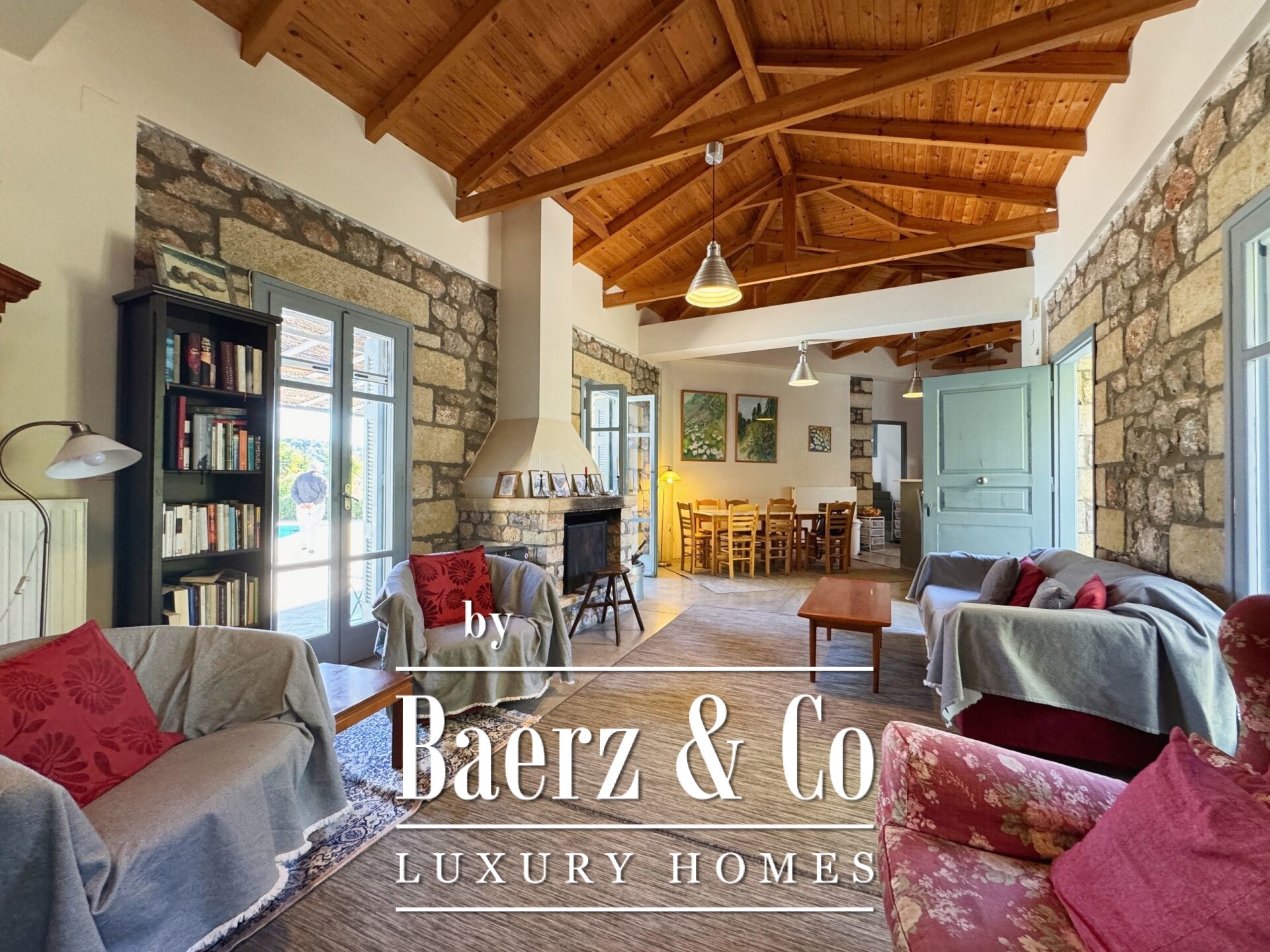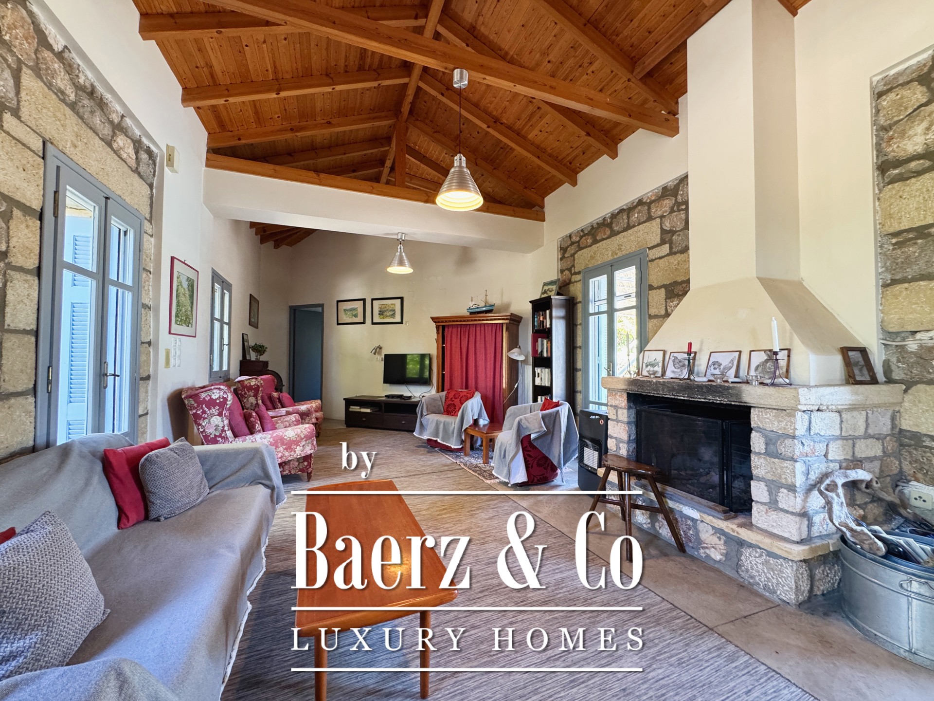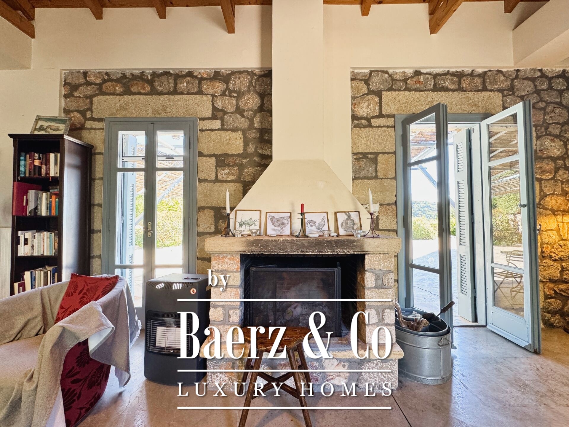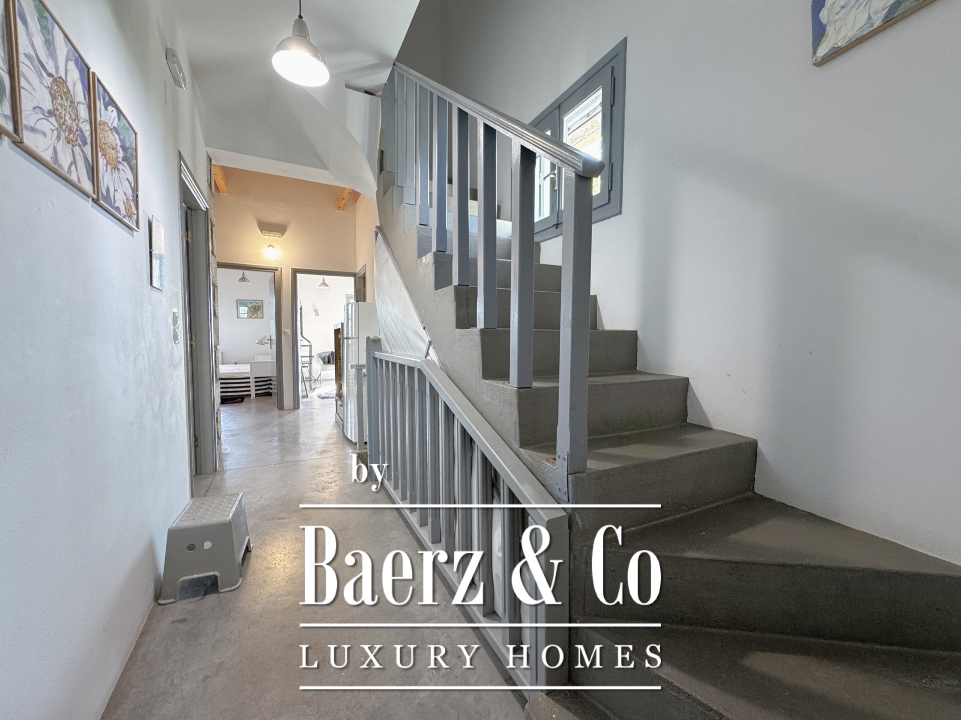 The residence is characterized by meticulous stone construction and a carefully considered design. The ground floor opens to an expansive living space and kitchen, five bedrooms, and four bathrooms, each finished to a high standard, ensuring privacy and comfort whether for family or guests. Internal hallways wind toward two distinct stone towers, each hosting a bedroom with a unique sense of place, offering separation within the home and a rare architectural rhythm.