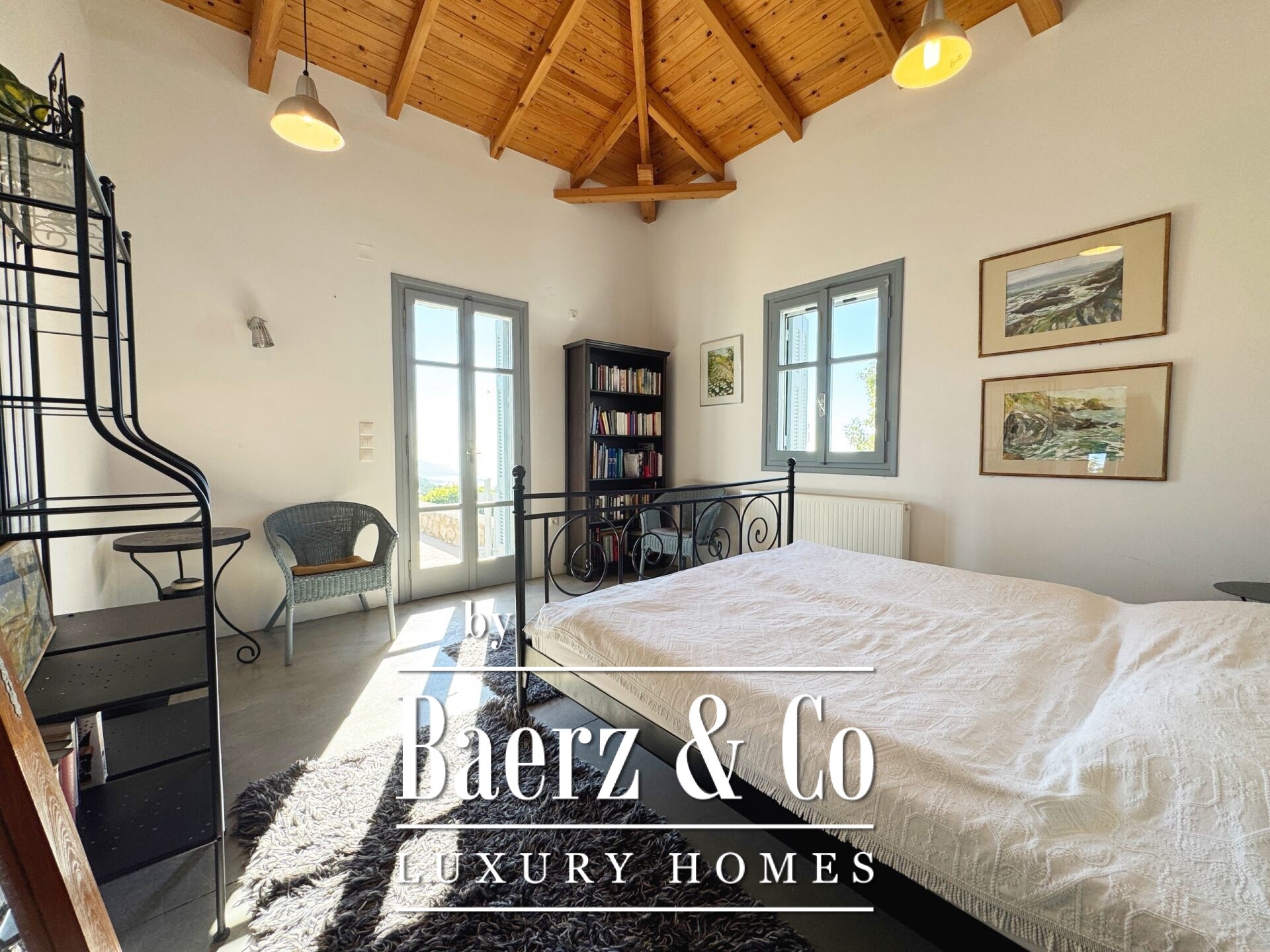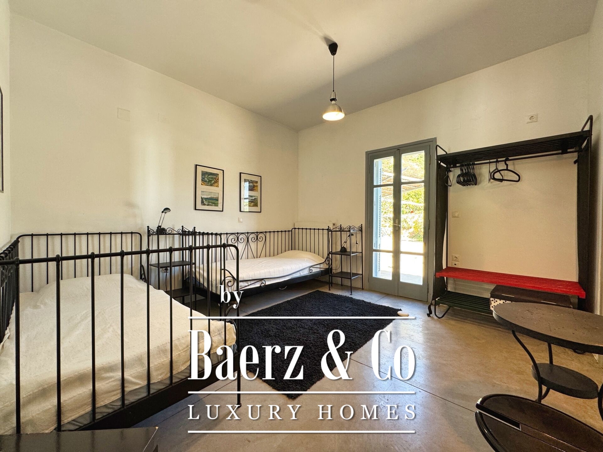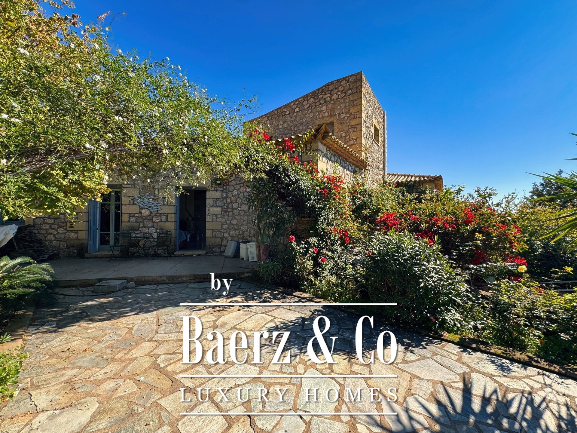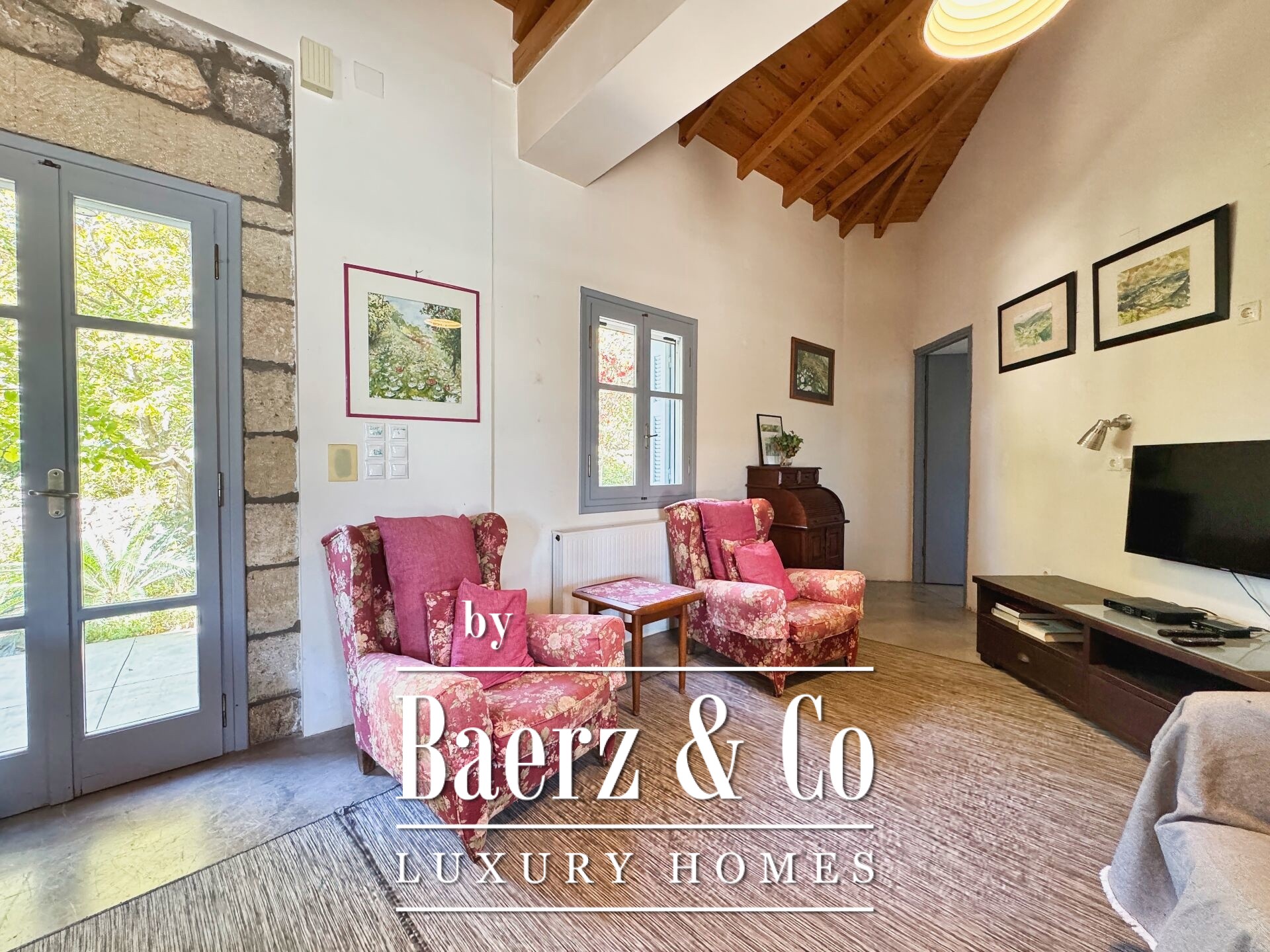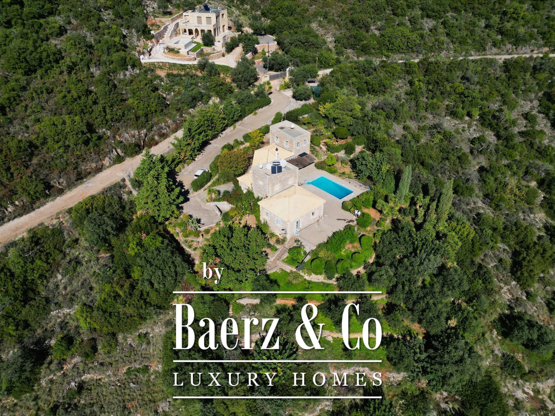 The residence is characterized by meticulous stone construction and a carefully considered design. The ground floor opens to an expansive living space and kitchen, five bedrooms, and four bathrooms, each finished to a high standard, ensuring privacy and comfort whether for family or guests. Internal hallways wind toward two distinct stone towers, each hosting a bedroom with a unique sense of place, offering separation within the home and a rare architectural rhythm.