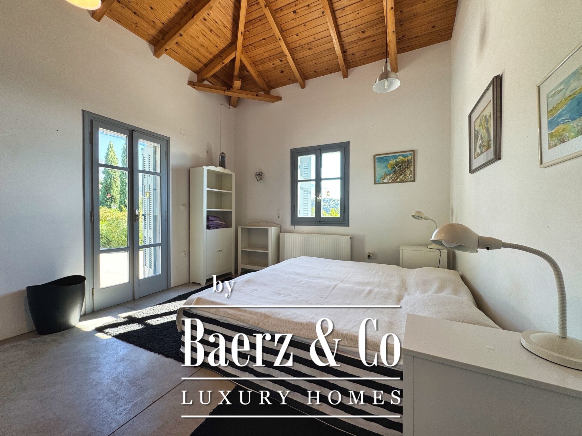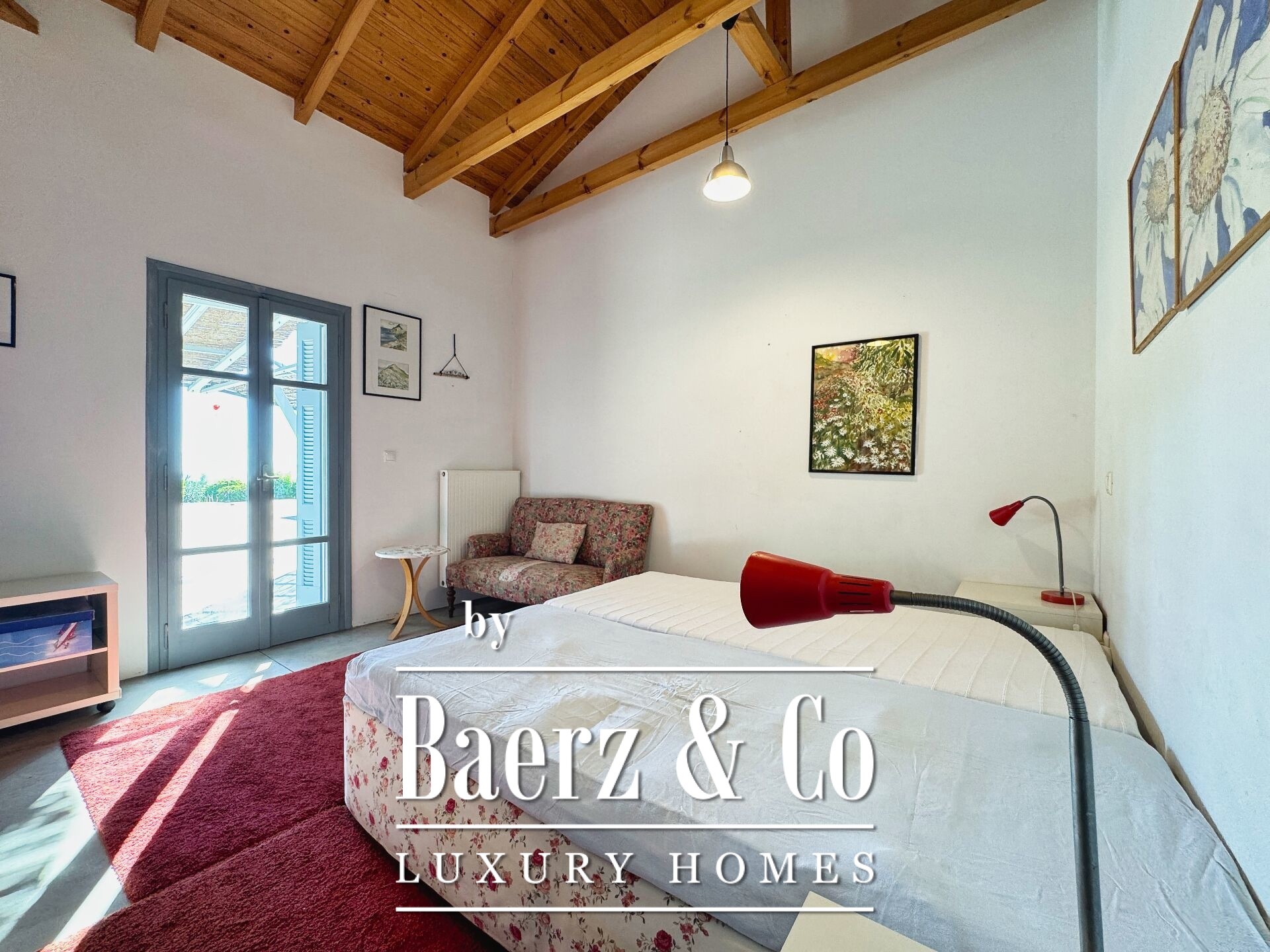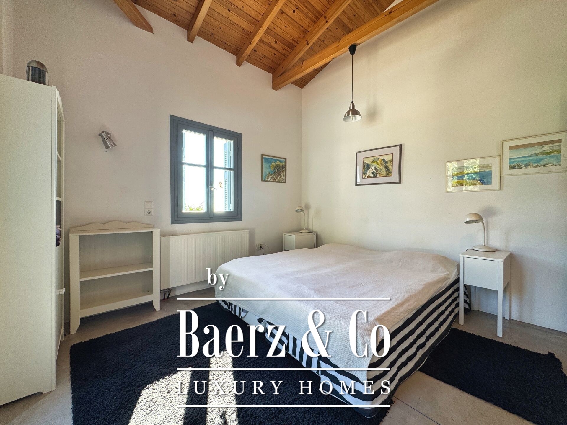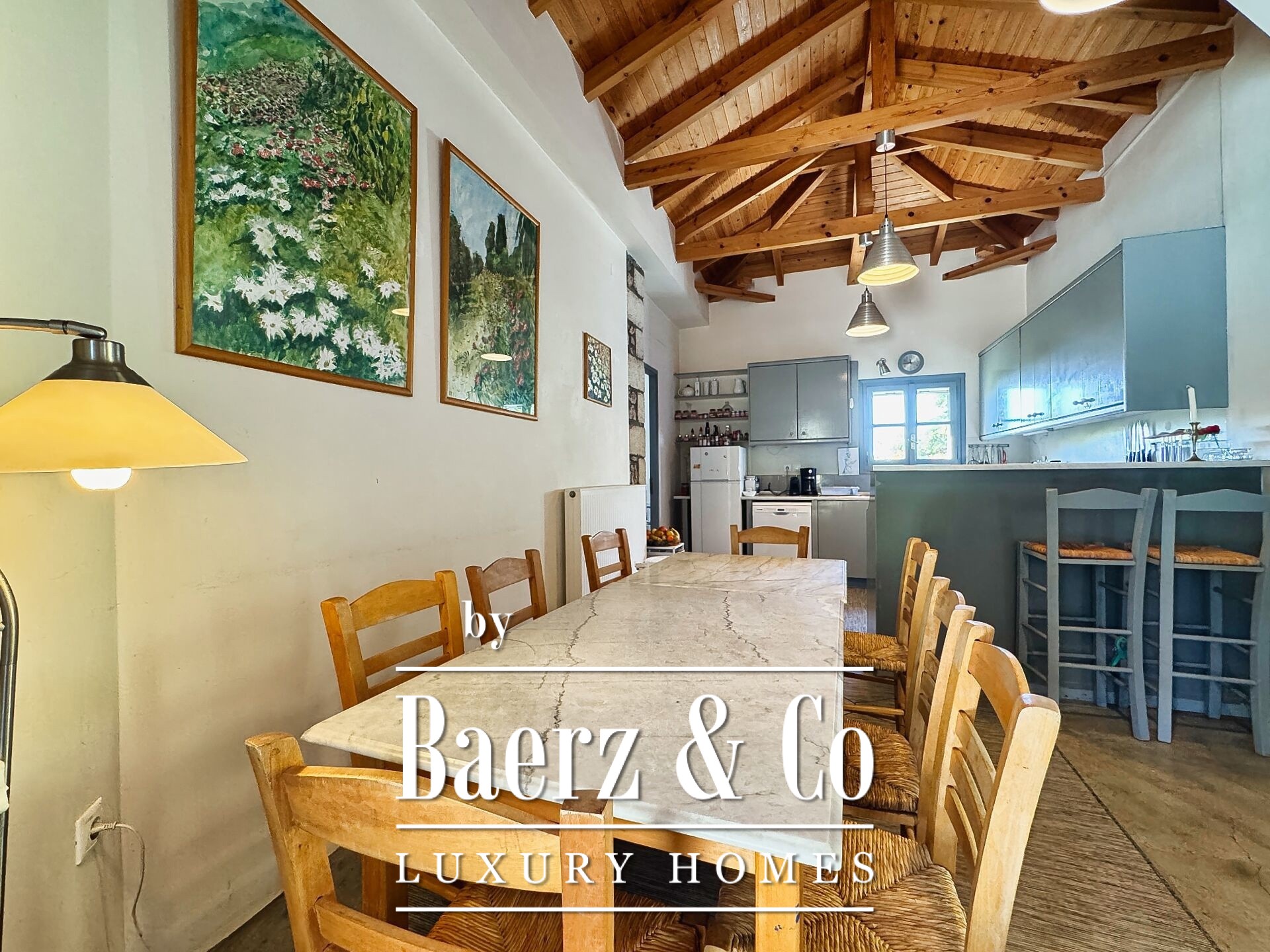The residence is characterized by meticulous stone construction and a carefully considered design. The ground floor opens to an expansive living space and kitchen, five bedrooms, and four bathrooms, each finished to a high standard, ensuring privacy and comfort whether for family or guests. Internal hallways wind toward two distinct stone towers, each hosting a bedroom with a unique sense of place, offering separation within the home and a rare architectural rhythm.