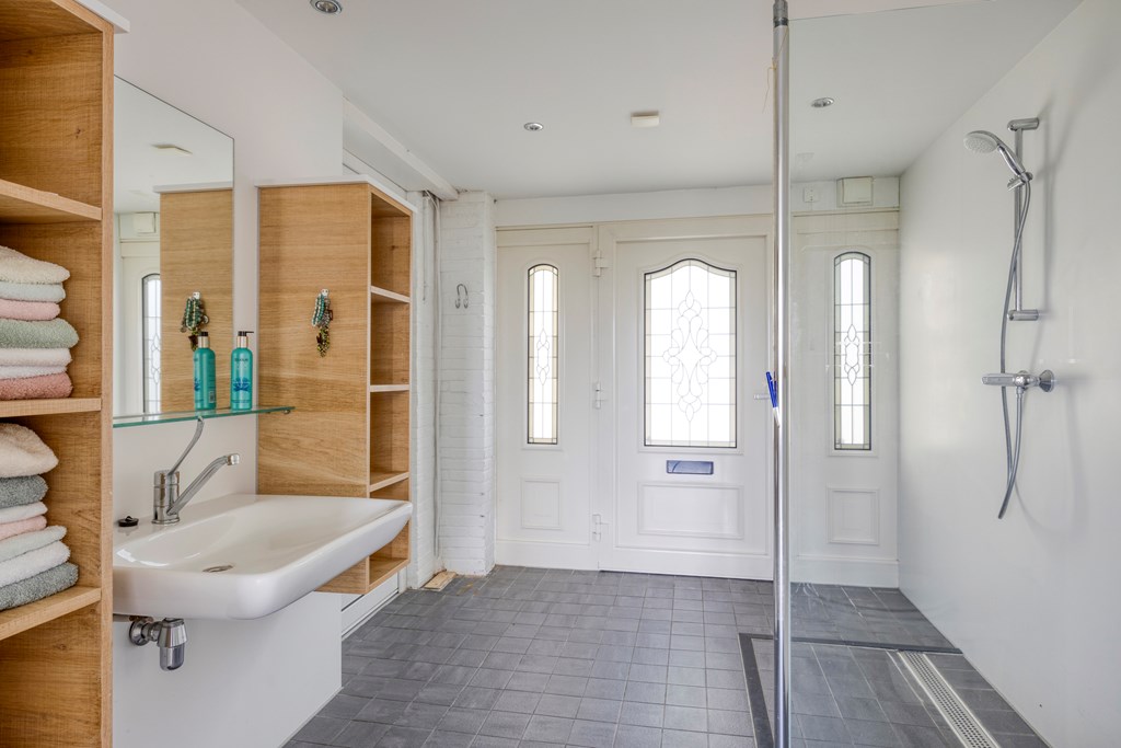 A bathroom on the ground floor is a unique feature, enabling single-level living. Fully tiled, it includes a shower with glass screen, toilet, washbasin, and storage unit—adding comfort and ease of use.