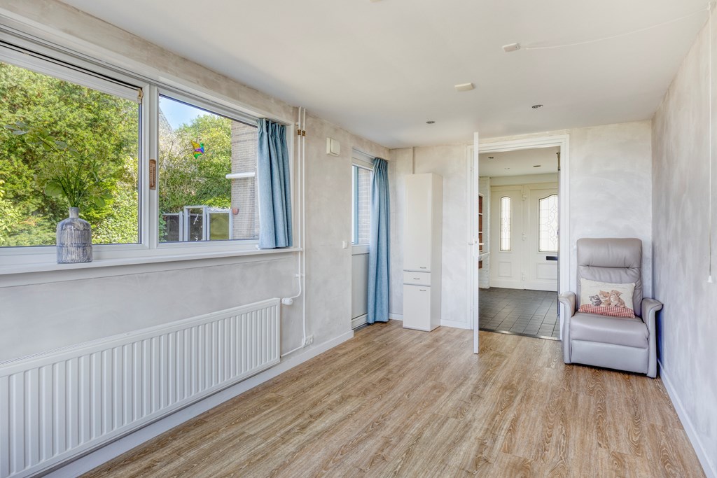 The living room is the heart of the home and exudes warmth thanks to the combination of large windows, a cozy fireplace, and characterful wooden support beams. The open layout offers plenty of scope for arranging a sitting area and dining space, while the sliding door to the garden creates a direct connection to the outdoors. Thanks to the air conditioning, this room is comfortable in every season.