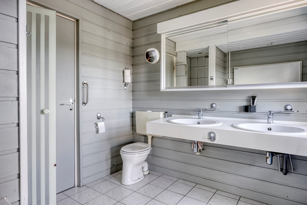 The first-floor bathroom is generously sized and includes a shower, bathtub, toilet, and double washbasin with storage unit. From this room there is also access to the roof terrace—a unique bonus for those who enjoy fresh air and privacy.