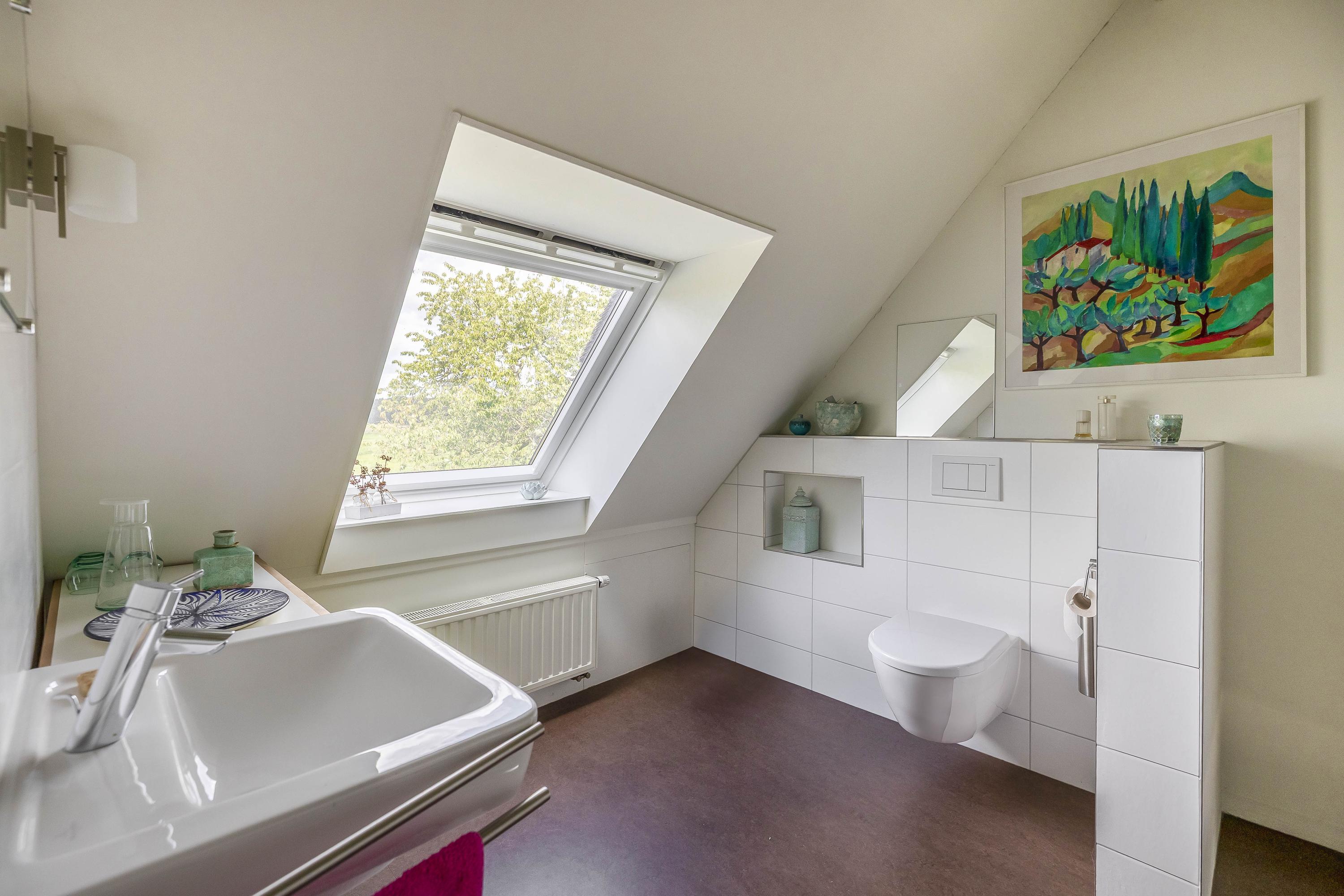 The bathroom on this floor is separated from the landing by a glass wall with a glass door. It has vinyl flooring and the walls are partially tiled. A large Velux skylight provides the necessary light. The bathroom is equipped with a wall-mounted toilet, a washbasin with mixer tap, and a shower cubicle with thermostatic tap, which can be closed off with a sliding door.