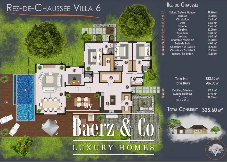 With a surface area of 325 m², the villa comprises :
