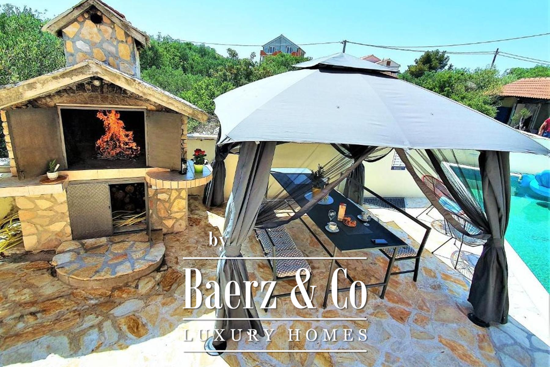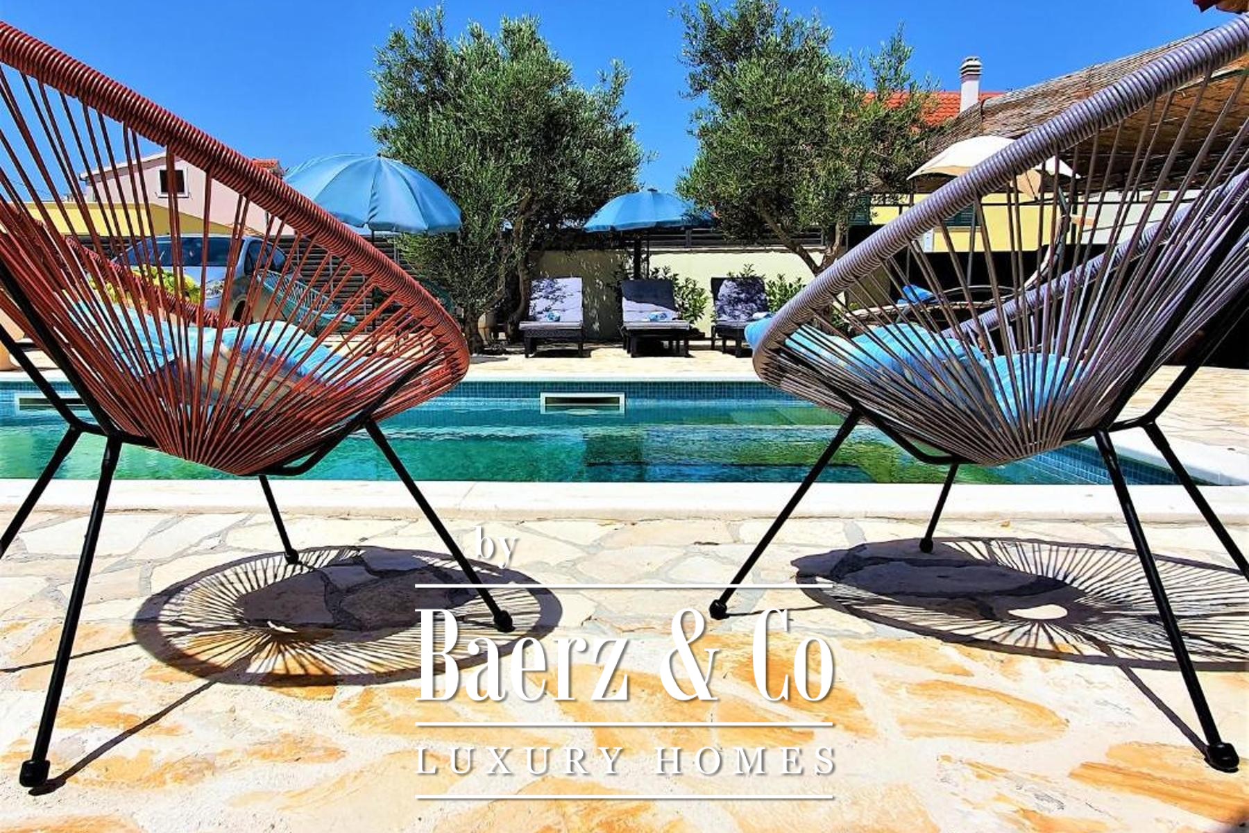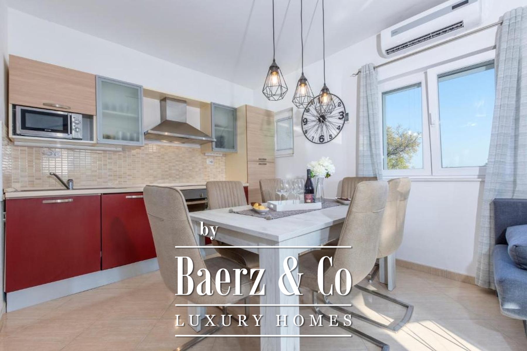On the second floor, two studio apartments benefit from their own bathrooms, kitchenette-living areas, and private terraces opening towards the Adriatic, framing unobstructed sea views. The garden embraces a large swimming pool, sunbathing zone, and grill area, with six parking spaces available, including two covered. Located 500 meters from the coast in a quiet enclave of Rogoznica, this apartment house balances tranquil seclusion with proximity to the sea, offering an appealing prospect for both private enjoyment and discerning investment.