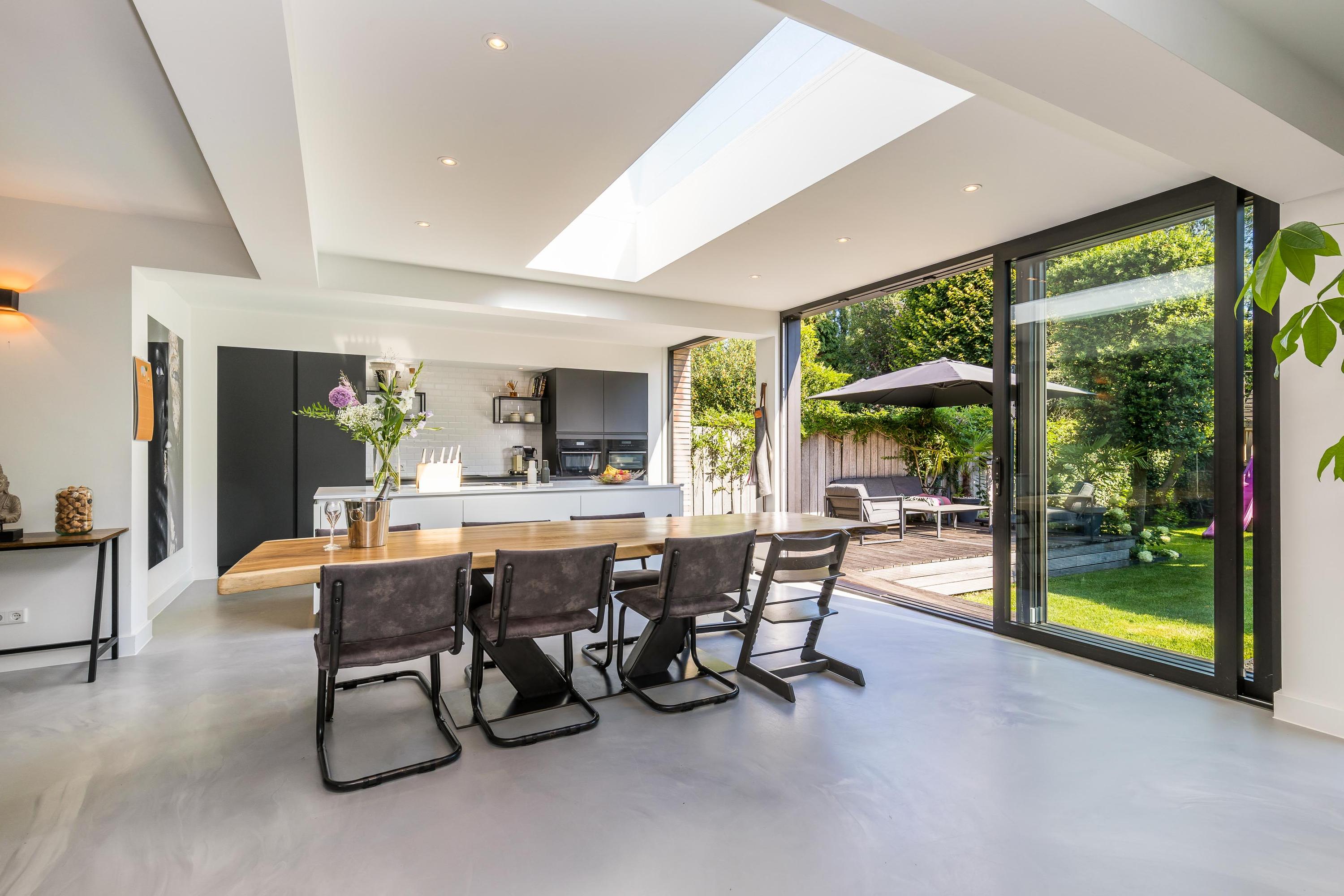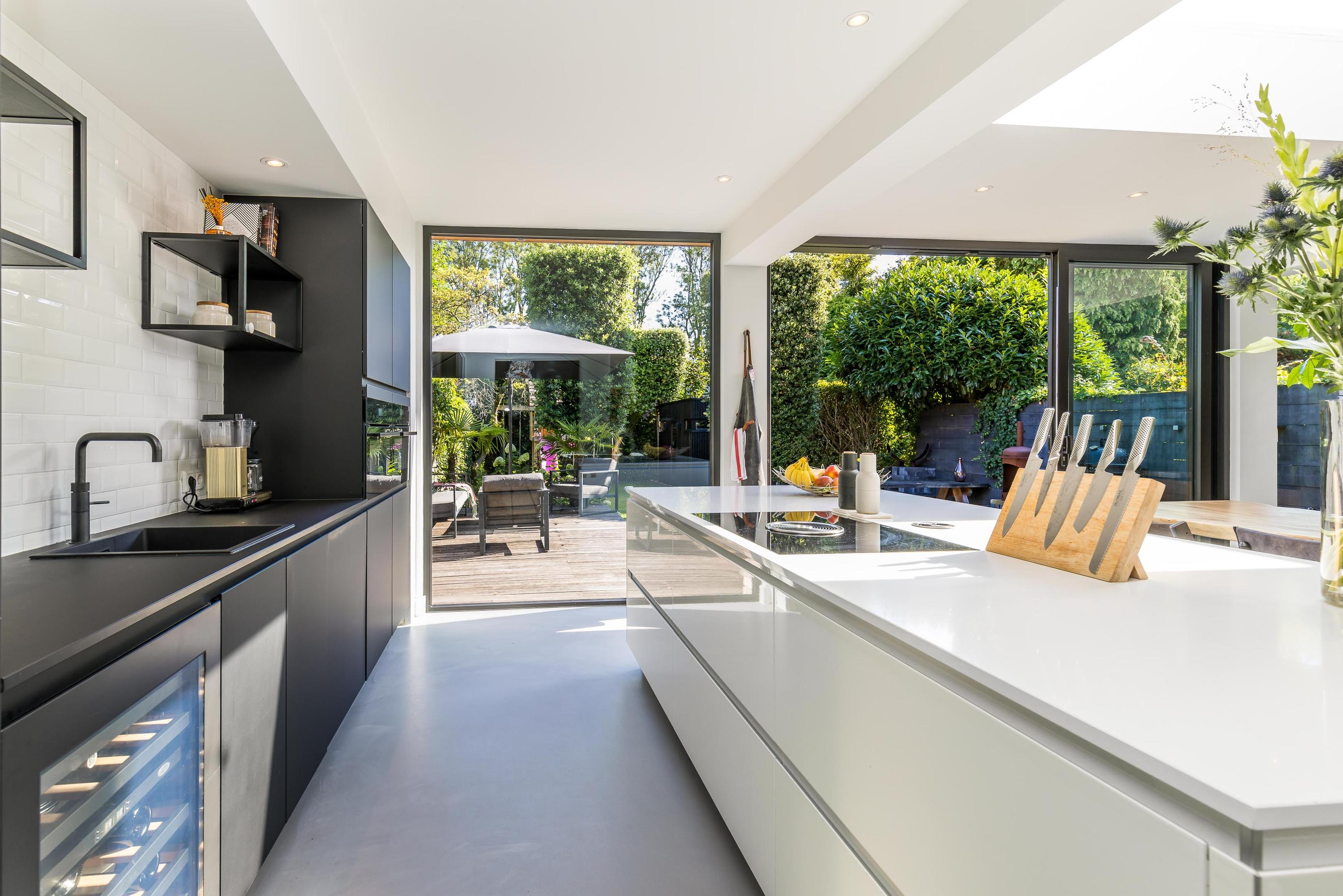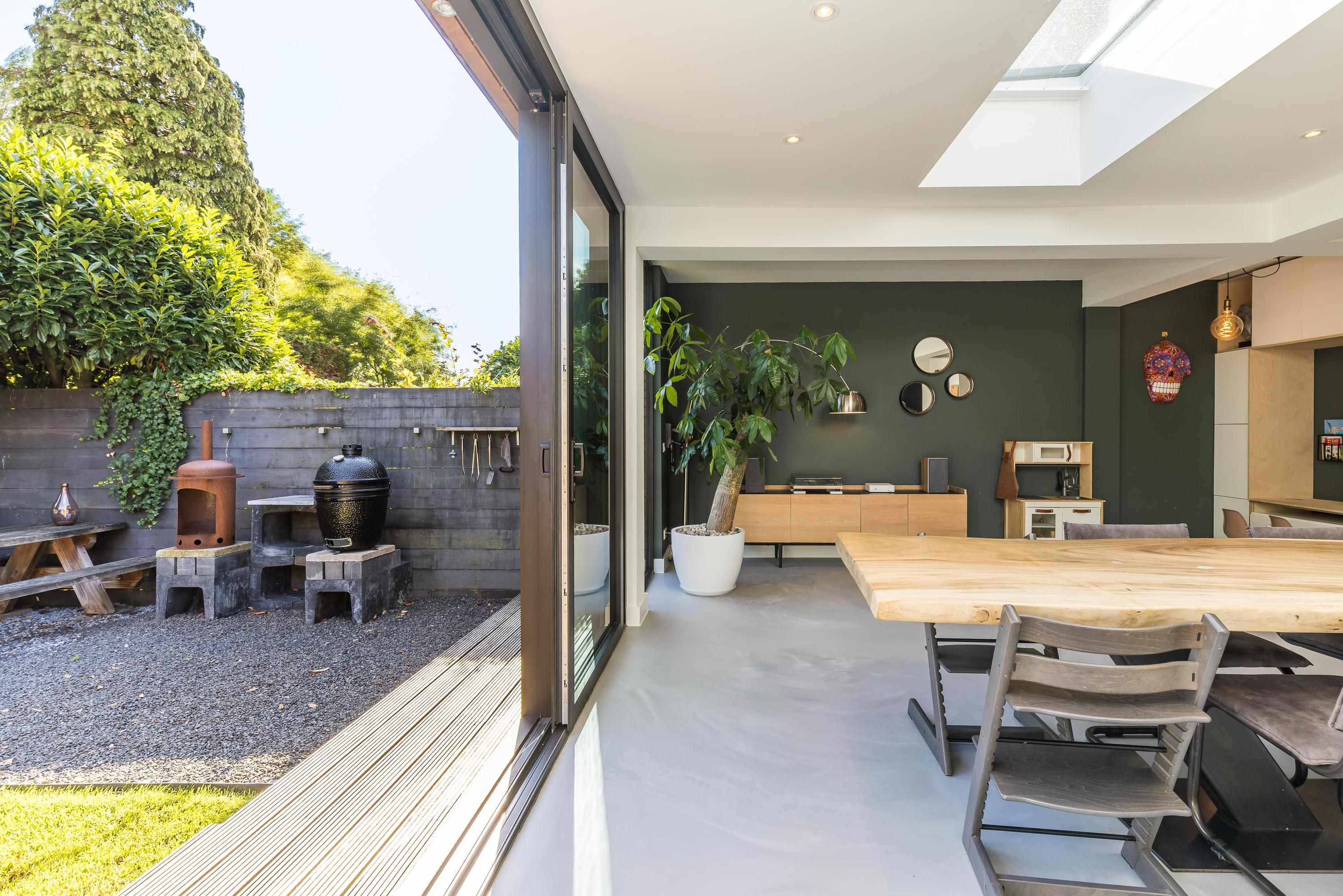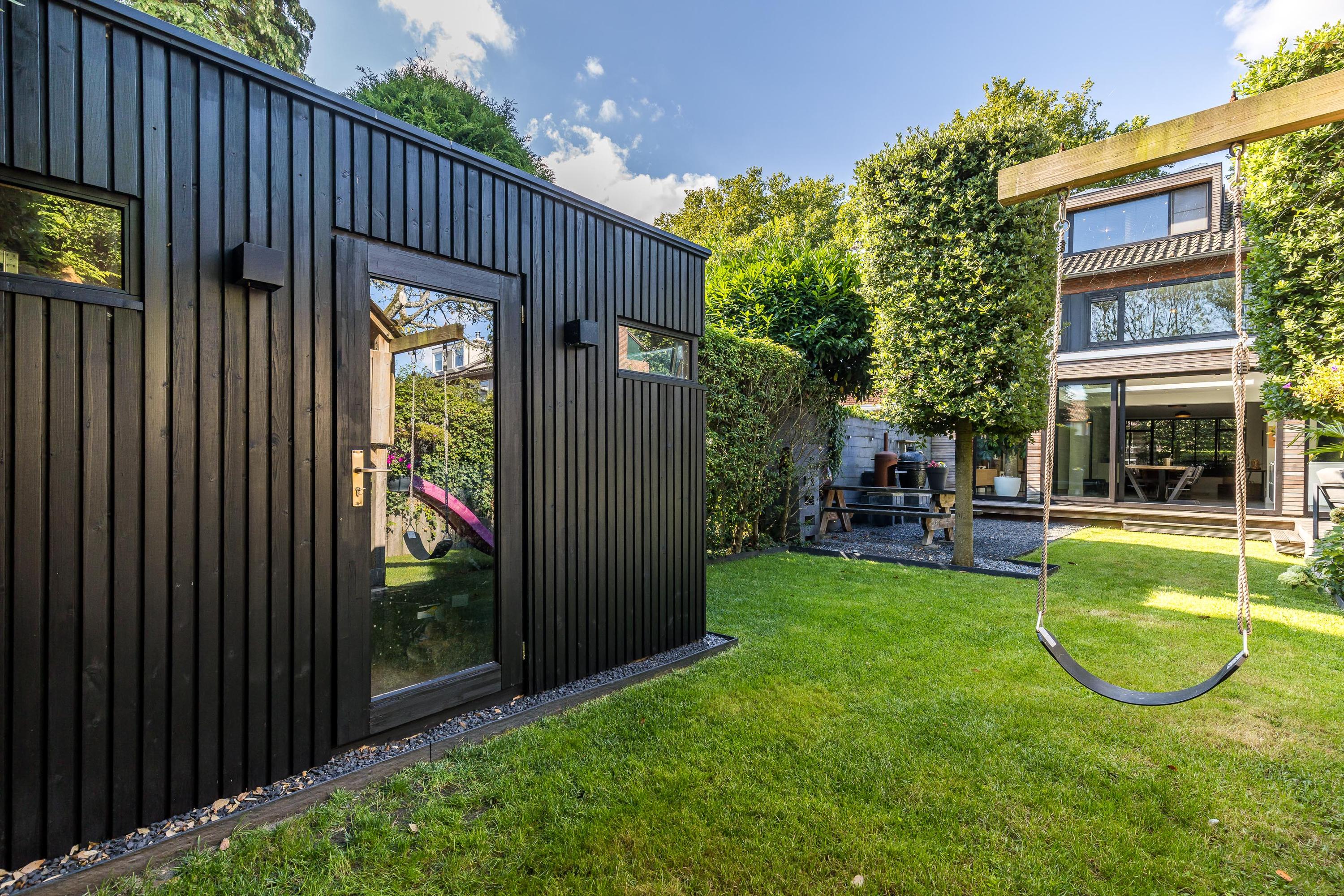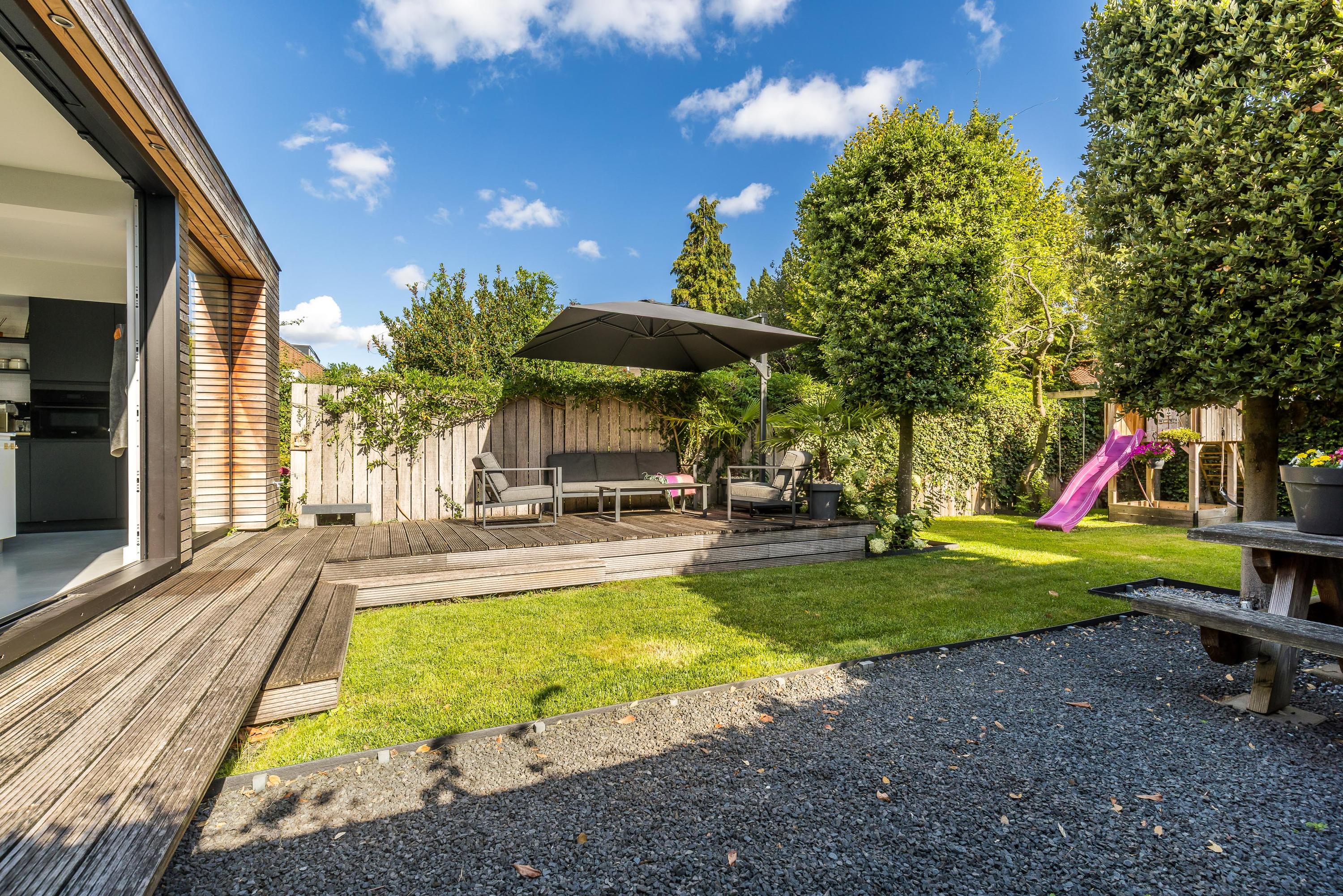 Light defines the interiors. A full-width glass façade with double sliding doors marries the large living space to a sunny, deep back garden, where privacy and child-friendly design coexist. The open kitchen is fitted with high-end appliances including a wine climate cabinet and connects easily to a practical utility room. Details such as double glazing, air conditioning, mechanical ventilation, fibre optic cable, alarm, and twelve solar panels installed in 2023 speak to modern comfort and energy consciousness.