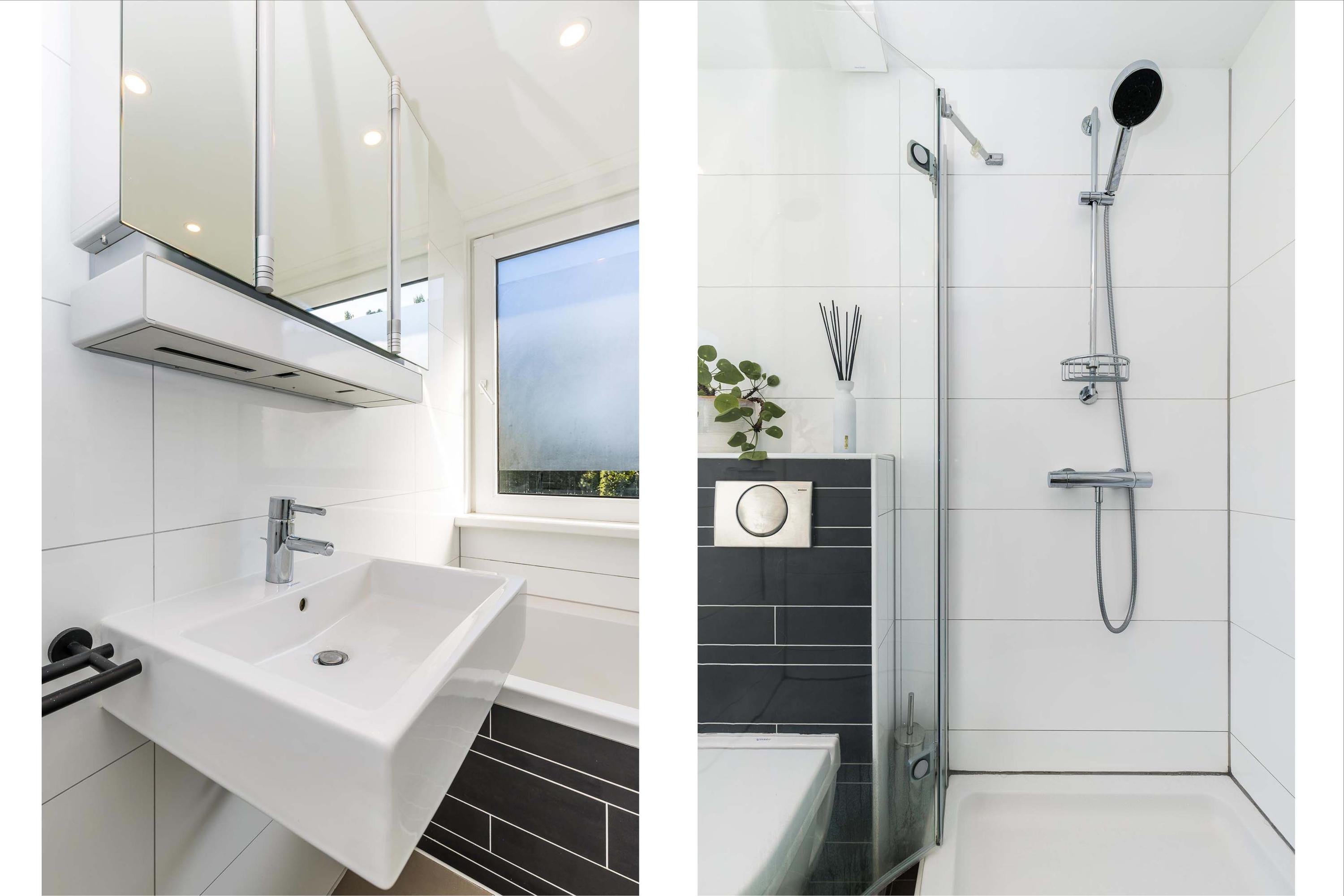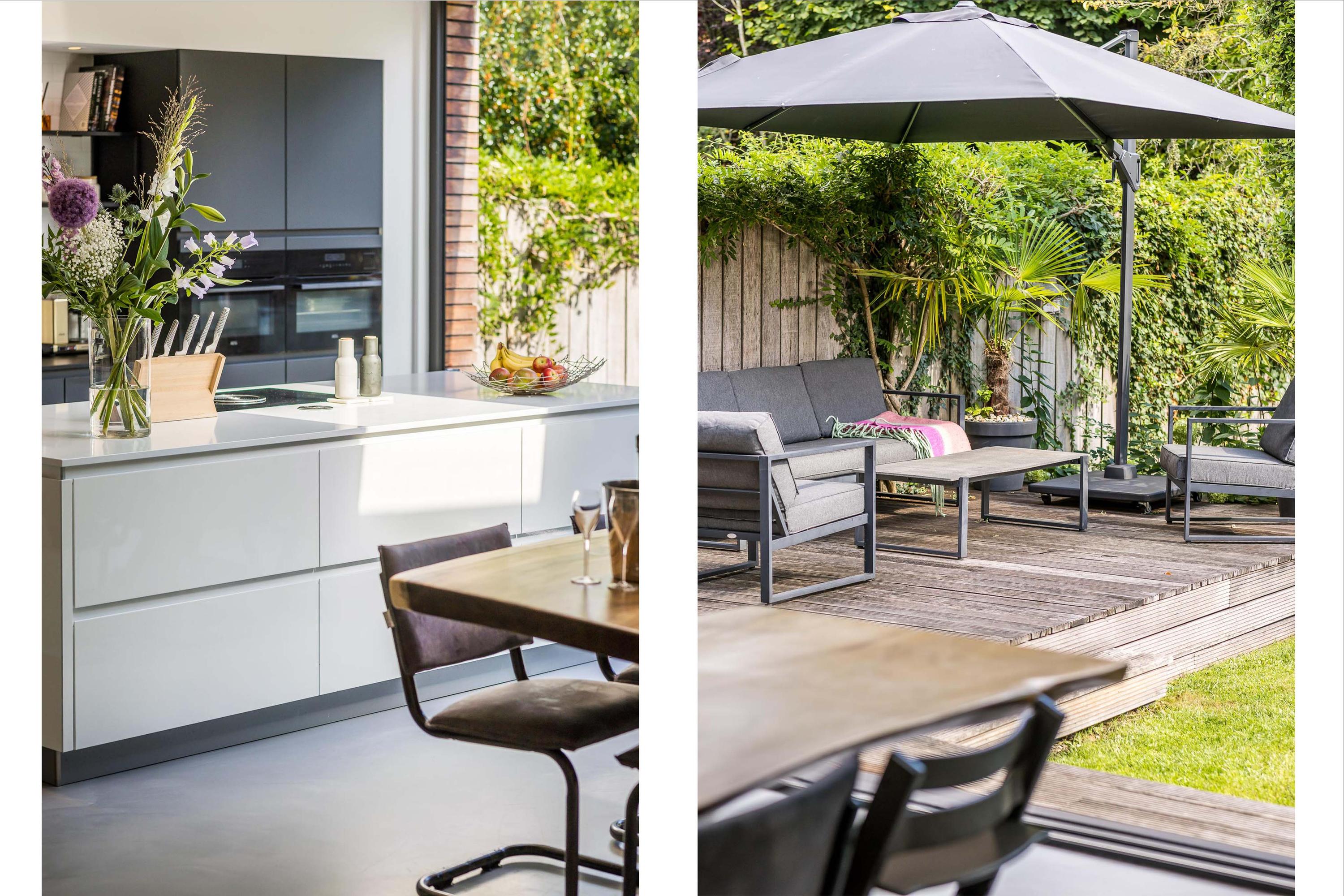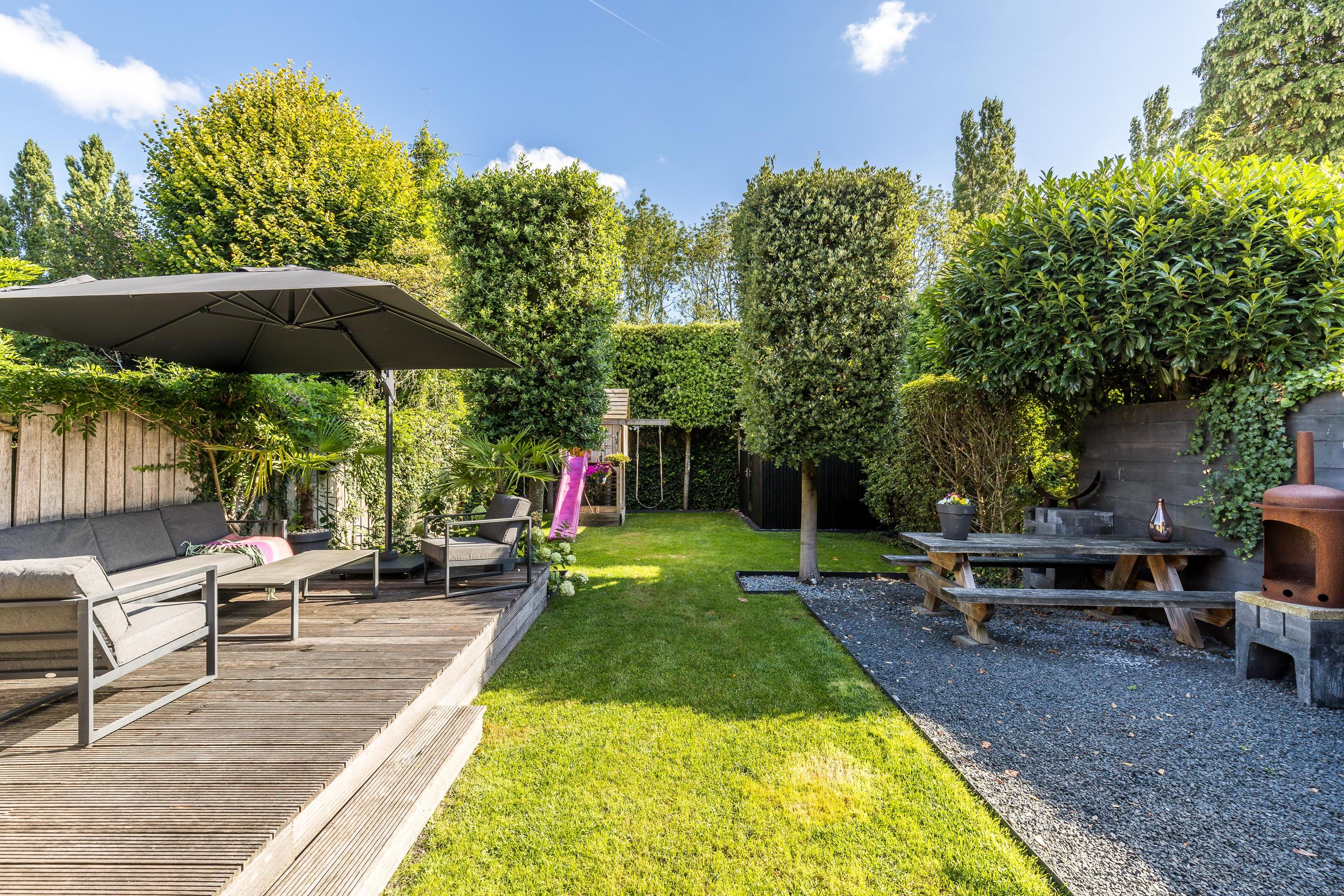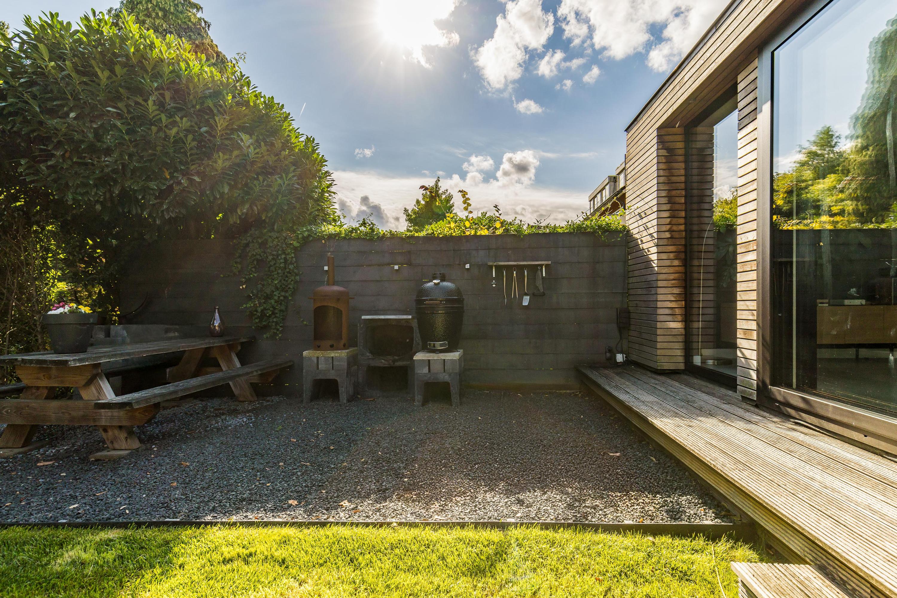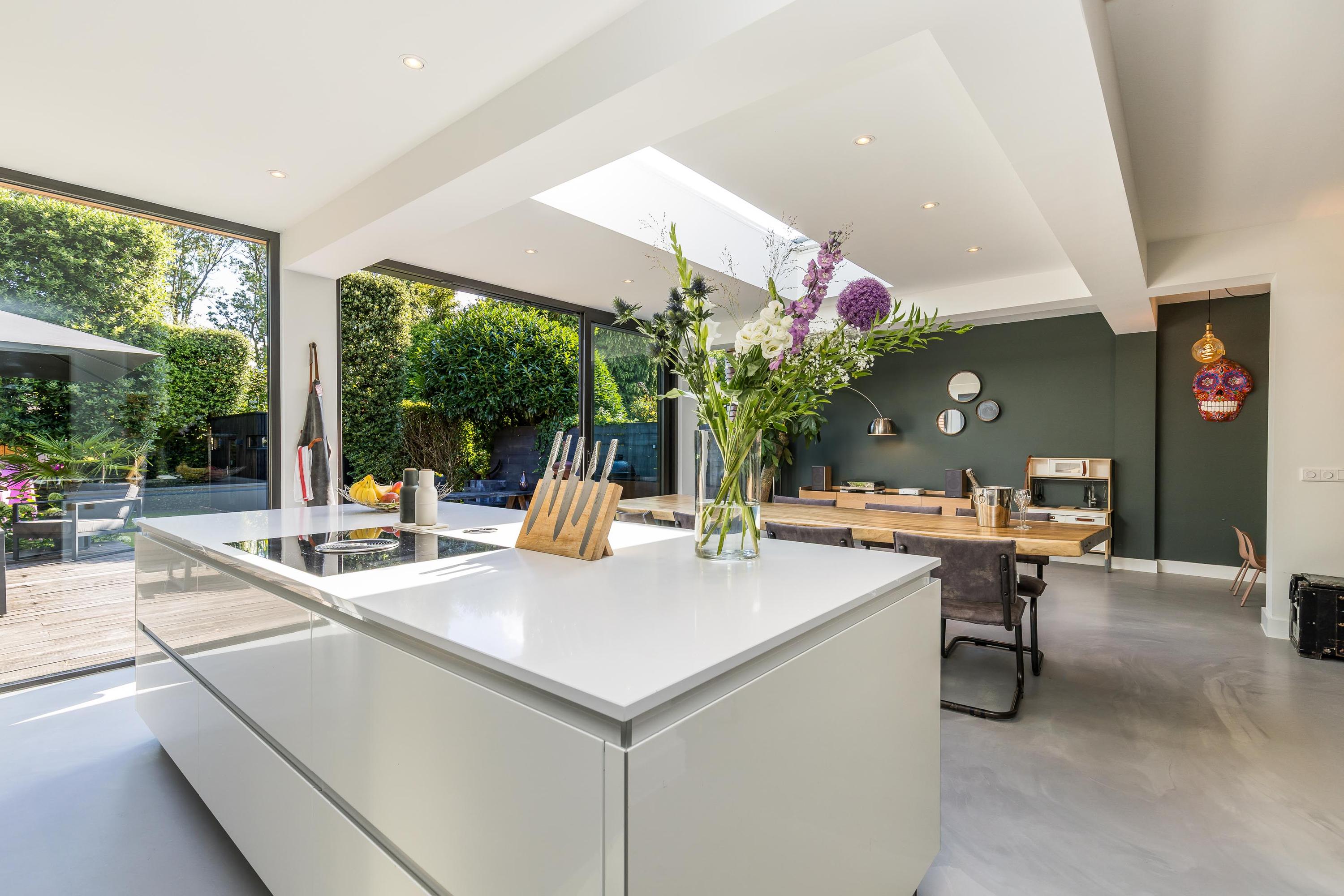 Light defines the interiors. A full-width glass façade with double sliding doors marries the large living space to a sunny, deep back garden, where privacy and child-friendly design coexist. The open kitchen is fitted with high-end appliances including a wine climate cabinet and connects easily to a practical utility room. Details such as double glazing, air conditioning, mechanical ventilation, fibre optic cable, alarm, and twelve solar panels installed in 2023 speak to modern comfort and energy consciousness.