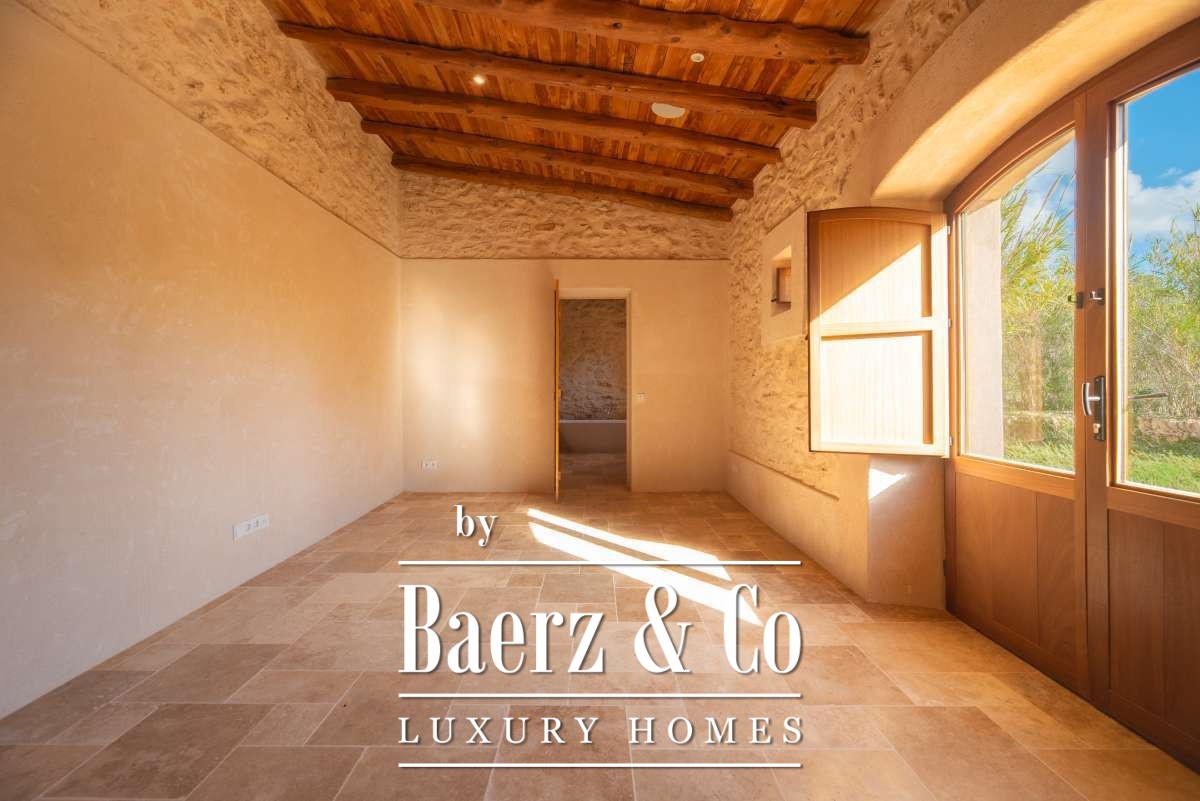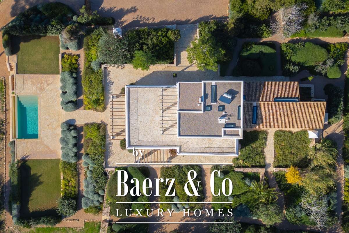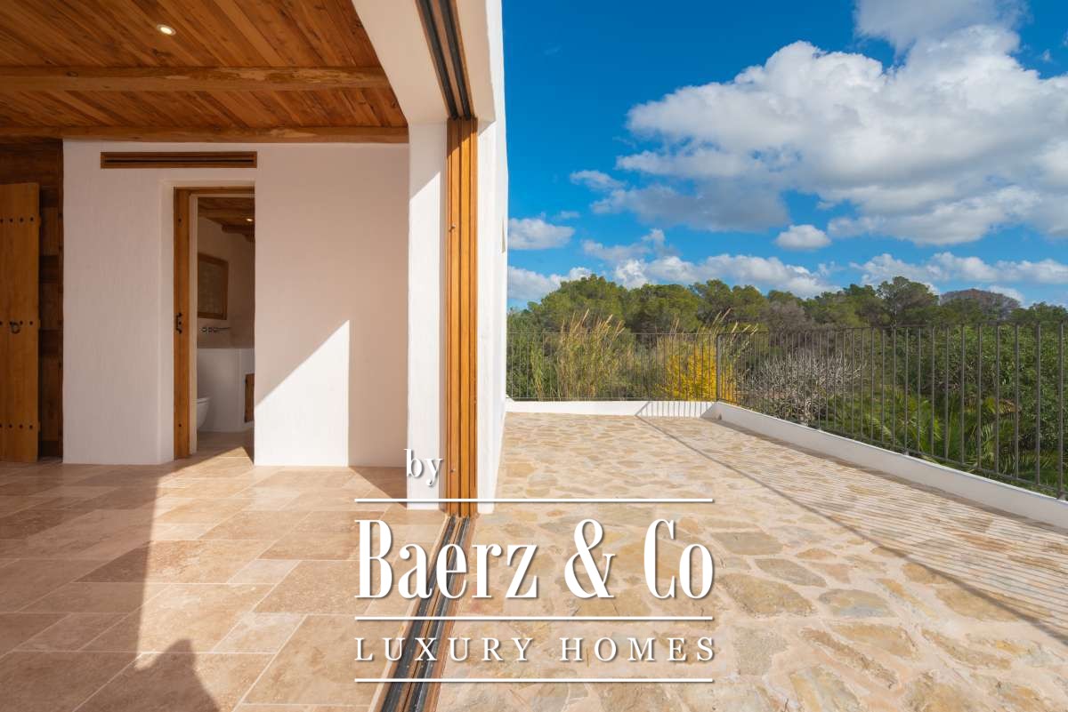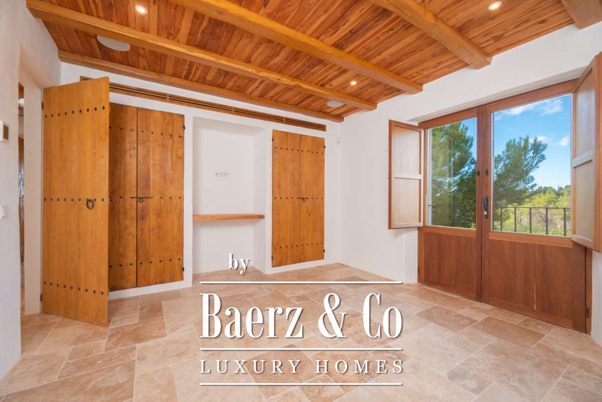 The recently renovated finca blends historic character with contemporary finesse. Every detail of the 620 m² residence, from exposed stone walls to soft, harmonious tones, underlines an enduring elegance. The living areas are open, inviting light and nature into each room, while the seamless integration of kitchen and lounges lends itself to both intimate gatherings and quiet reflection. Six bedrooms and five bathrooms provide refined comfort, with the master suite offering panoramic views and nightly glimpses of Dalt Vila’s illuminated skyline.