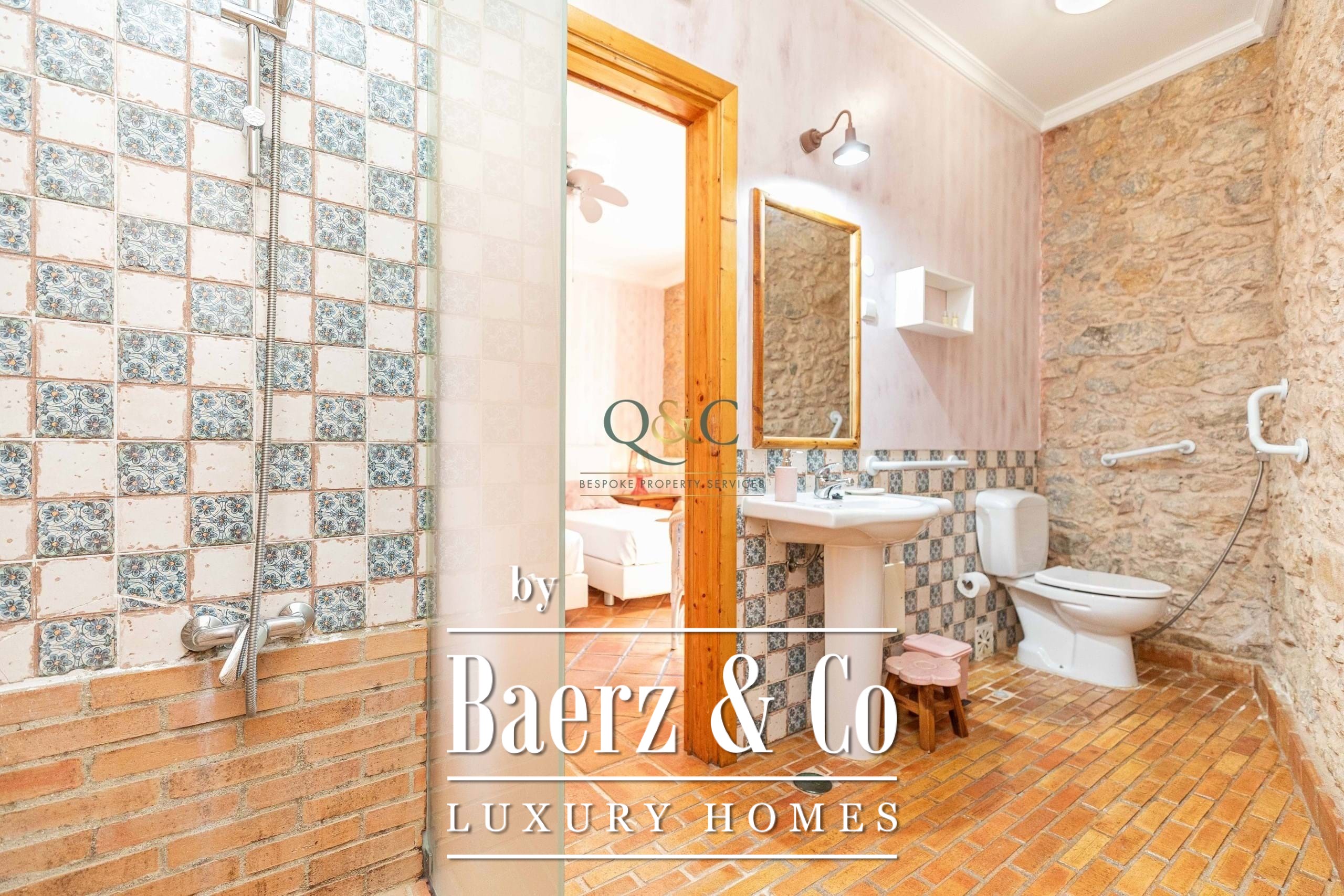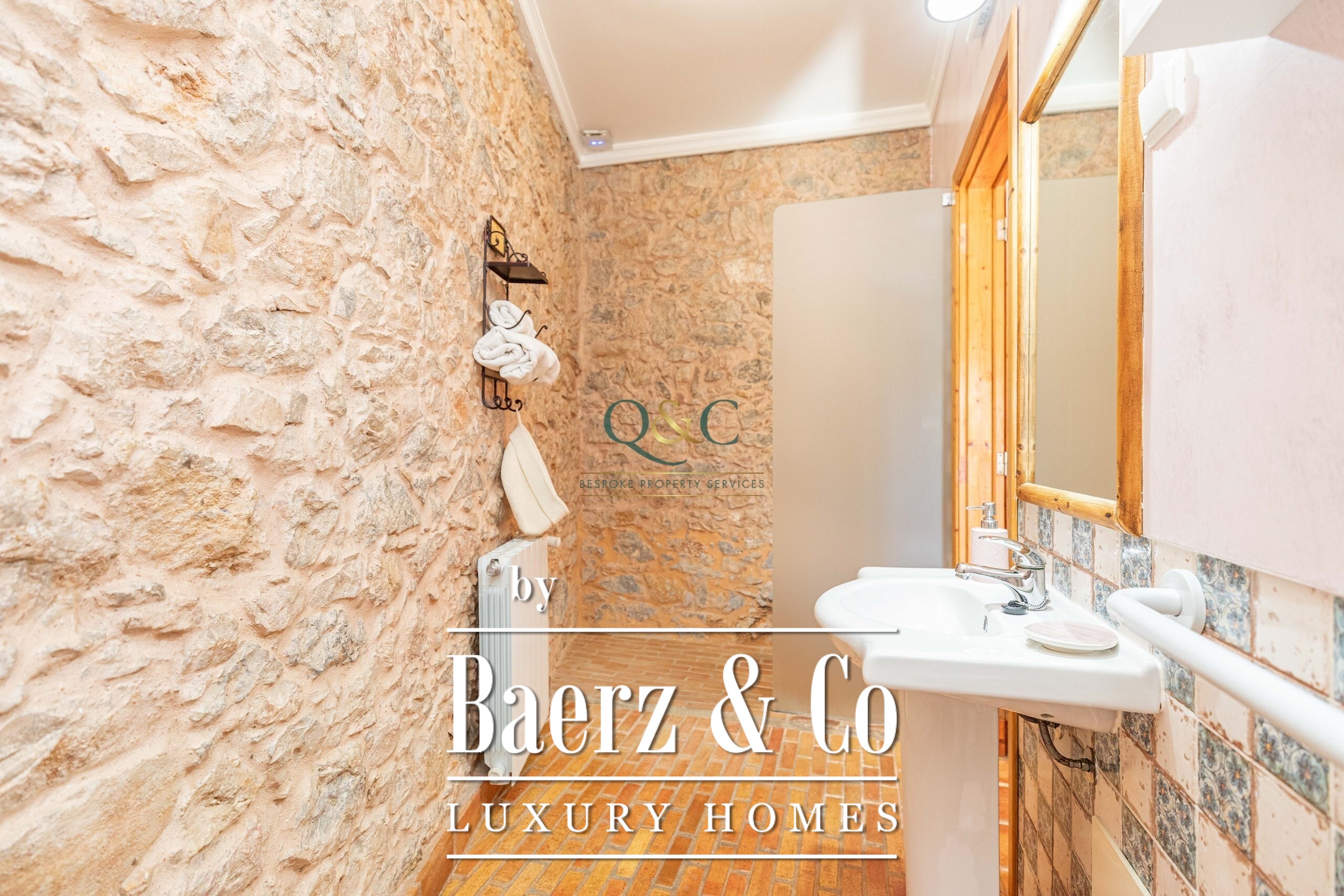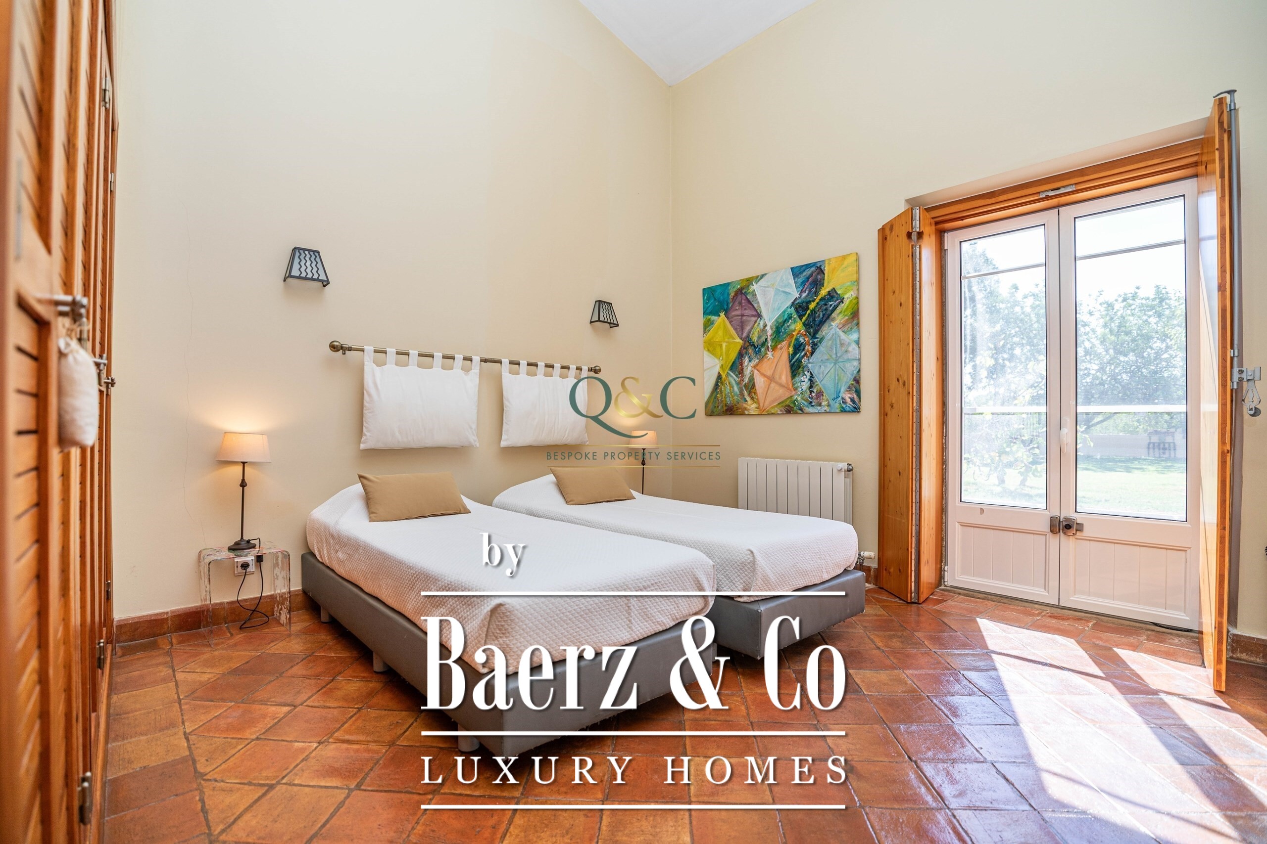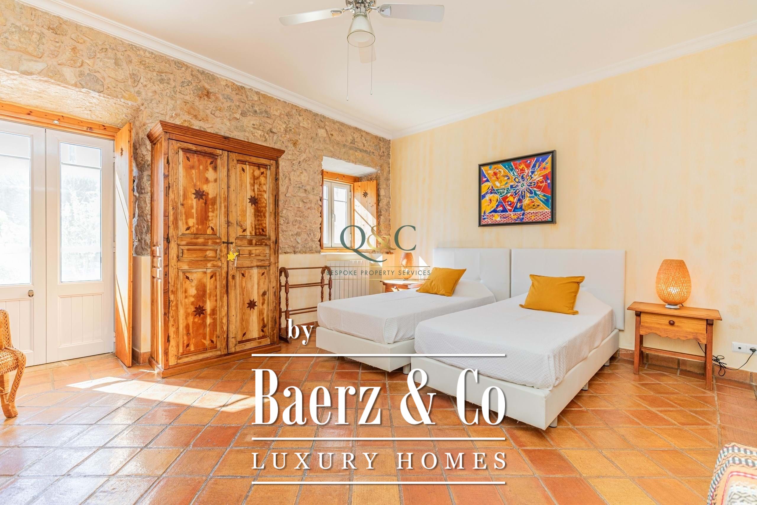 Set on a private 3,603 m² plot, the estate includes 827 m² of living space across two wings. The property features nine bedrooms and nine bathrooms, divided for privacy and flexibility, with each room reflecting the estate’s unique character. High ceilings, natural stone details, and ironwork speak to the architecture’s honest craft, while air conditioning, mains water, and wifi network provide modern amenities. A guest cottage complements the principal residence, offering further accommodation with a private terrace overlooking mature fruit trees.