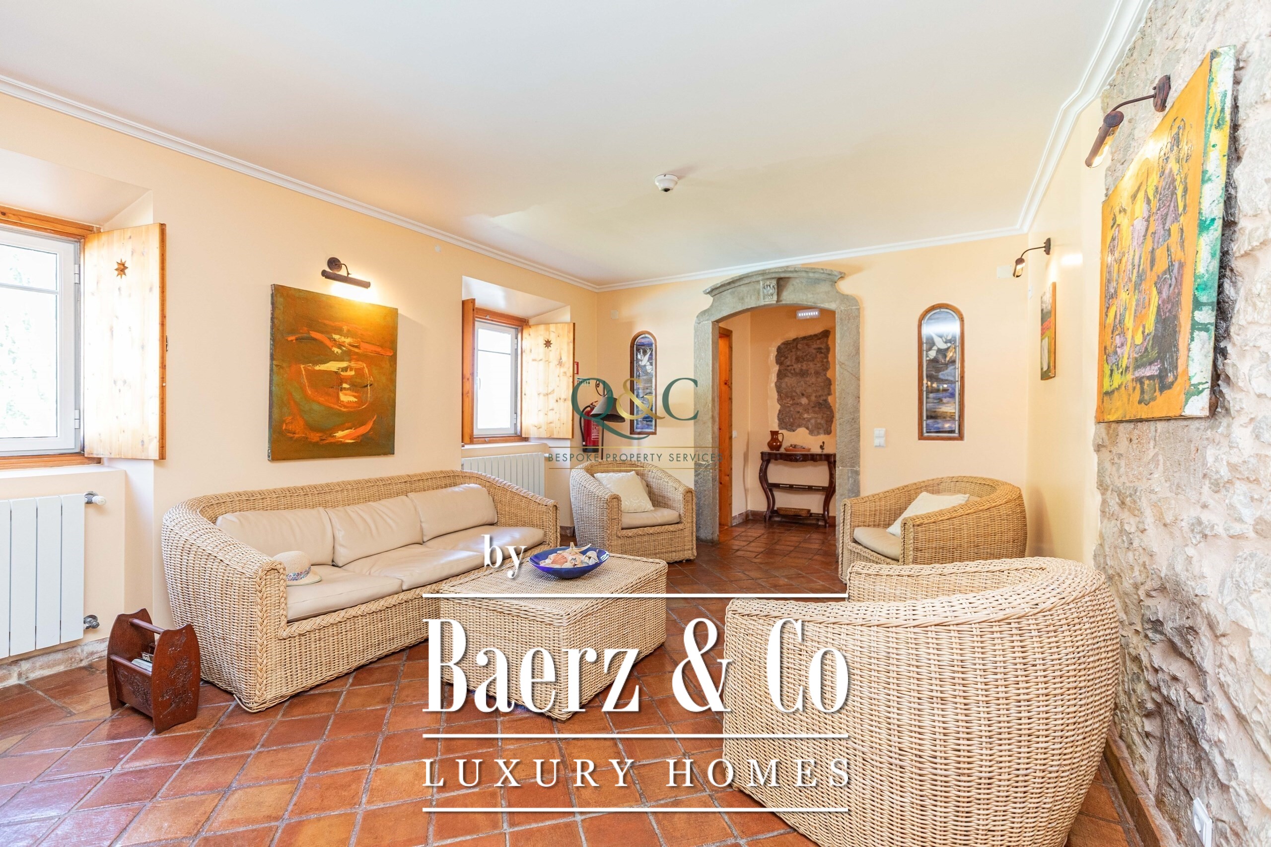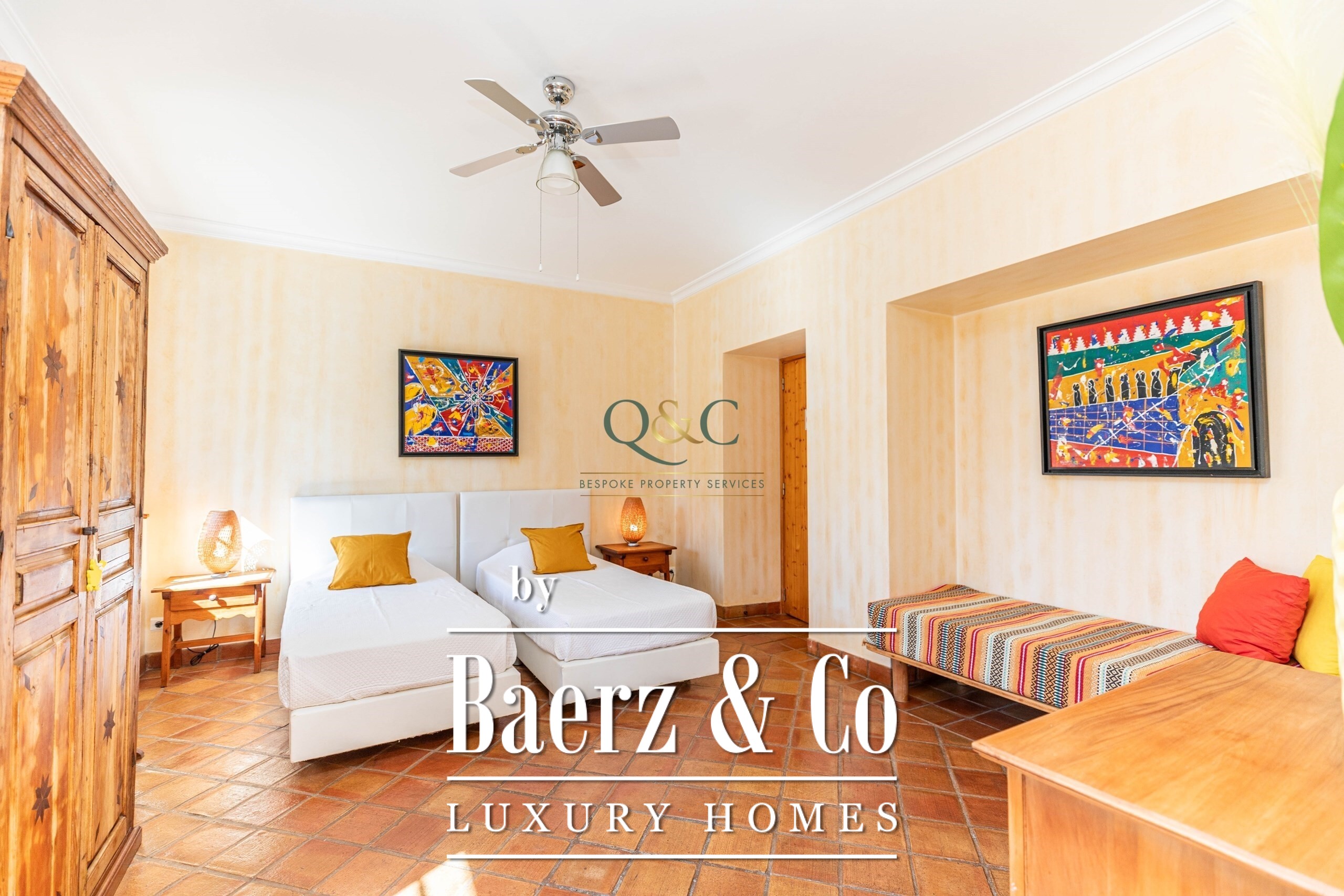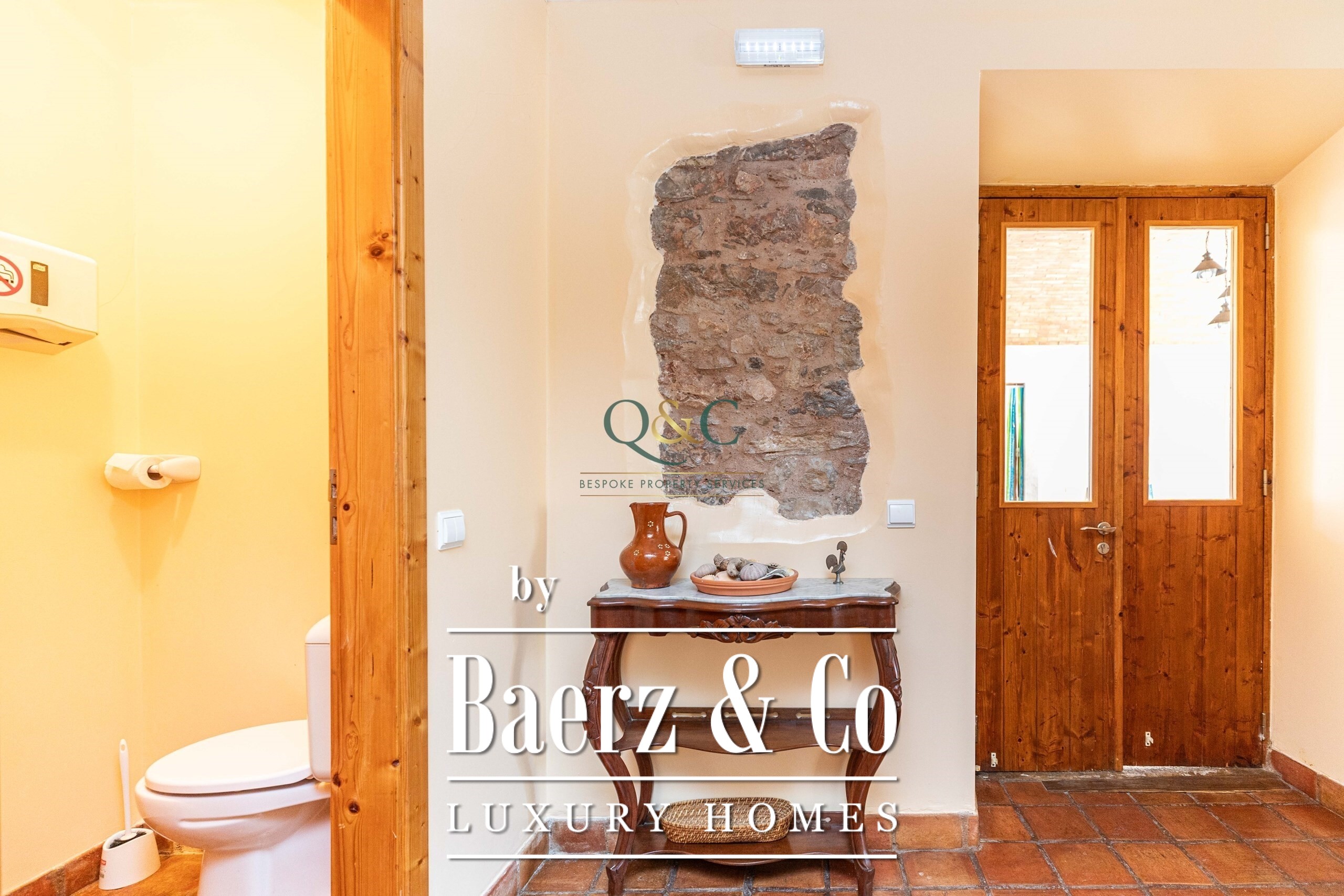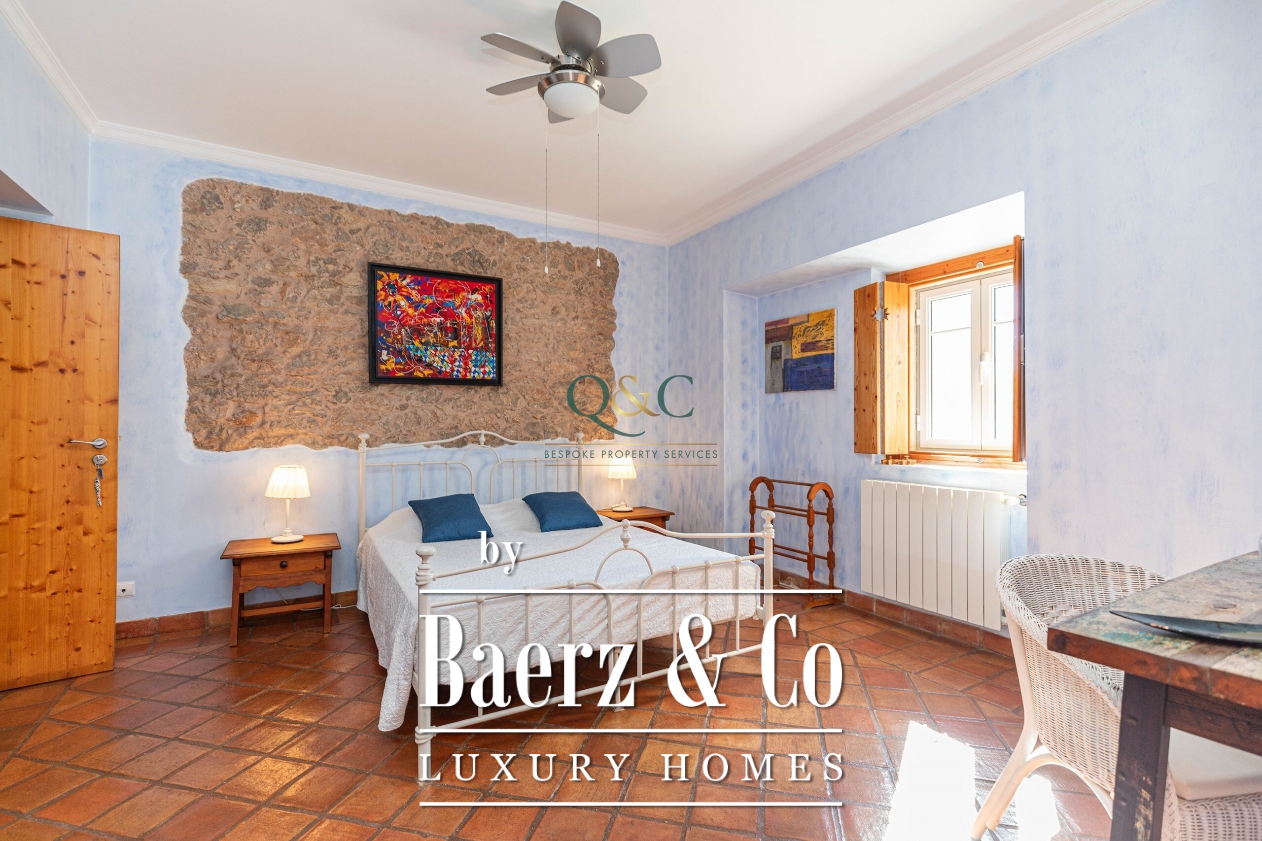 Set on a private 3,603 m² plot, the estate includes 827 m² of living space across two wings. The property features nine bedrooms and nine bathrooms, divided for privacy and flexibility, with each room reflecting the estate’s unique character. High ceilings, natural stone details, and ironwork speak to the architecture’s honest craft, while air conditioning, mains water, and wifi network provide modern amenities. A guest cottage complements the principal residence, offering further accommodation with a private terrace overlooking mature fruit trees.