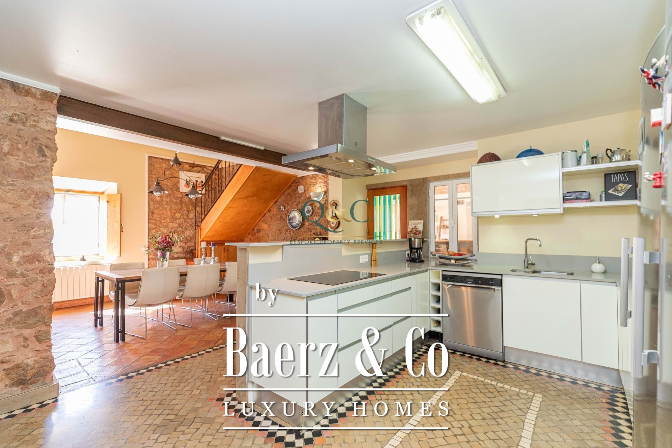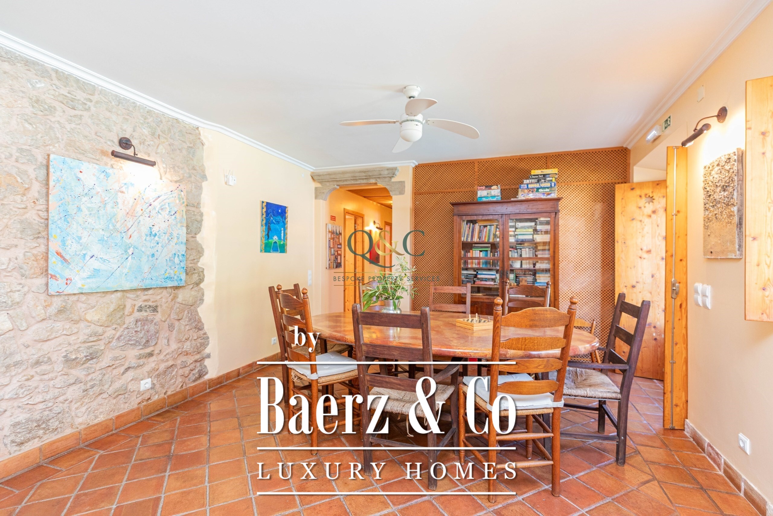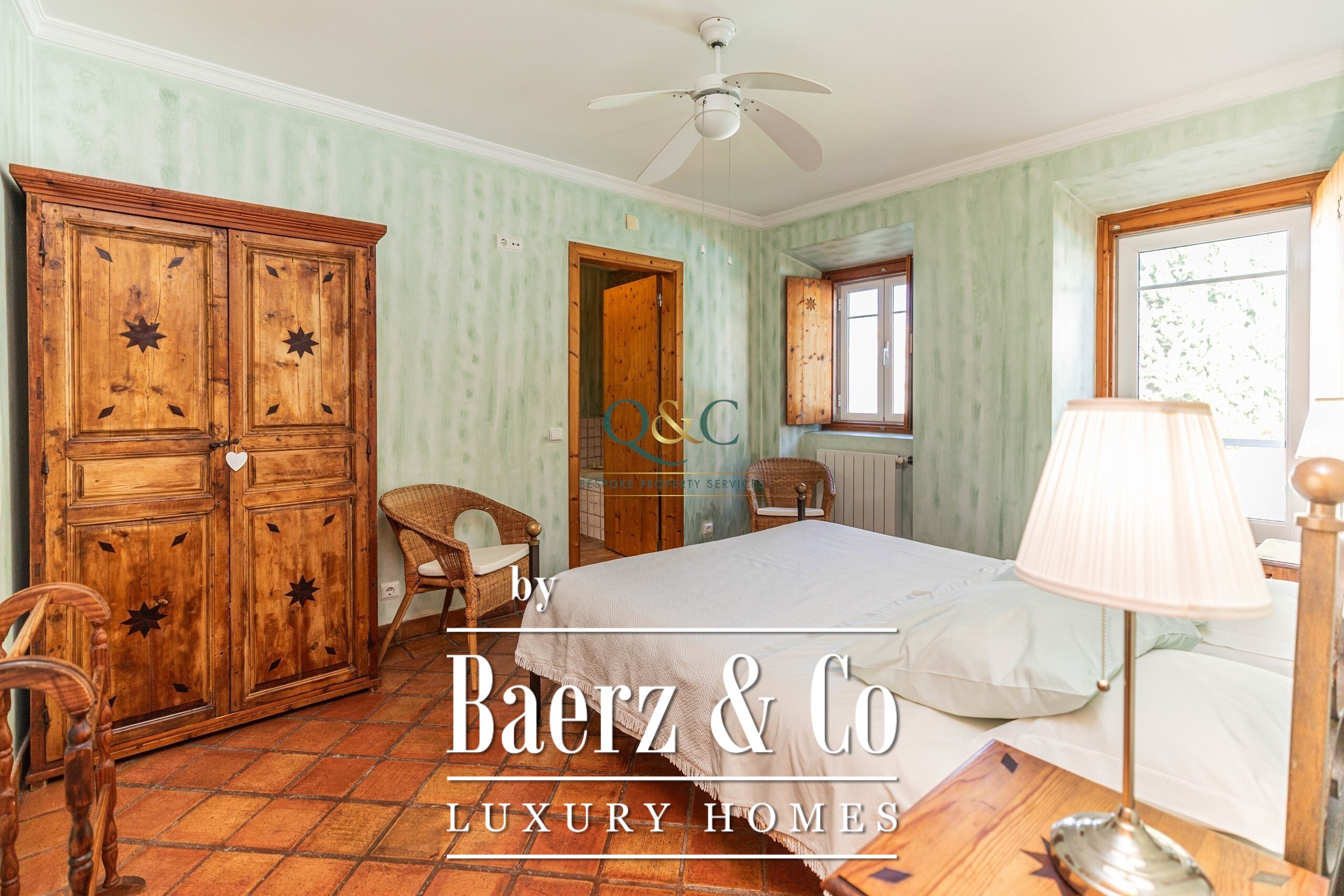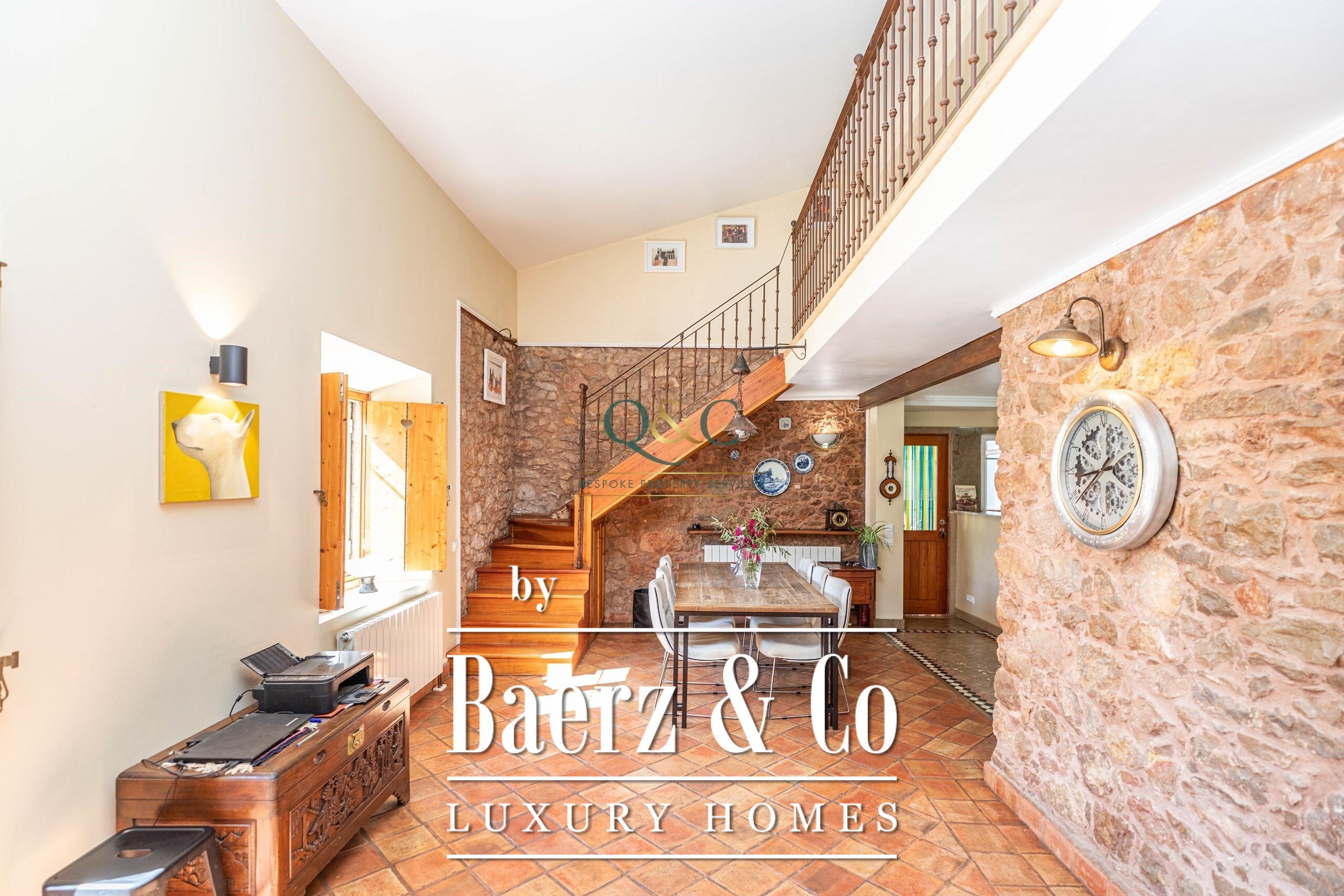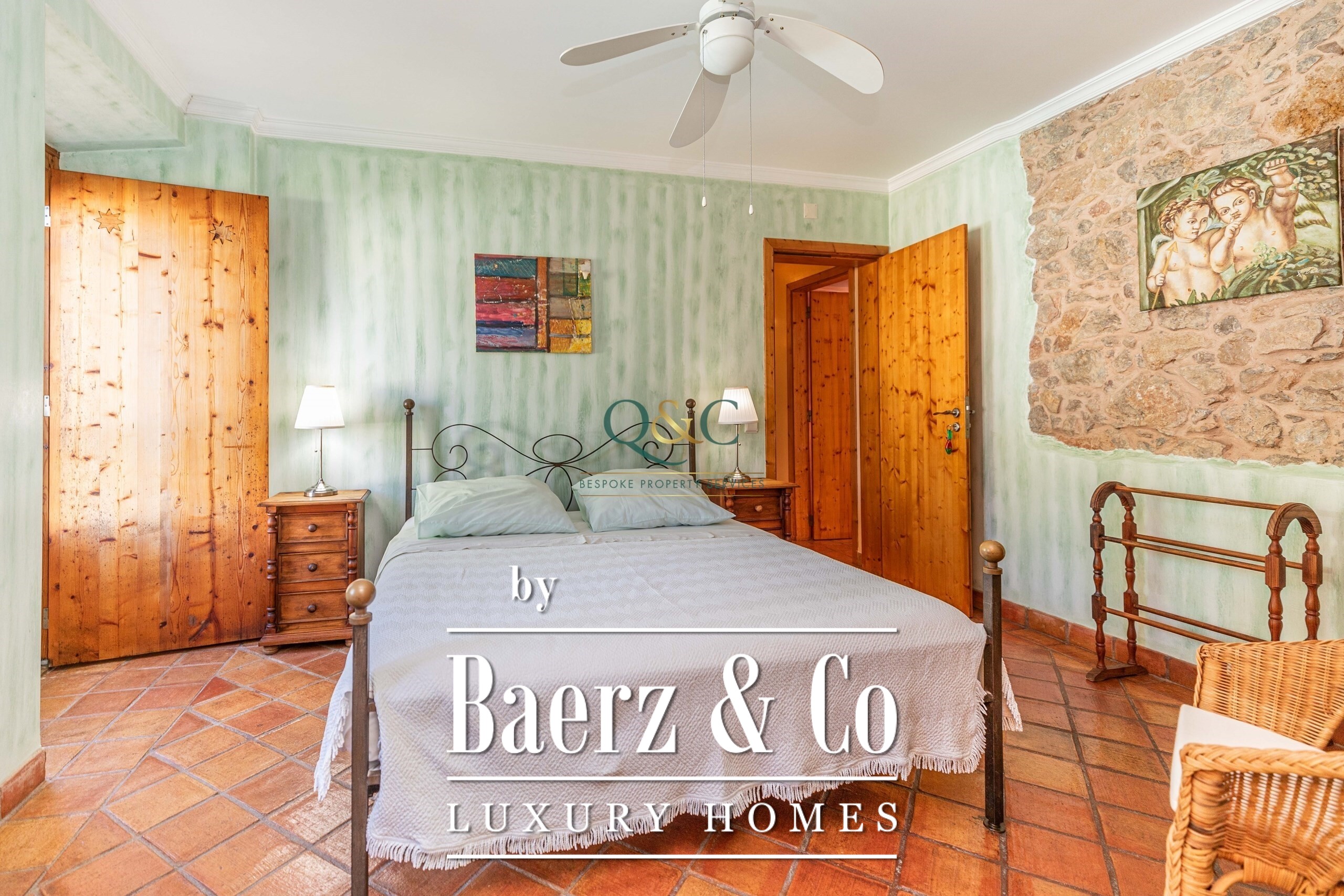 Set on a private 3,603 m² plot, the estate includes 827 m² of living space across two wings. The property features nine bedrooms and nine bathrooms, divided for privacy and flexibility, with each room reflecting the estate’s unique character. High ceilings, natural stone details, and ironwork speak to the architecture’s honest craft, while air conditioning, mains water, and wifi network provide modern amenities. A guest cottage complements the principal residence, offering further accommodation with a private terrace overlooking mature fruit trees.
